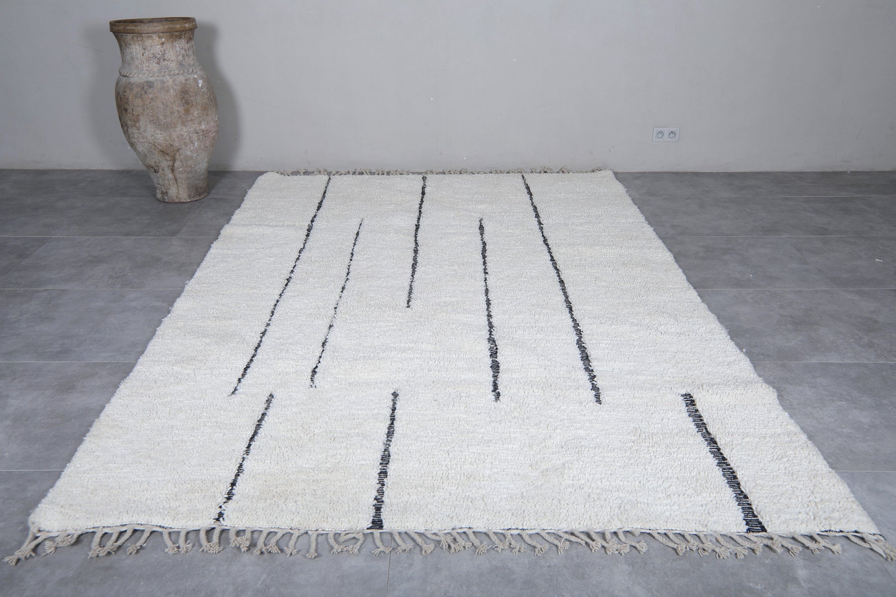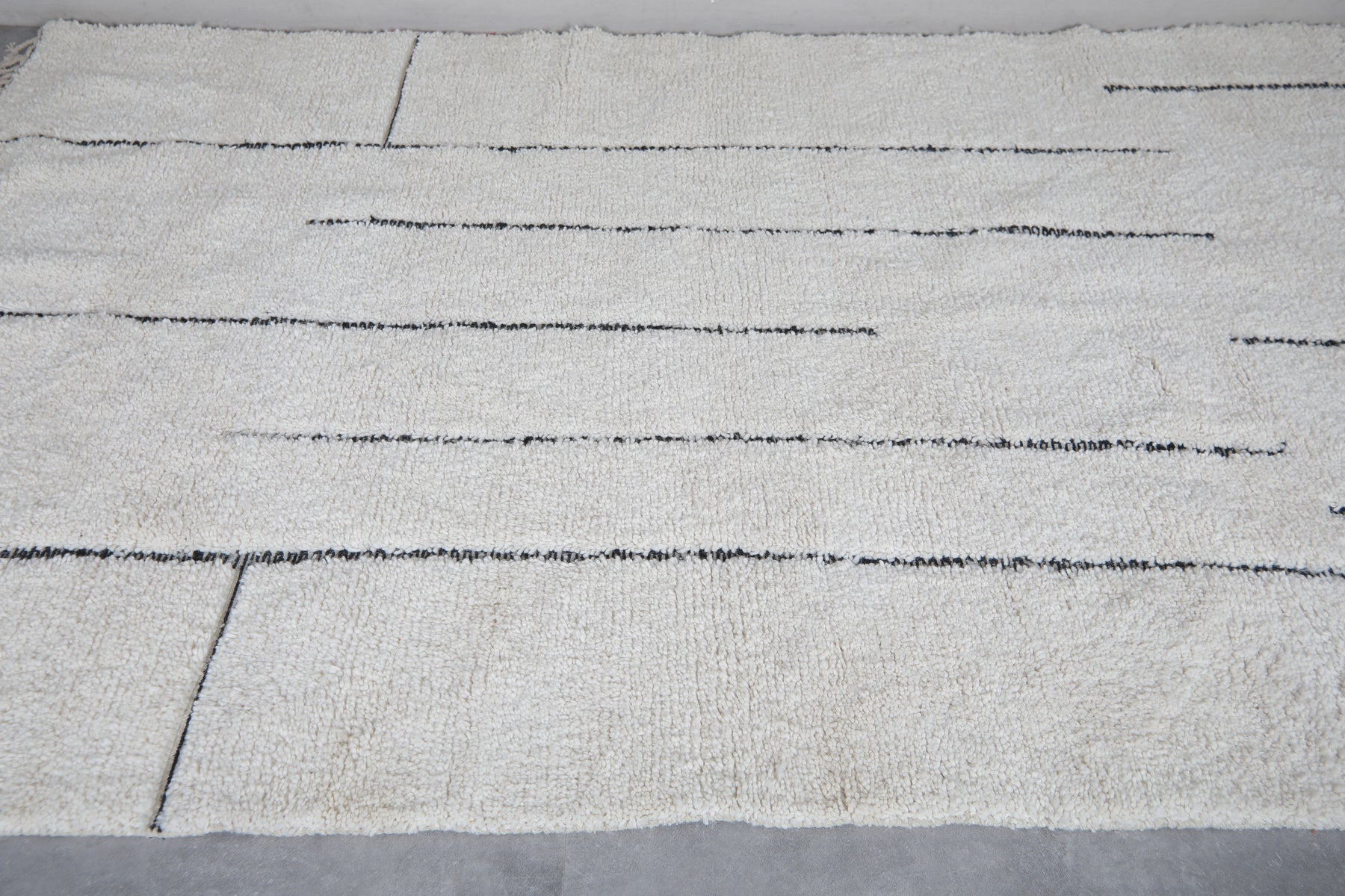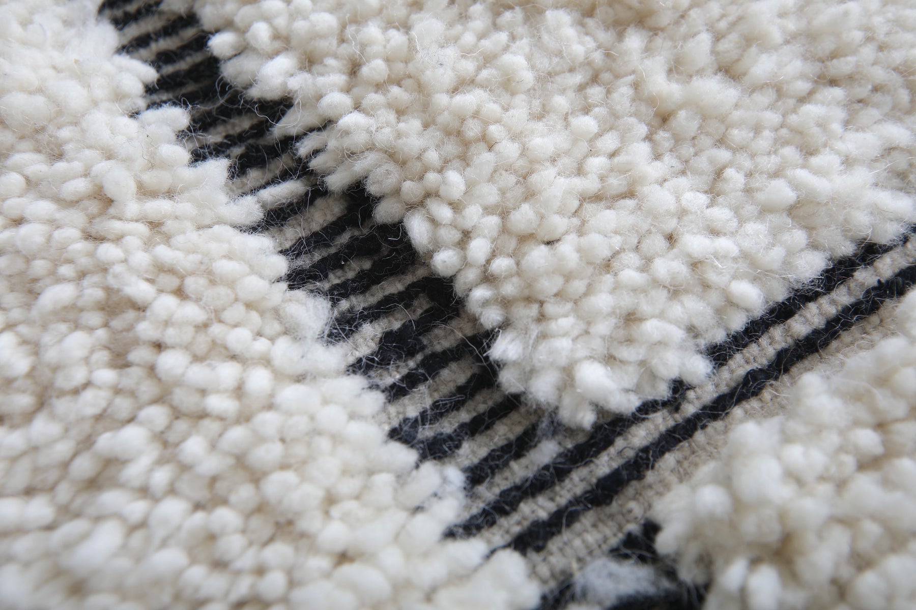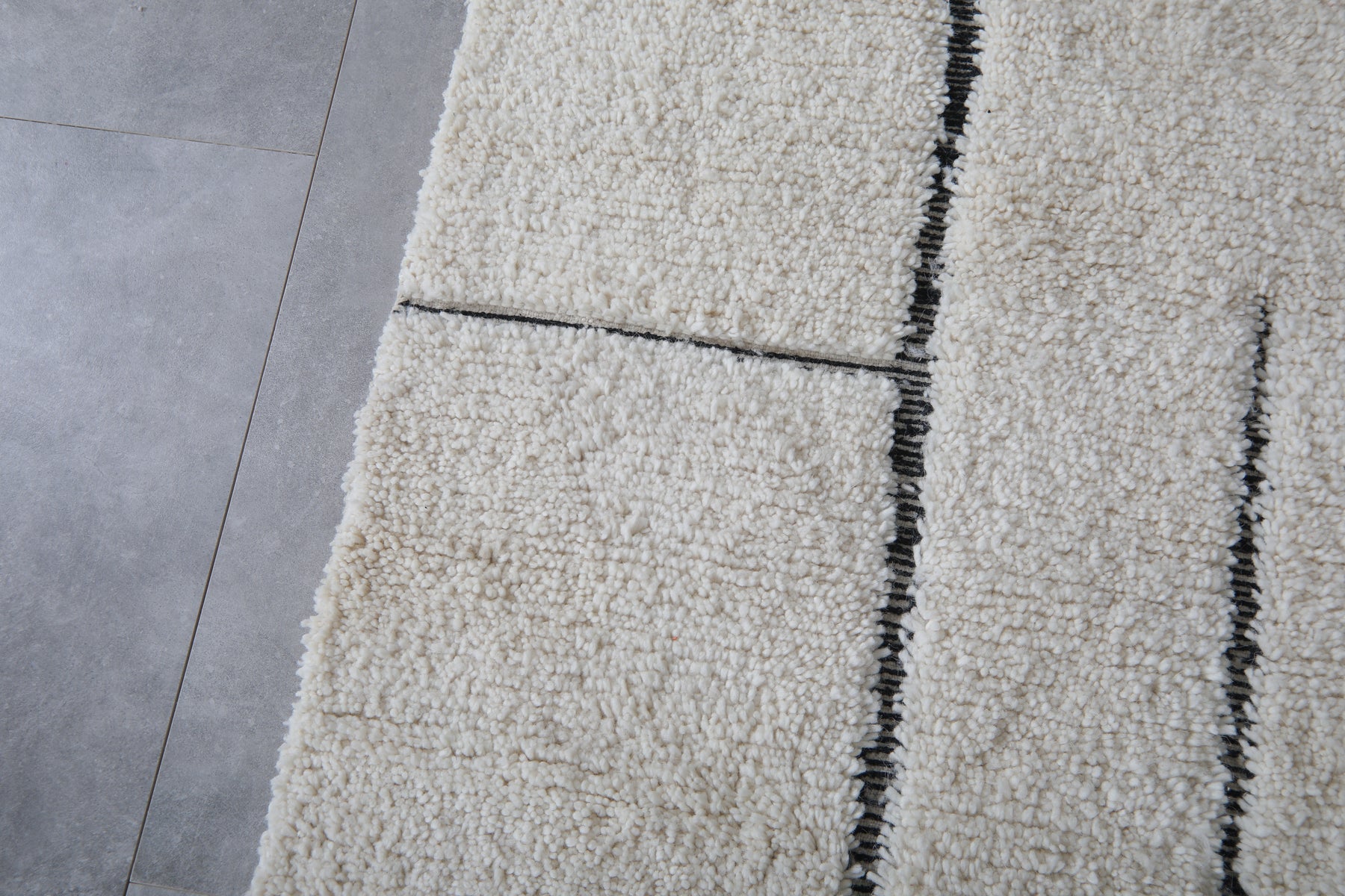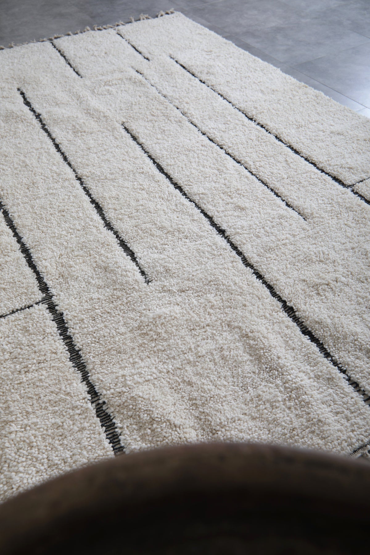 This Moroccan rug showcases a modern minimalist design with a crisp white background and bold black lines. Expertly handwoven from 100% wool, it offers both durability and luxurious softness underfoot. The simple yet striking linear pattern adds a contemporary touch, making it a perfect addition to Scandinavian, boho, or modern interiors. Ideal for living rooms, bedrooms, or home offices, this rug brings warmth, texture, and style to any space. Its timeless black and white palette allows for versatile styling, effortlessly complementing both neutral tones and vibrant accents in your décor.