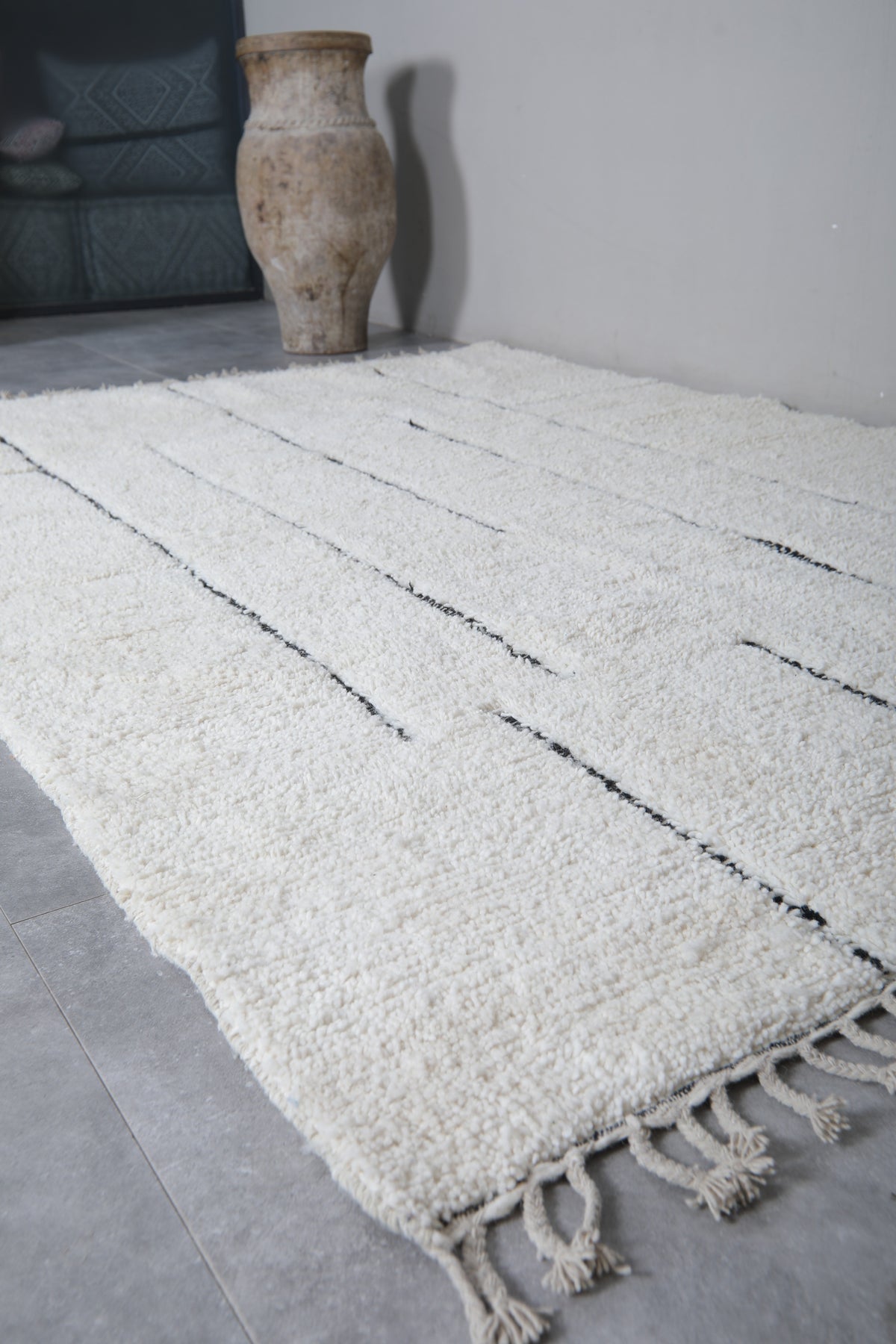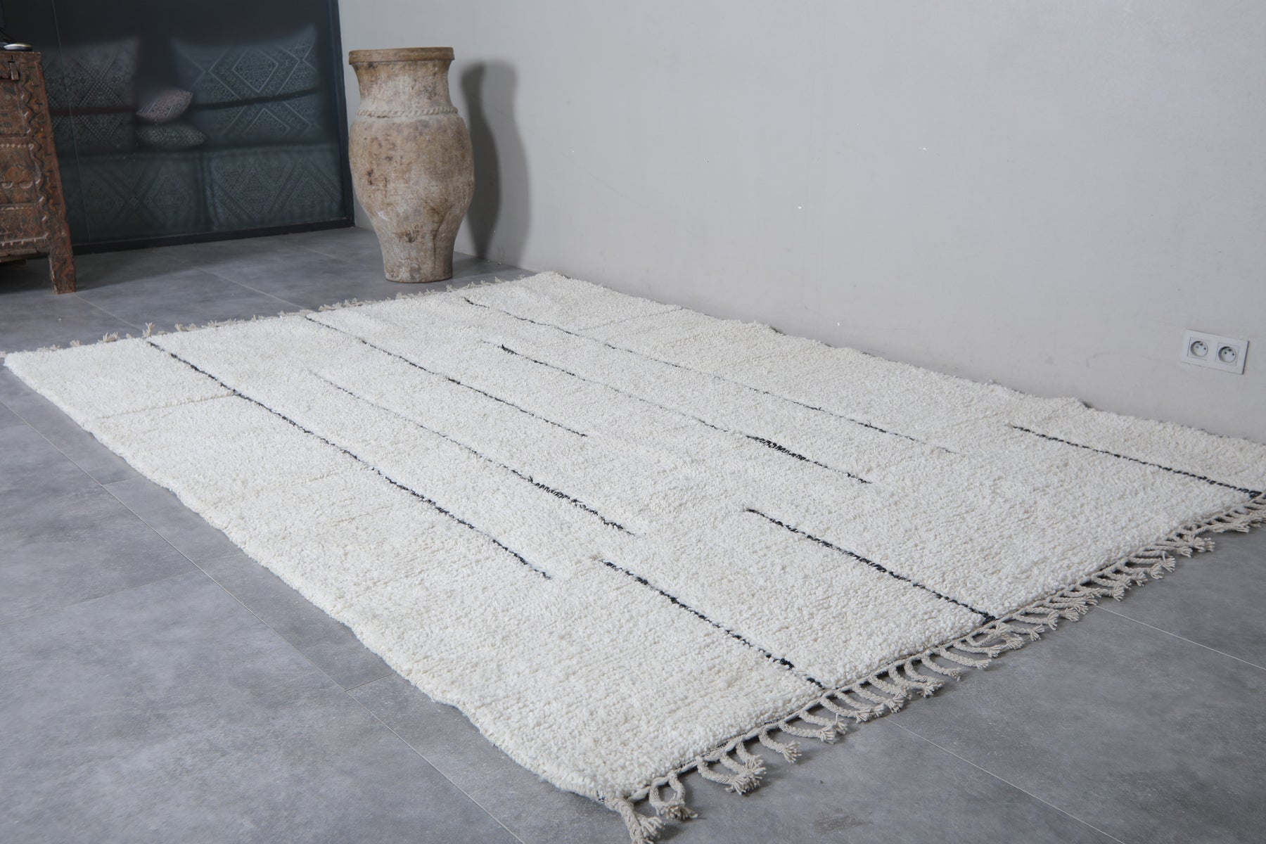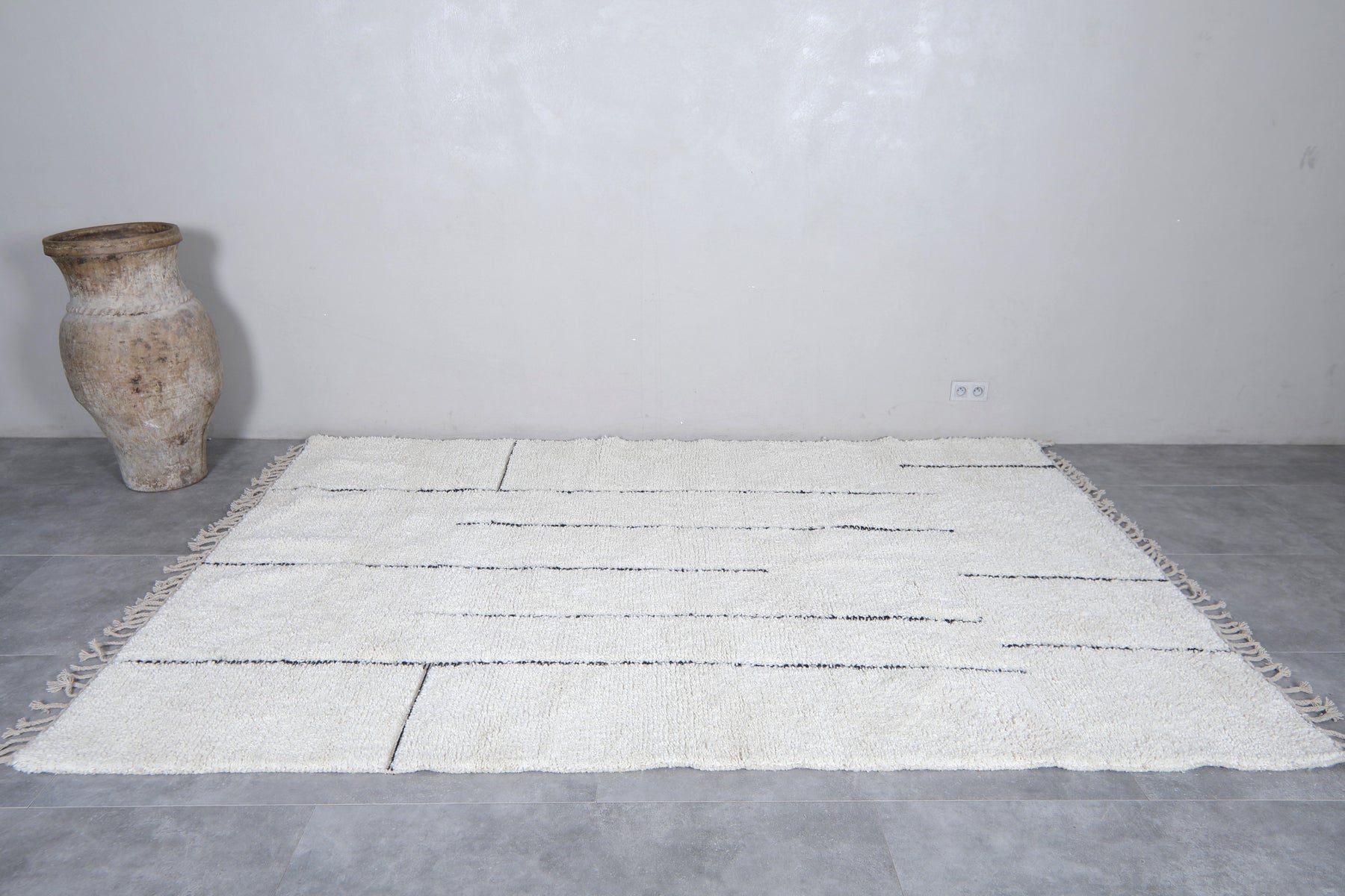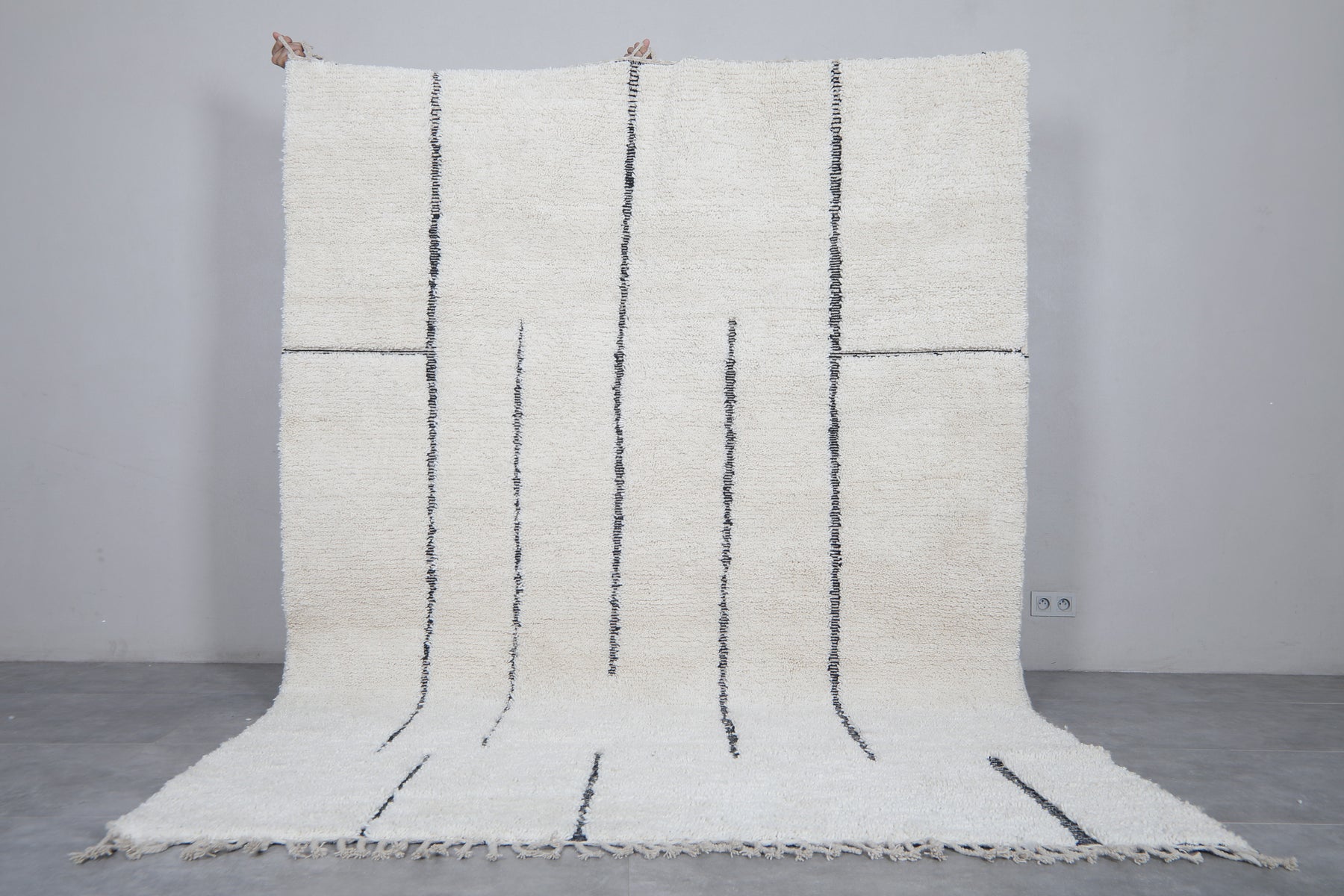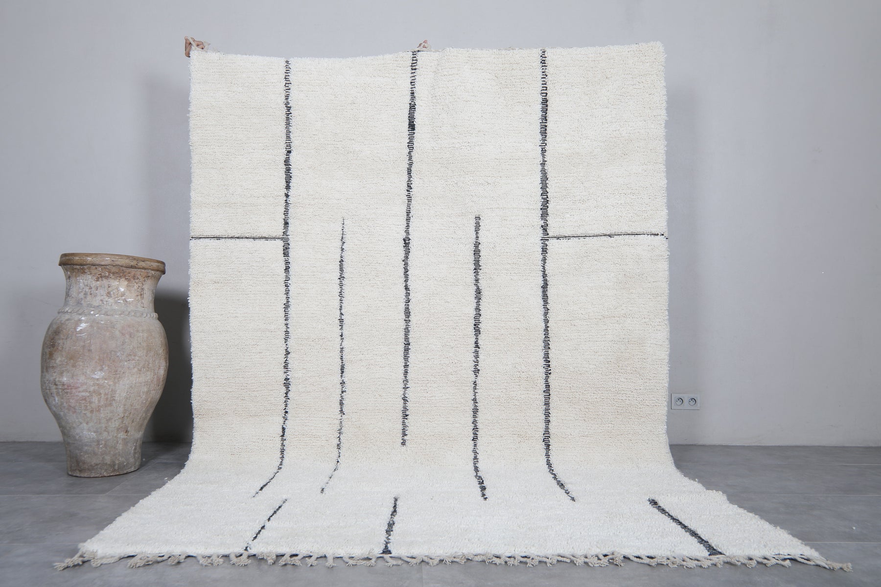 This Moroccan rug showcases a modern minimalist design with a crisp white background and bold black lines. Expertly handwoven from 100% wool, it offers both durability and luxurious softness underfoot. The simple yet striking linear pattern adds a contemporary touch, making it a perfect addition to Scandinavian, boho, or modern interiors. Ideal for living rooms, bedrooms, or home offices, this rug brings warmth, texture, and style to any space. Its timeless black and white palette allows for versatile styling, effortlessly complementing both neutral tones and vibrant accents in your décor.