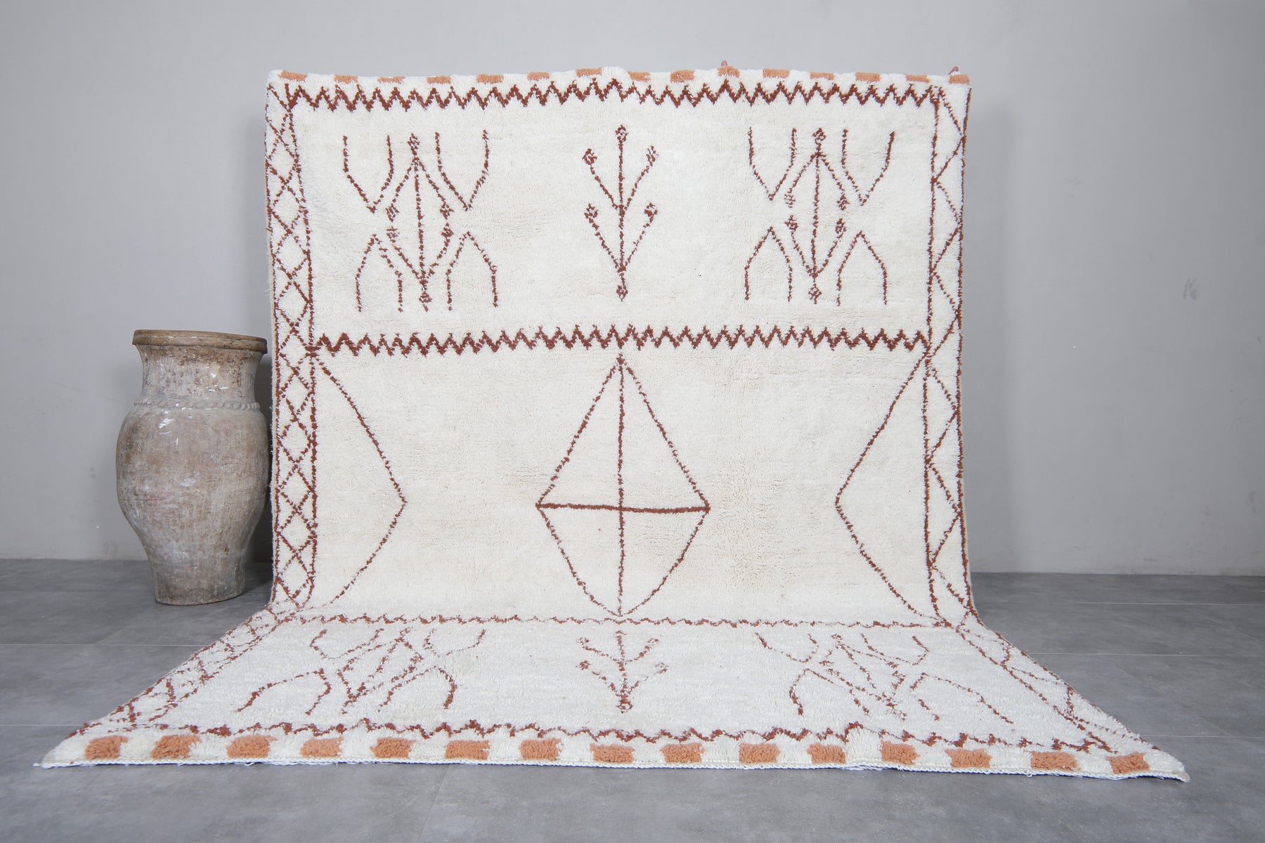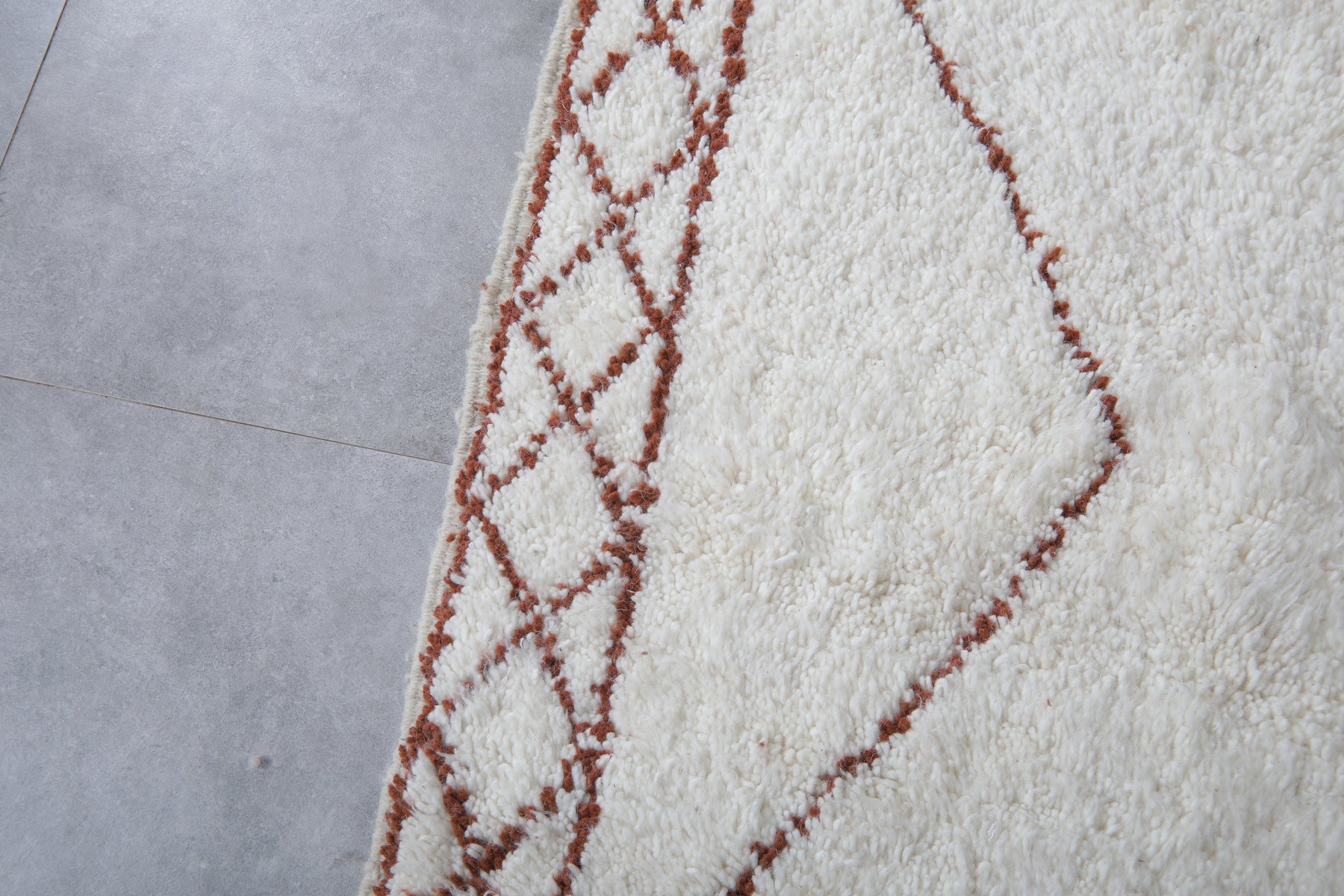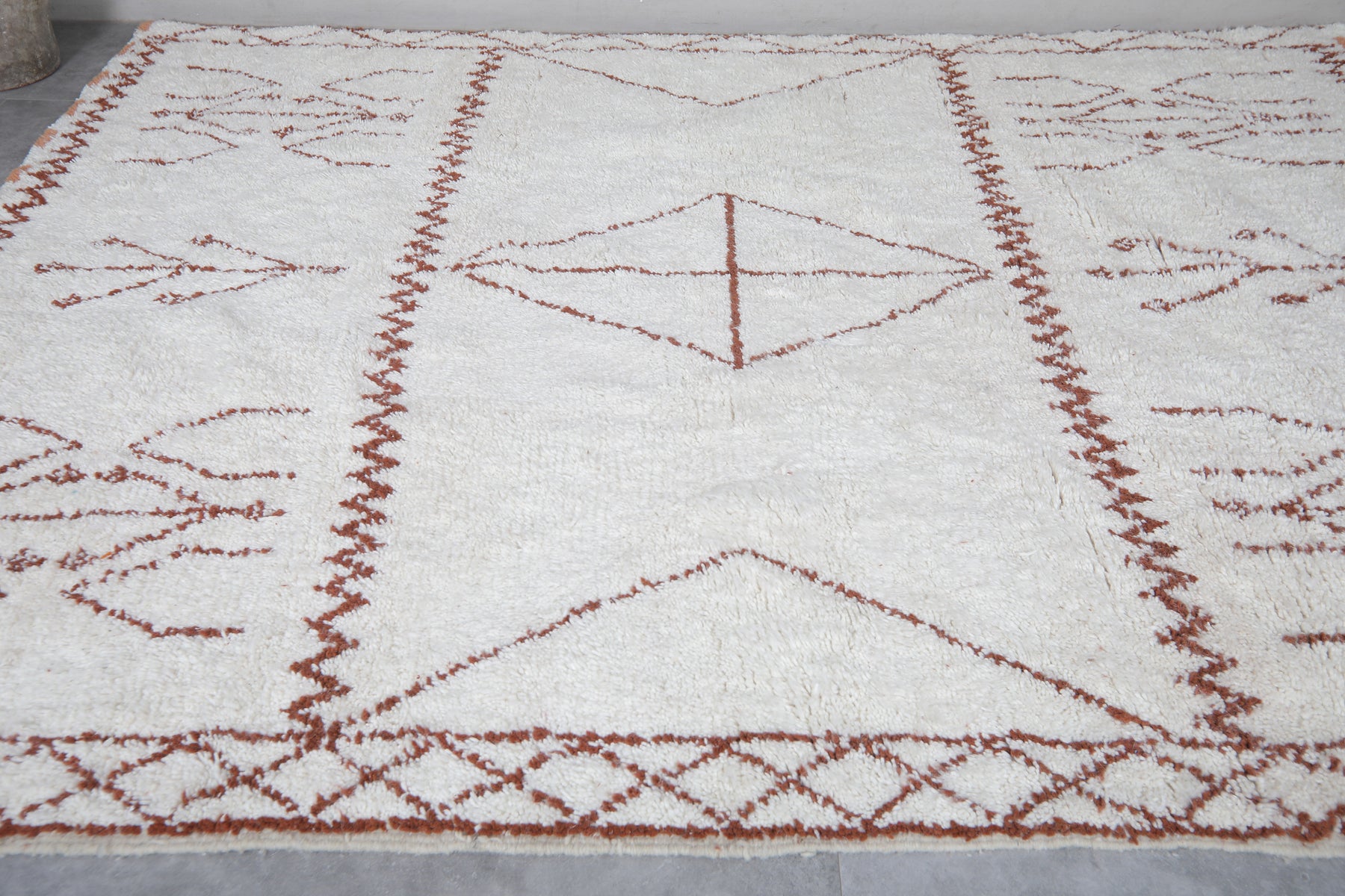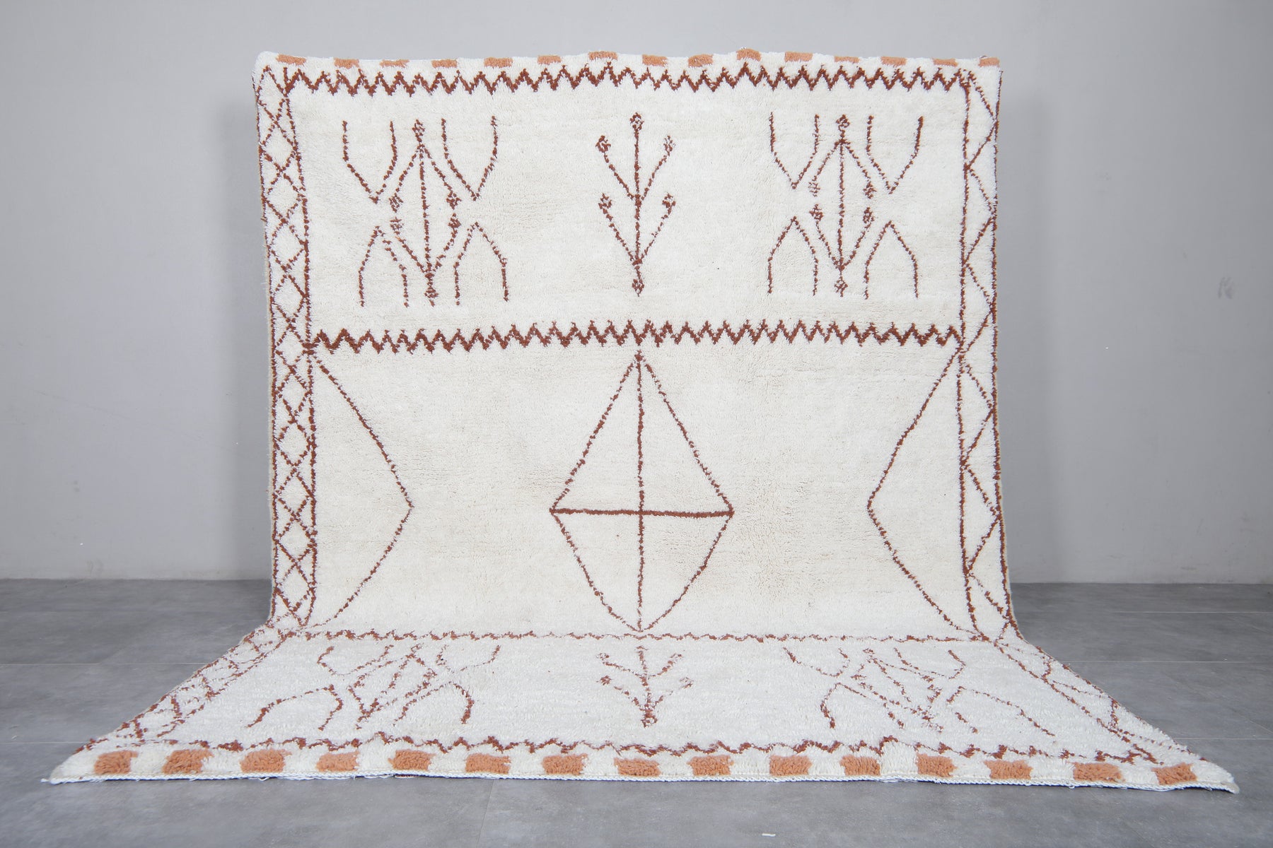This hand‑woven Moroccan wool rug features an white base carefully accented with rust‑brown tribal motifs and a subtle two‑tone border. The rich yet neutral palette brings warmth and authenticity to living areas, bedrooms, or creative spaces. With its traditional artisan craftsmanship and minimalist design, this rug combines modern elegance with timeless appeal. Ideal for bohemian, or eclectic interiors, it’s available in custom sizes to significantly elevate your décor.