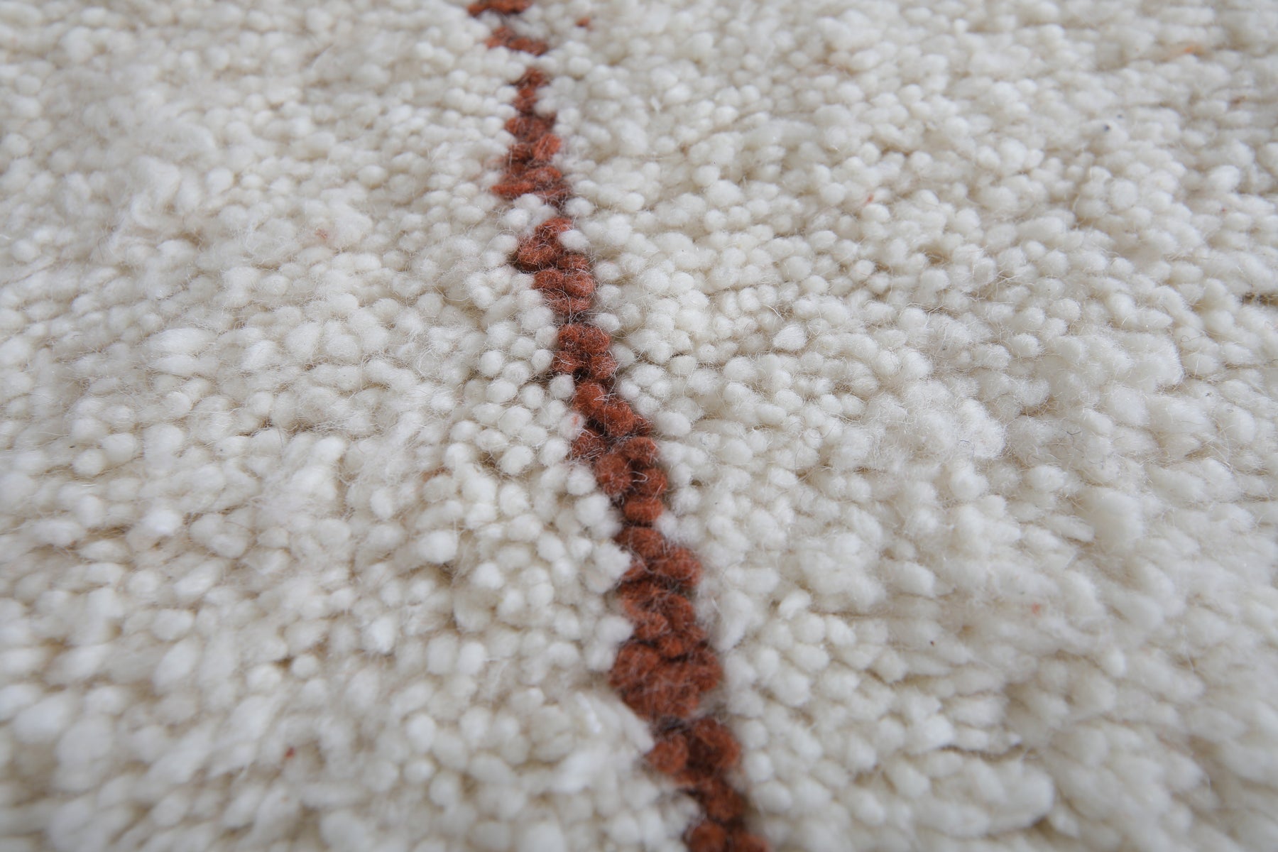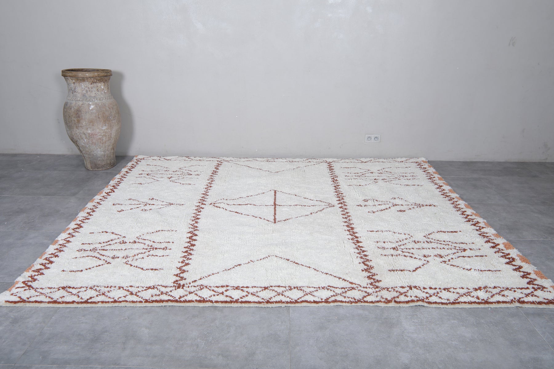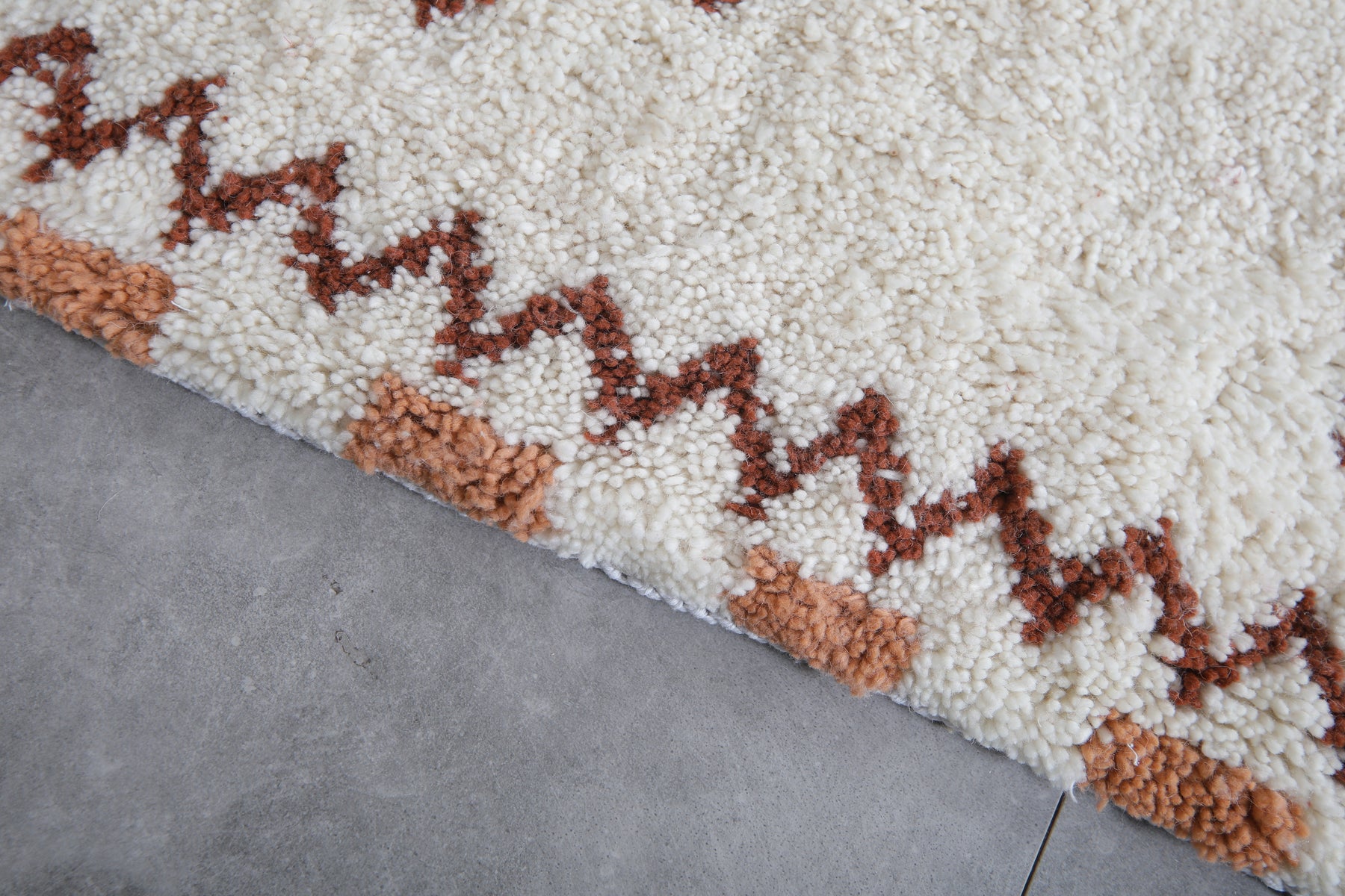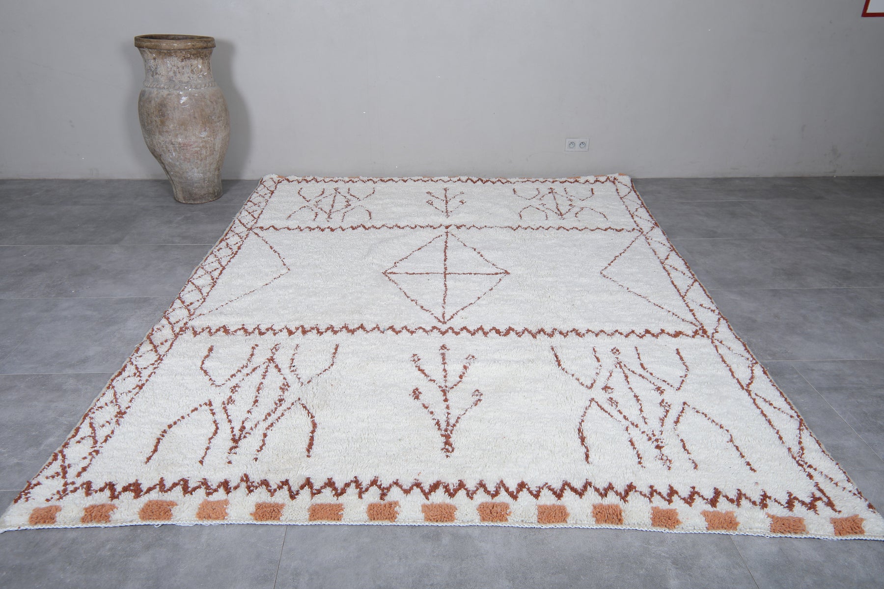 This hand‑woven Moroccan wool rug features an white base carefully accented with rust‑brown tribal motifs and a subtle two‑tone border. The rich yet neutral palette brings warmth and authenticity to living areas, bedrooms, or creative spaces. With its traditional artisan craftsmanship and minimalist design, this rug combines modern elegance with timeless appeal. Ideal for bohemian, or eclectic interiors, it’s available in custom sizes to significantly elevate your décor.