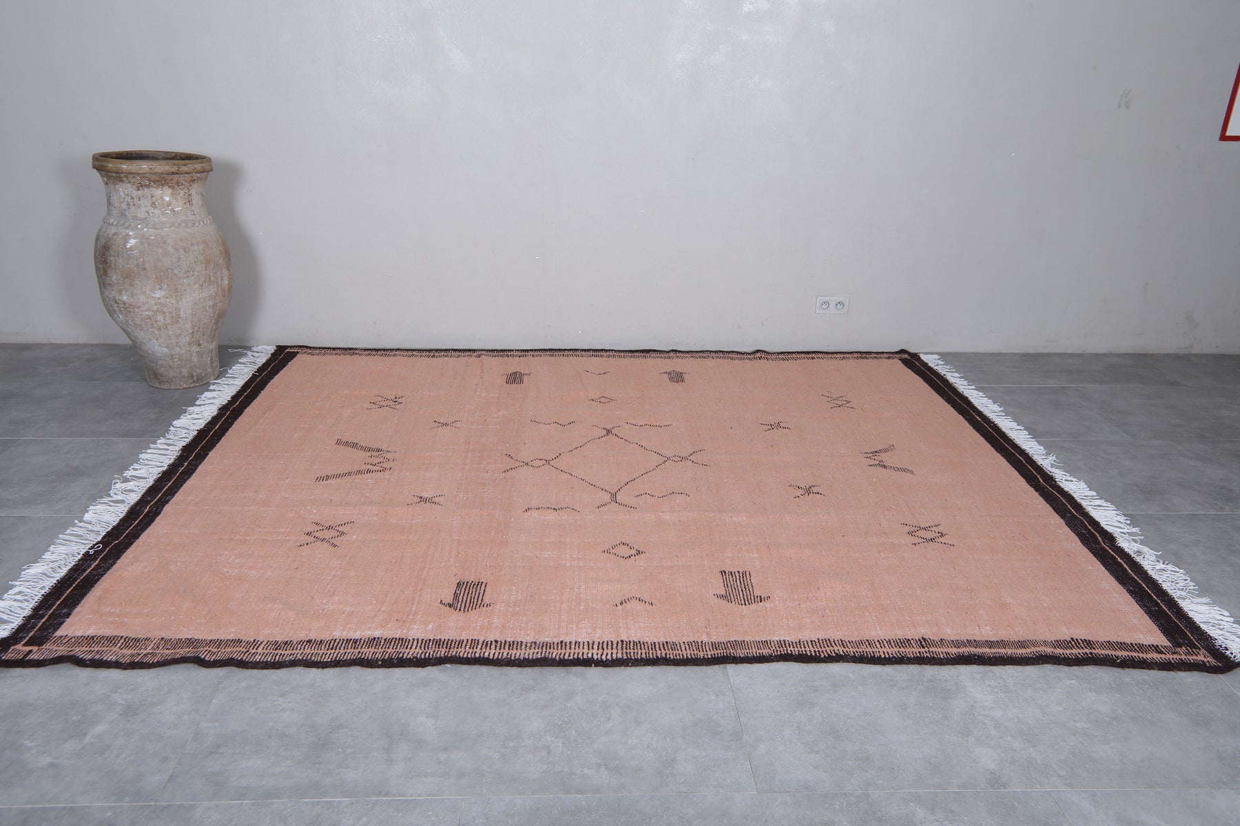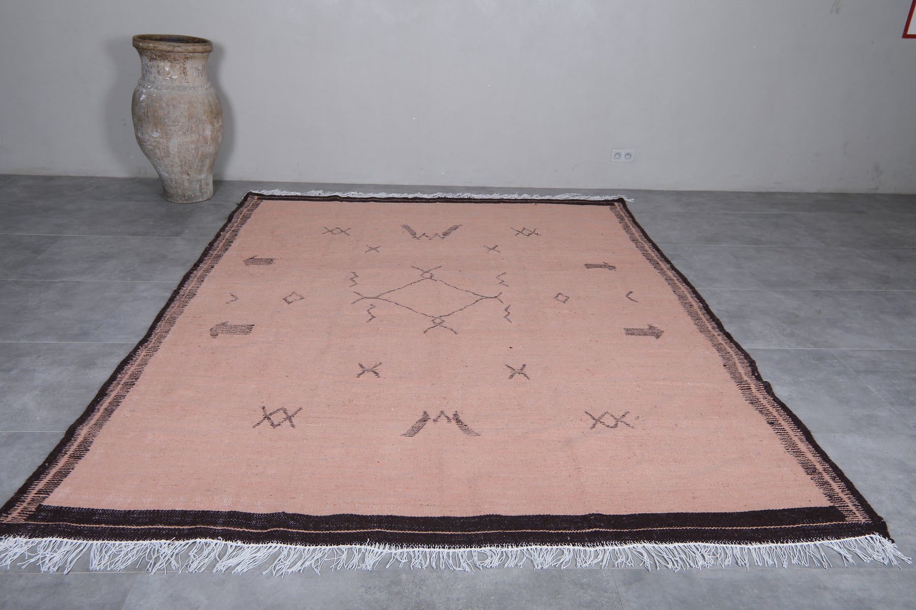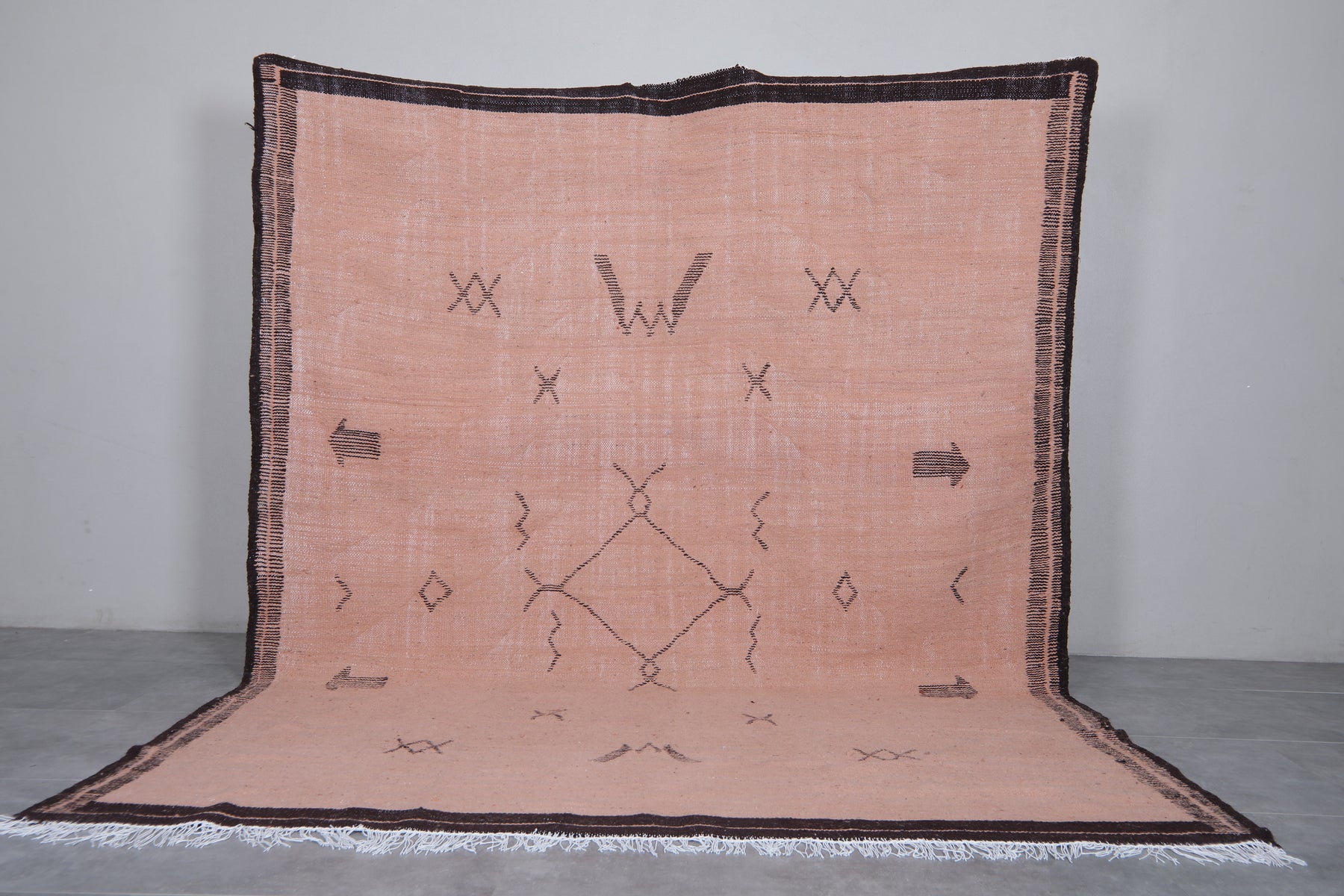 Add a touch of tribal charm with this handwoven pink flatwoven rug, adorned with bold black geometric motifs. Inspired by traditional Moroccan Berber patterns, this artisan rug offers a lightweight, low-pile texture perfect for layering or standalone styling. A versatile accent piece for modern, boho, or eclectic decor.
