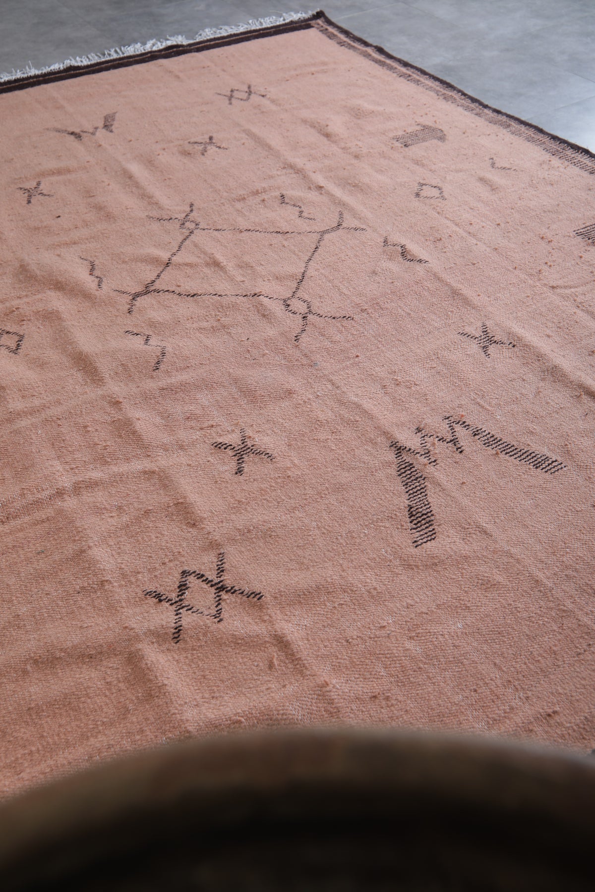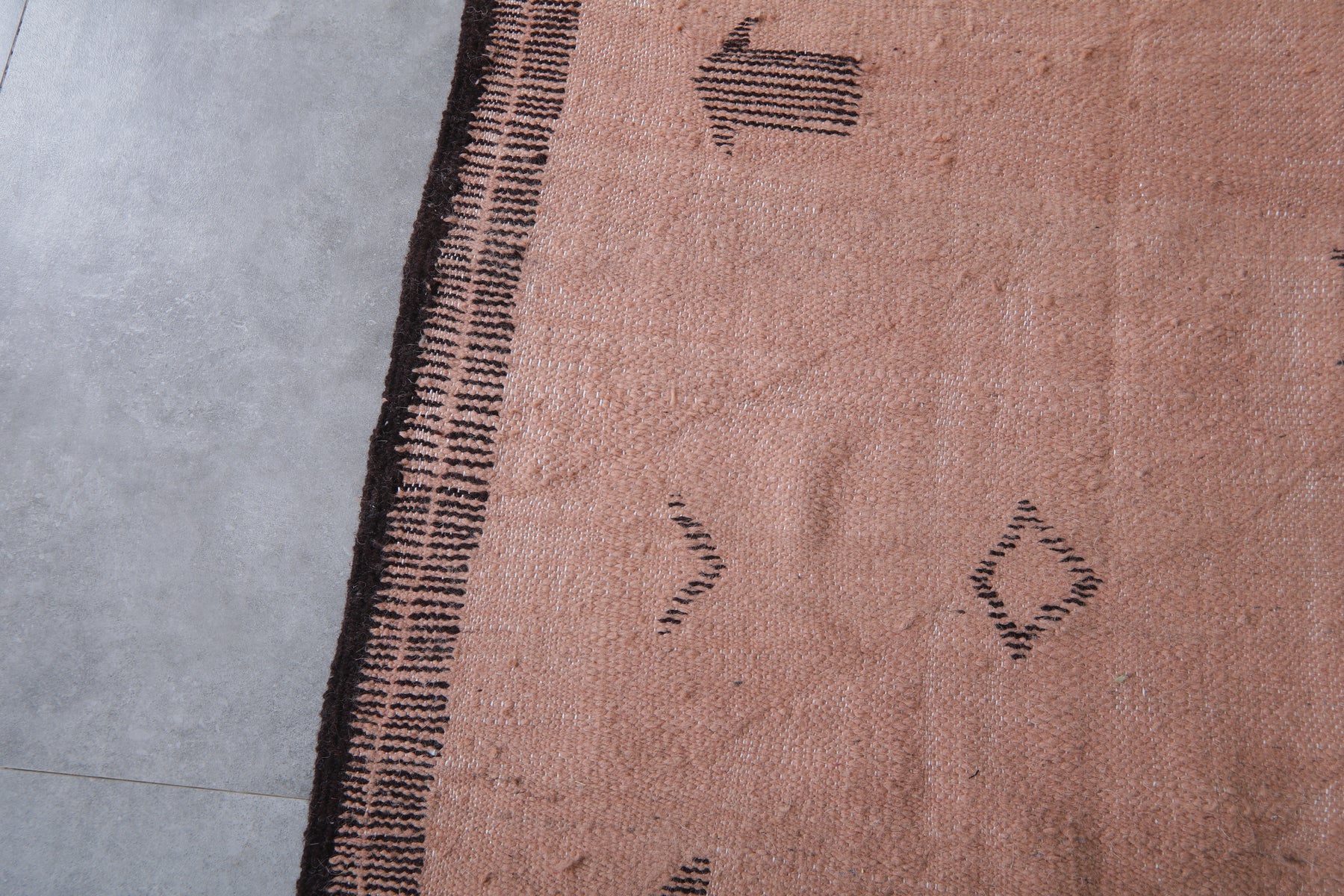 Custom pink Moroccan flatweave rug with black geometric tribal design