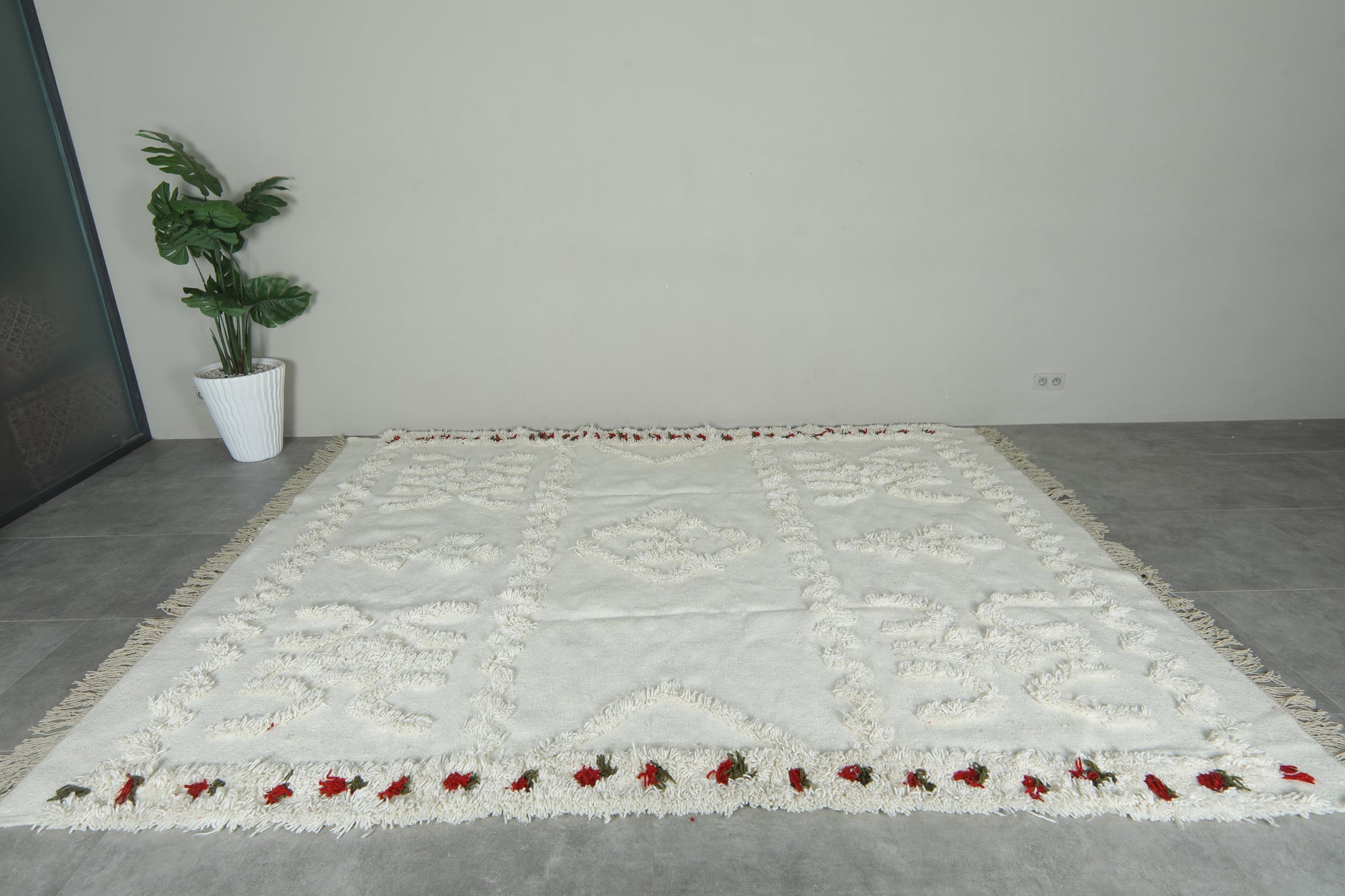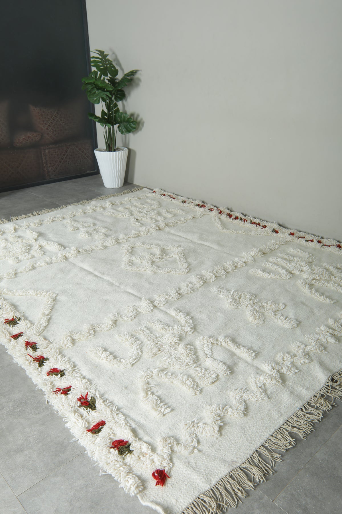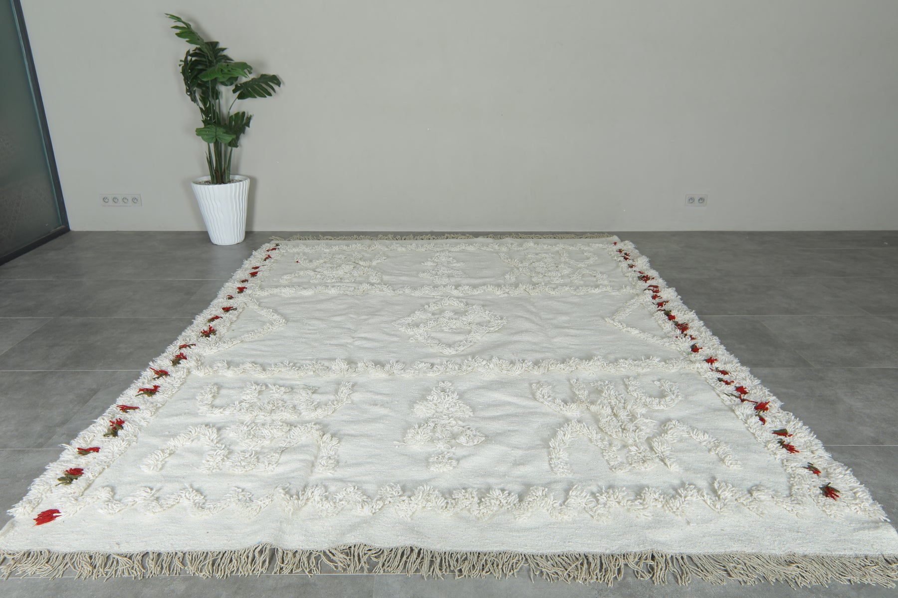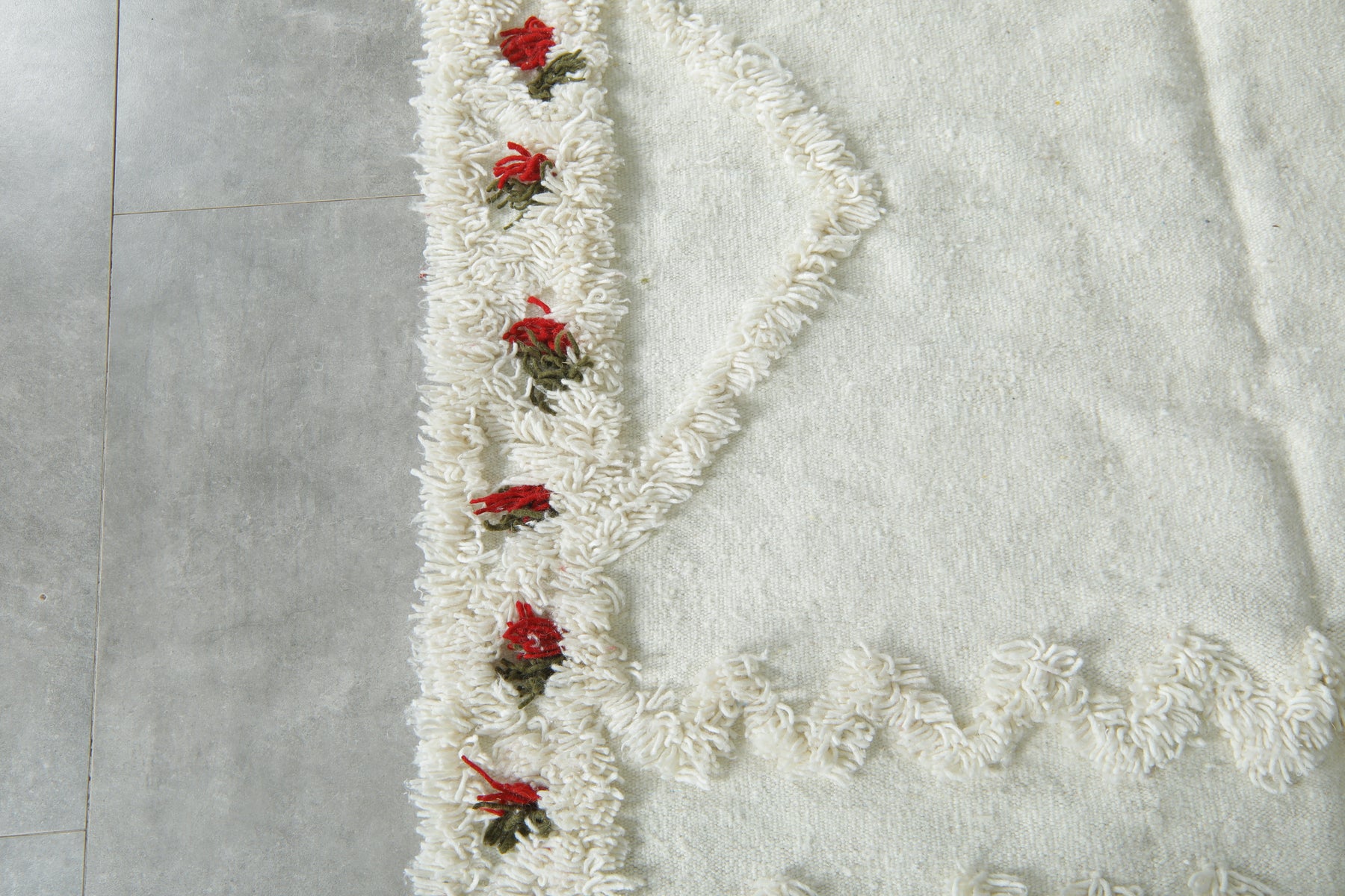 This handmade Moroccan Kilim rug combines minimalist elegance with artisanal detail. Woven in pure white wool, it features subtle textured tribal motifs and delicate red rose accents along the borders, blending traditional craftsmanship with refined artistry.