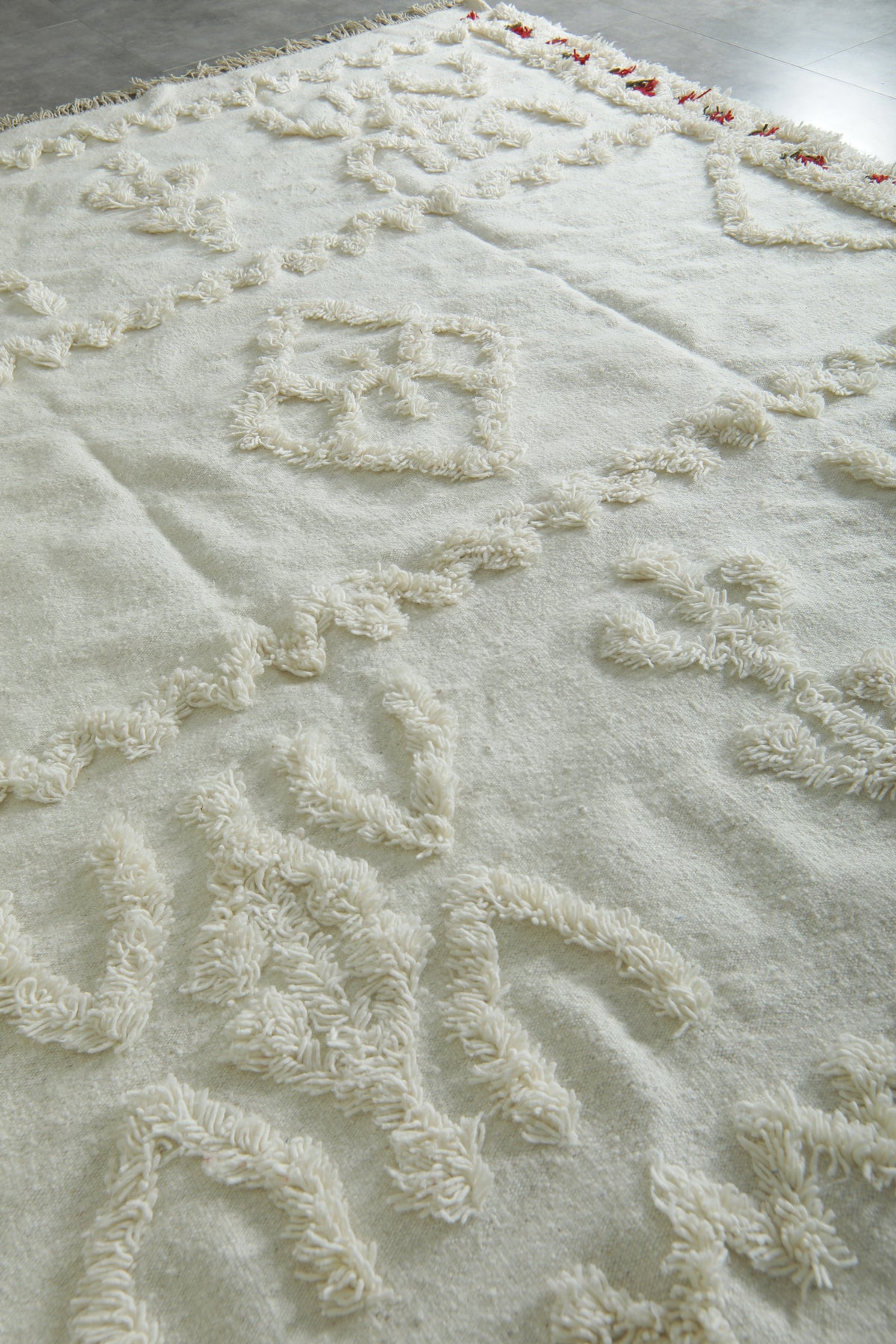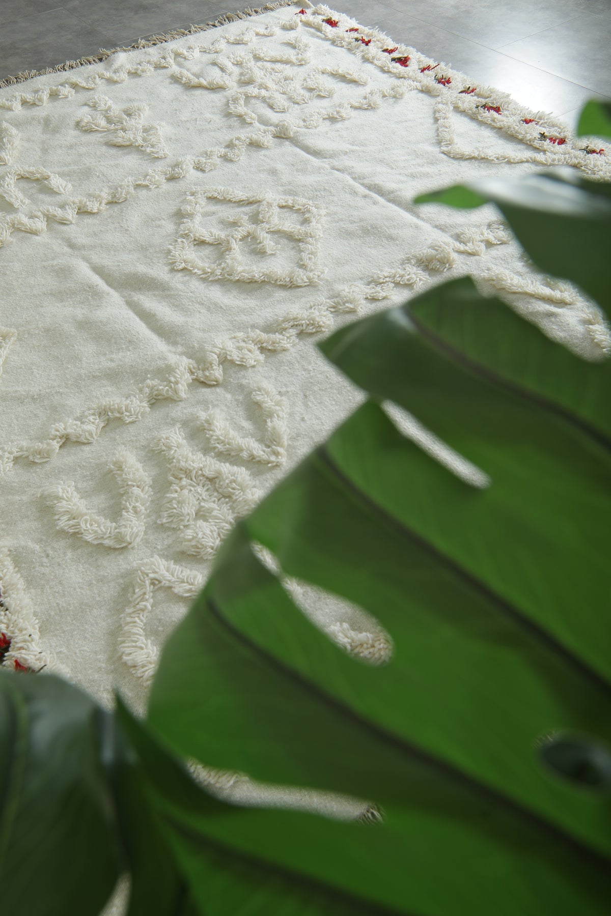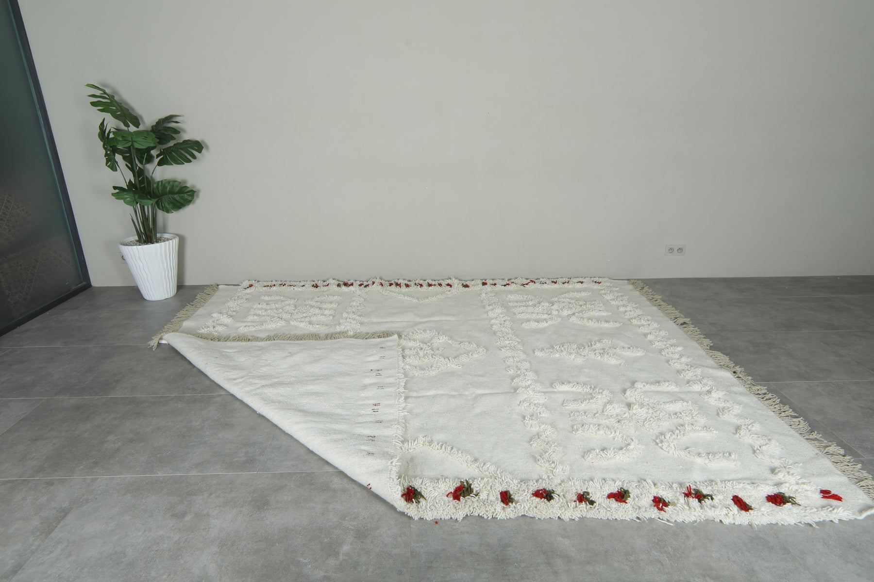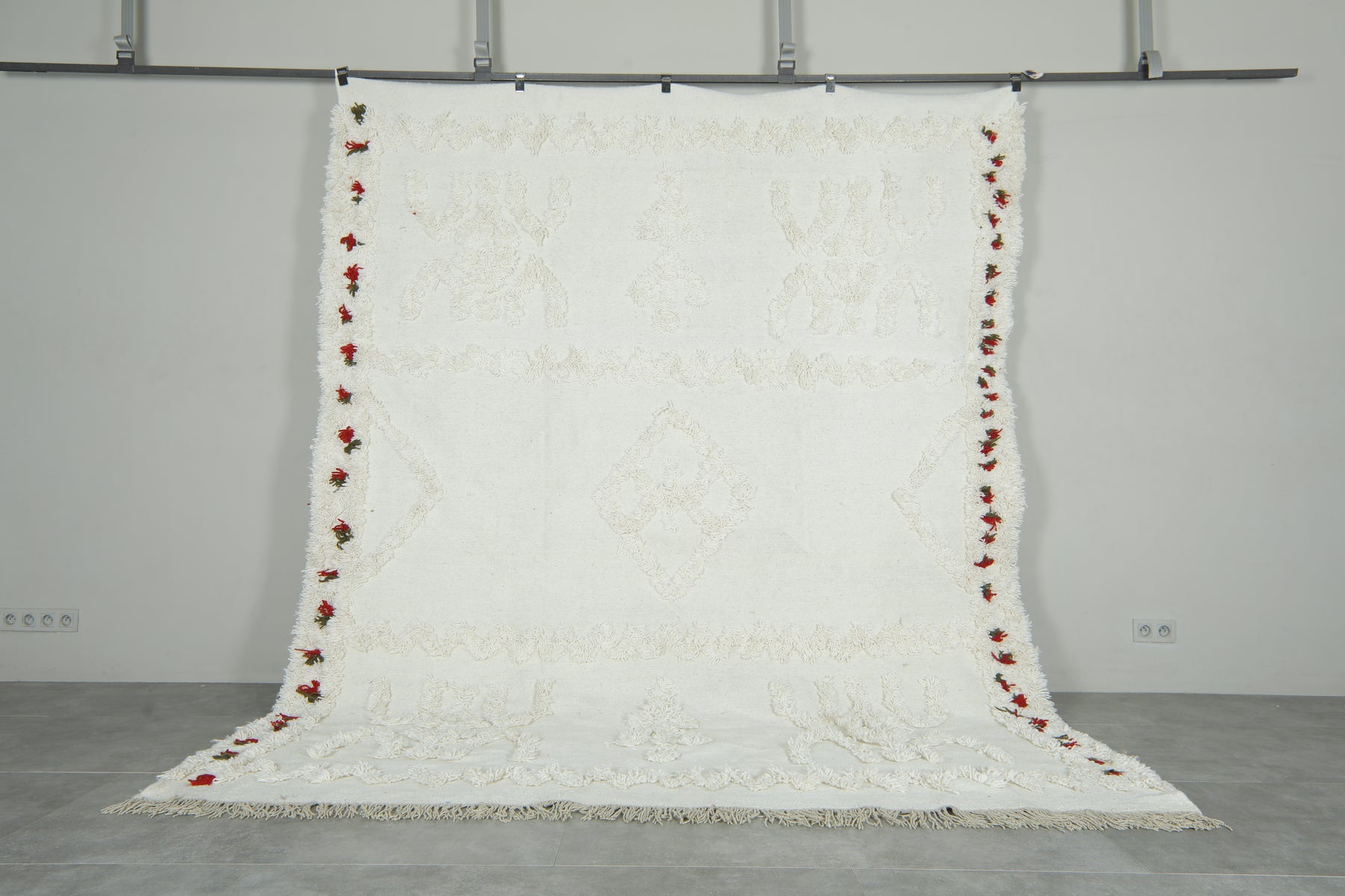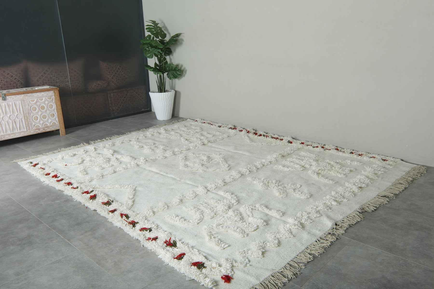This handmade Moroccan Kilim rug combines minimalist elegance with artisanal detail. Woven in pure white wool, it features subtle textured tribal motifs and delicate red rose accents along the borders, blending traditional craftsmanship with refined artistry.