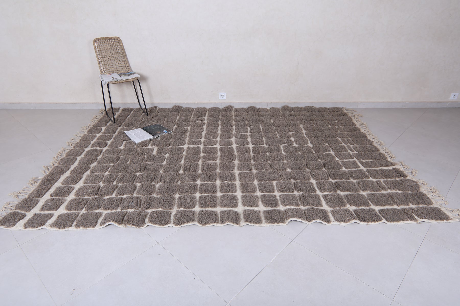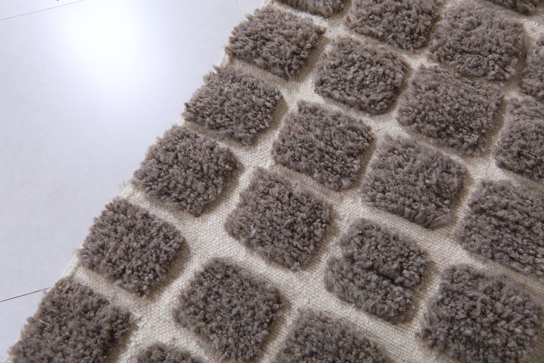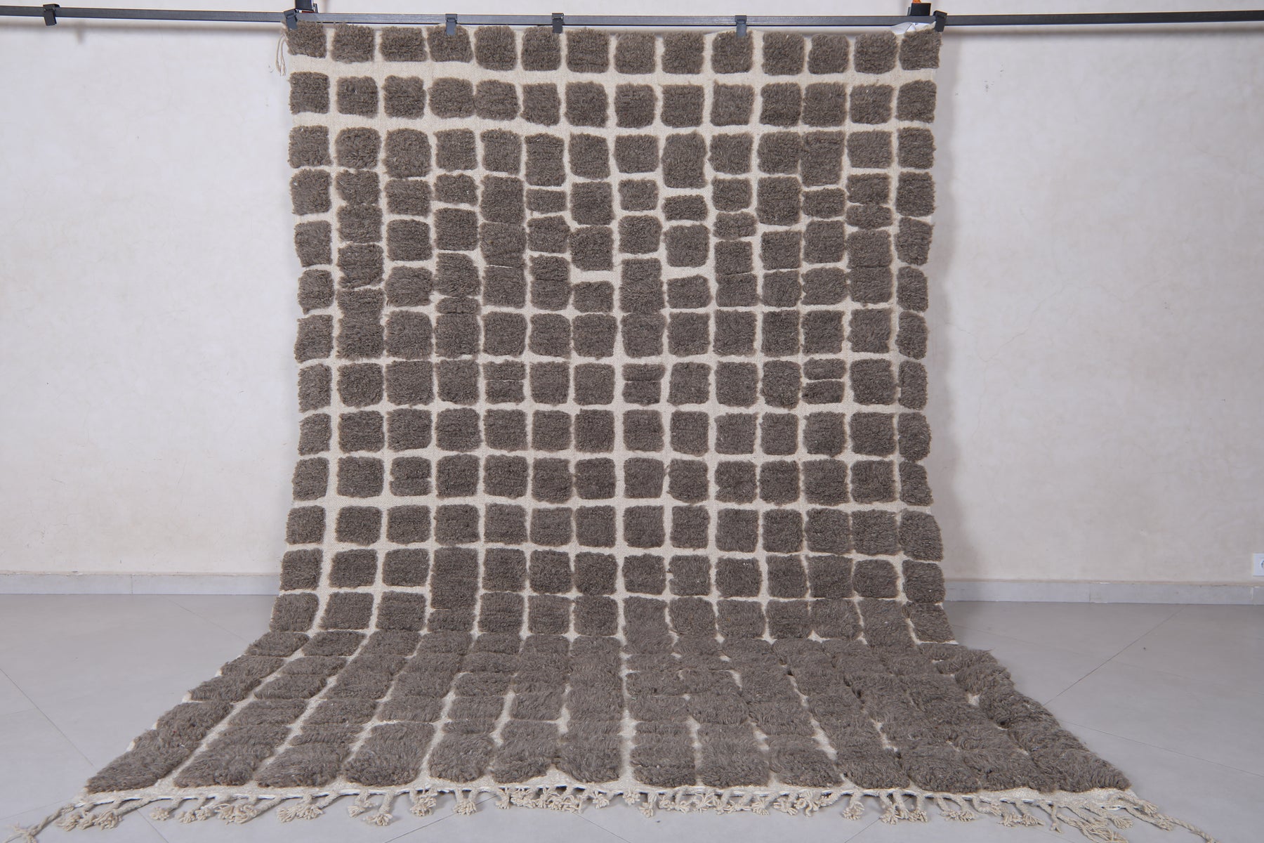 Bring modern texture and timeless elegance to your space with this handwoven Moroccan rug featuring a bold grid design. Crafted with a soft, plush pile, the rug showcases raised dark gray (or taupe) squares set against a warm cream background, creating a striking geometric pattern. Perfect for contemporary, boho, or minimalist interiors, this unique piece adds depth, warmth, and character to any living room, bedroom, or office. Its high-quality wool construction ensures durability and comfort underfoot, making it a stylish and practical addition to your home décor.