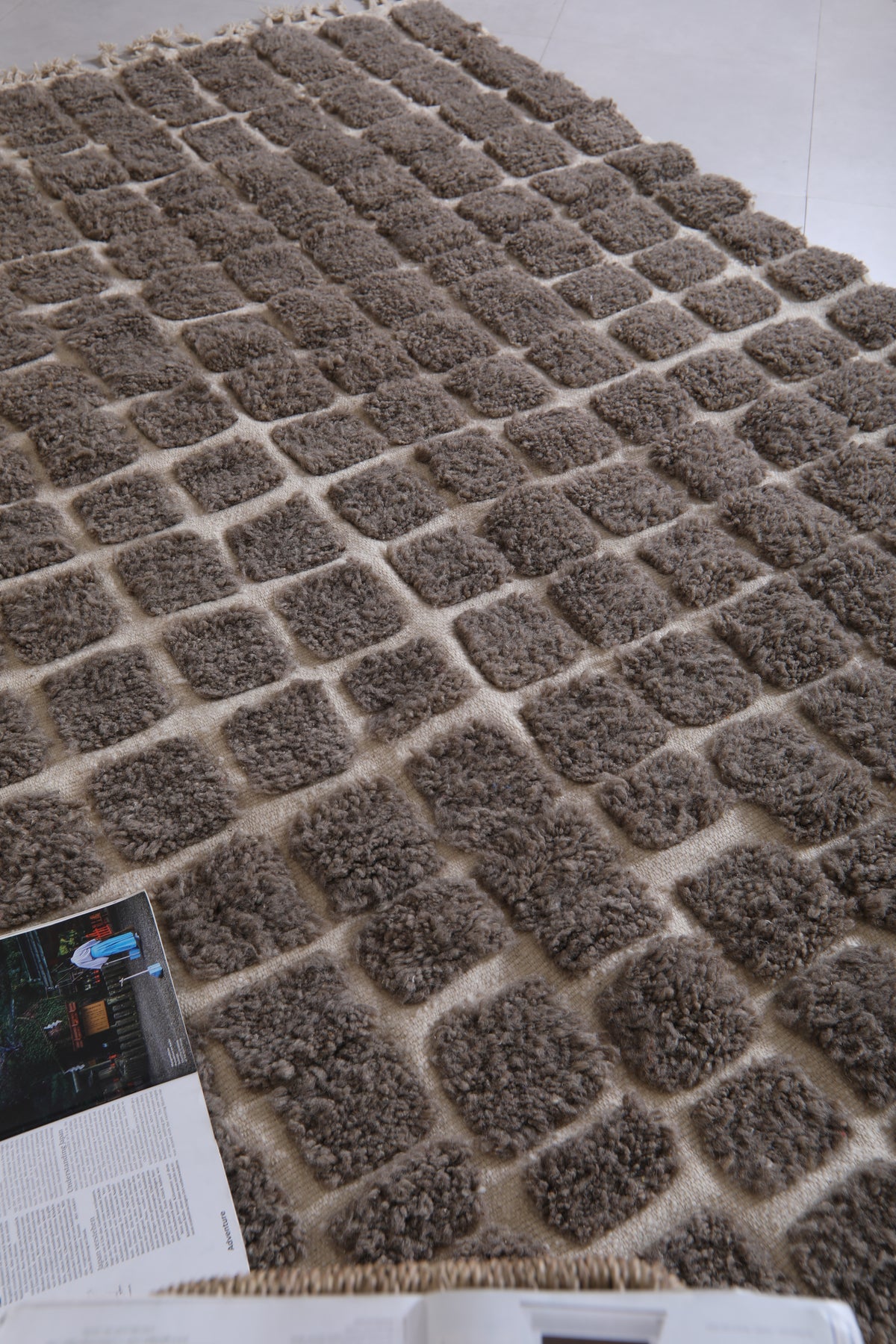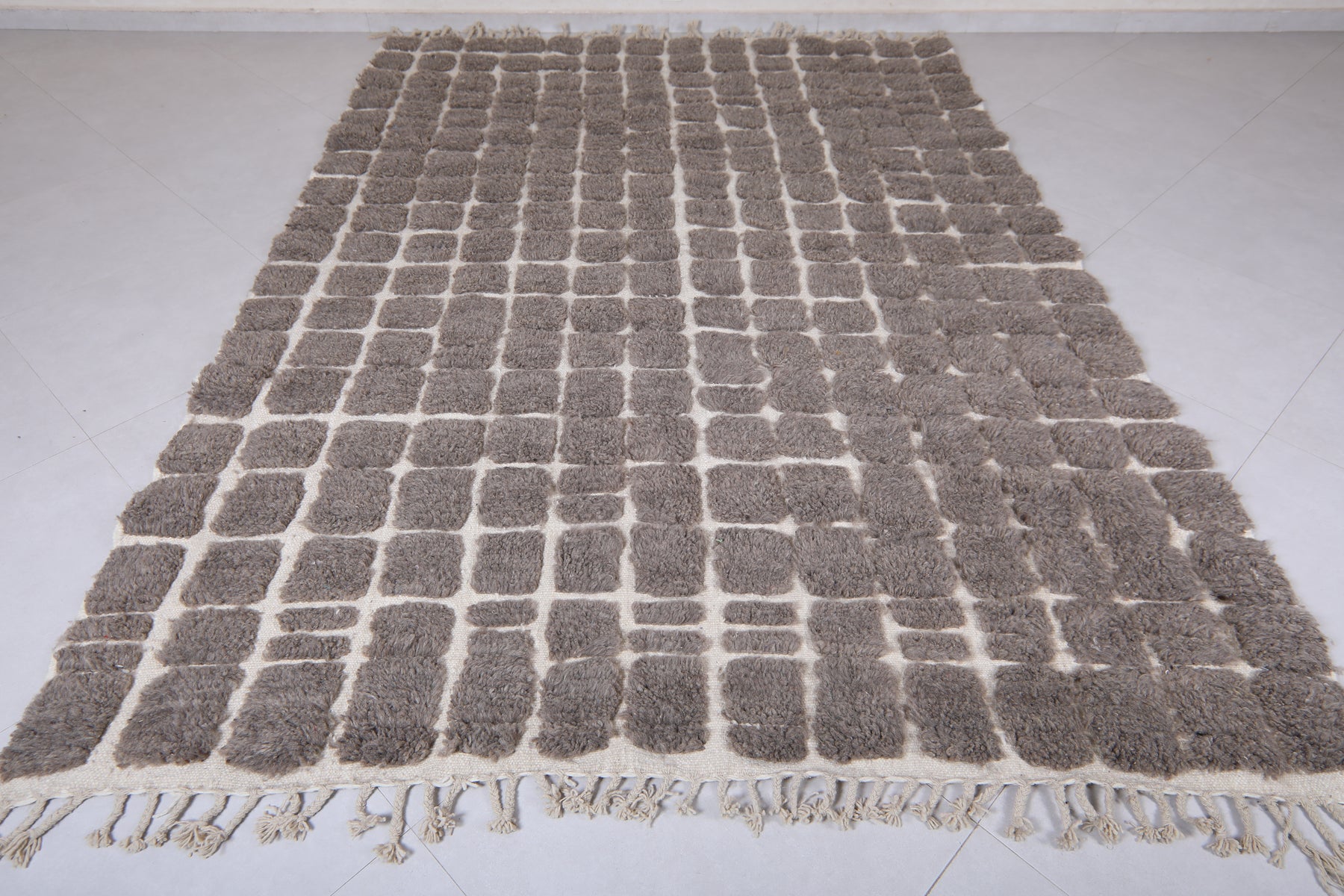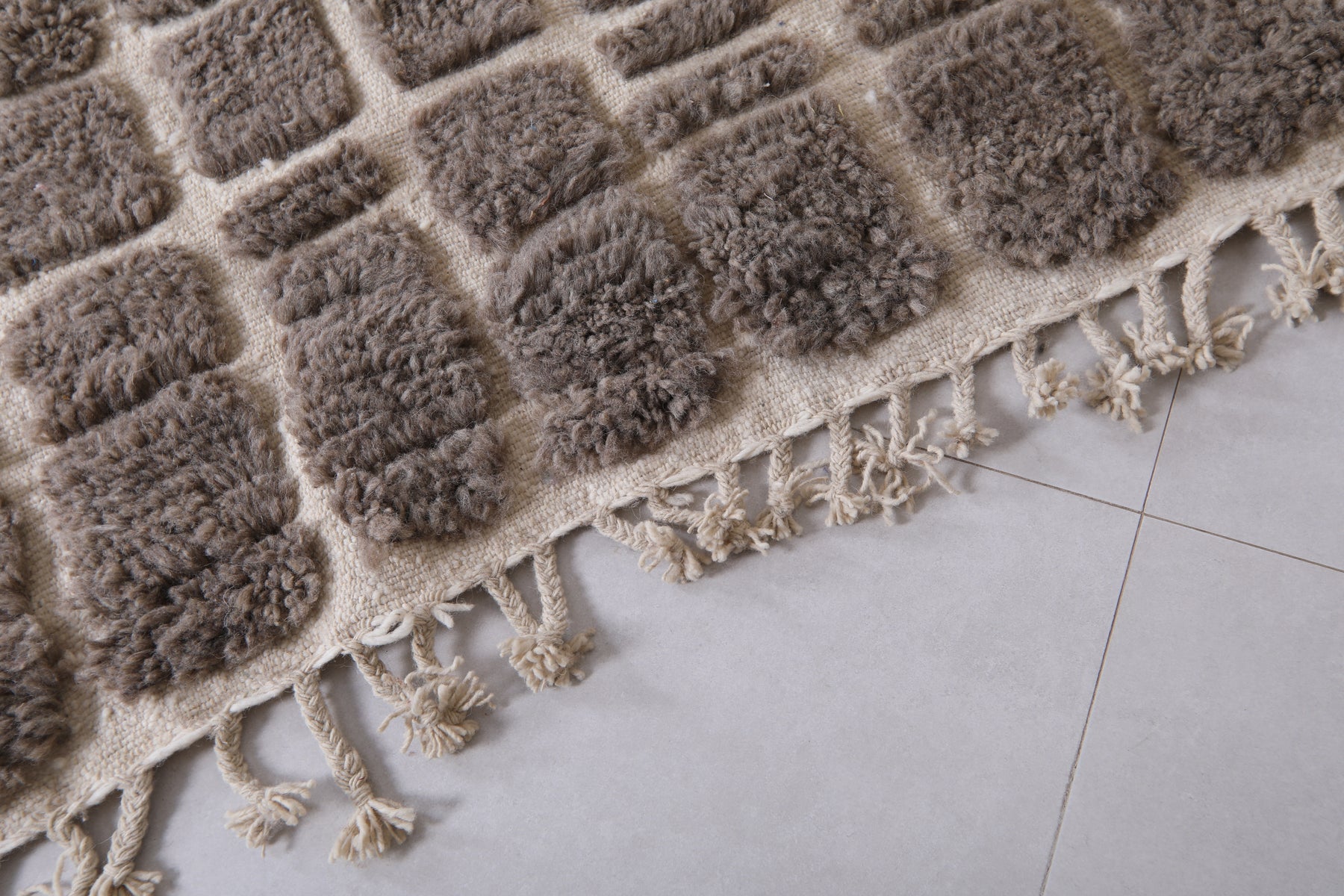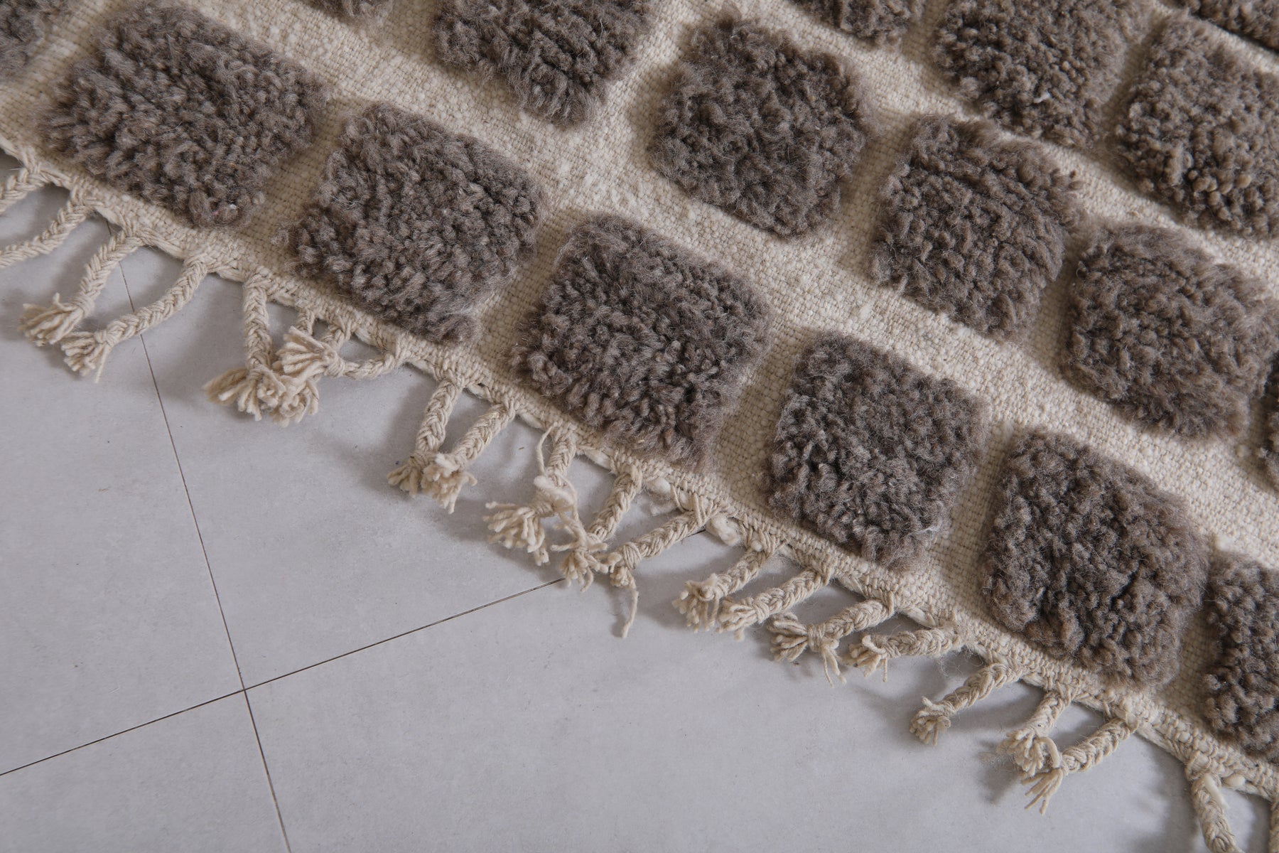 Bring modern texture and timeless elegance to your space with this handwoven Moroccan rug featuring a bold grid design. Crafted with a soft, plush pile, the rug showcases raised dark gray (or taupe) squares set against a warm cream background, creating a striking geometric pattern. Perfect for contemporary, boho, or minimalist interiors, this unique piece adds depth, warmth, and character to any living room, bedroom, or office. Its high-quality wool construction ensures durability and comfort underfoot, making it a stylish and practical addition to your home décor.