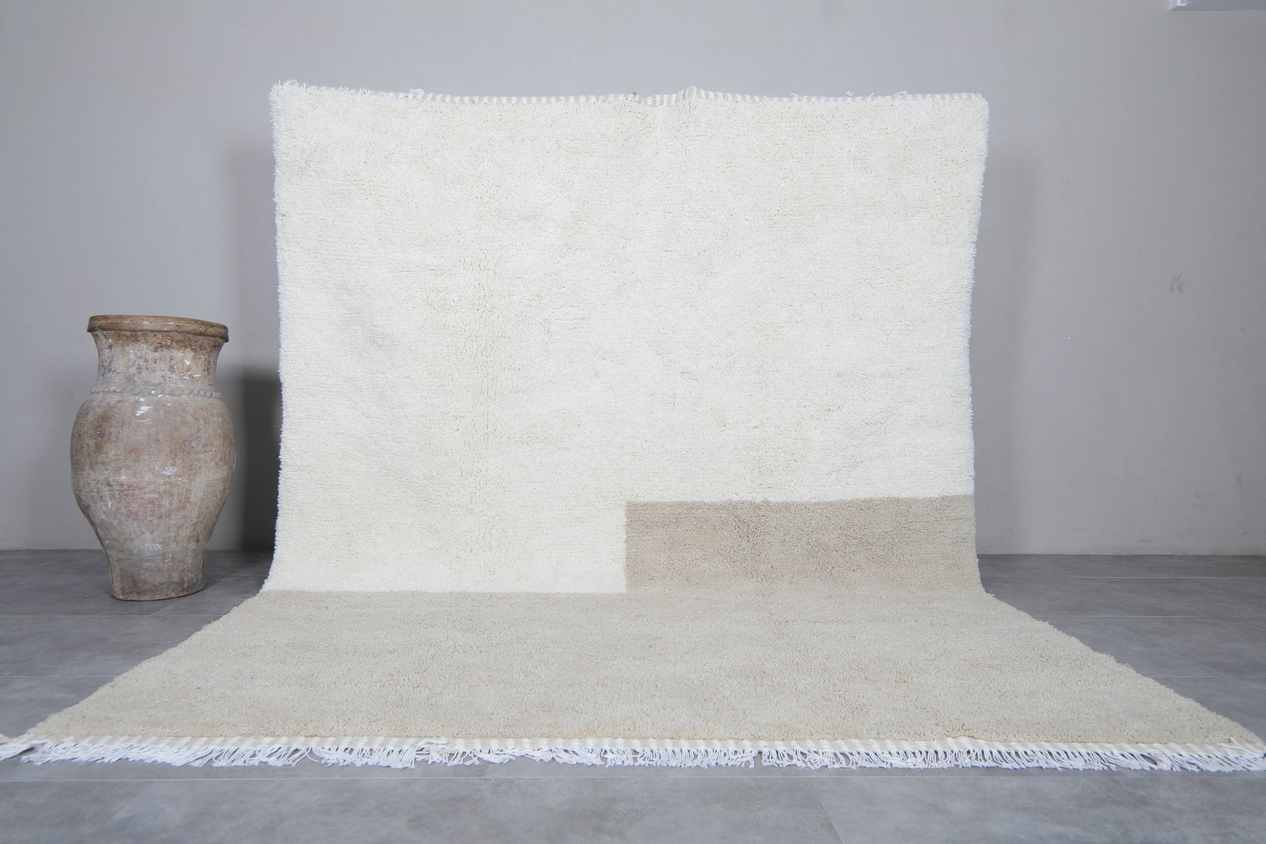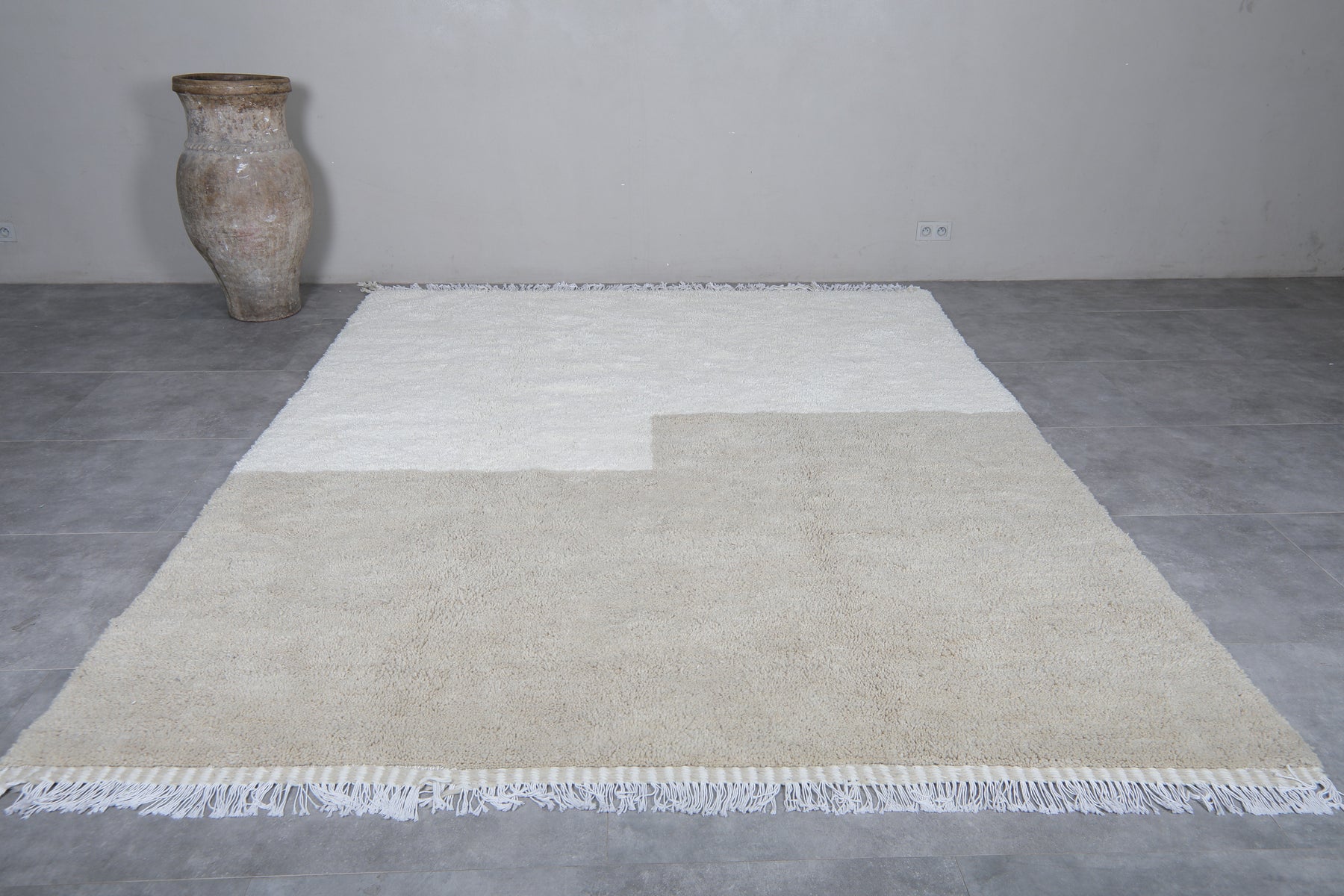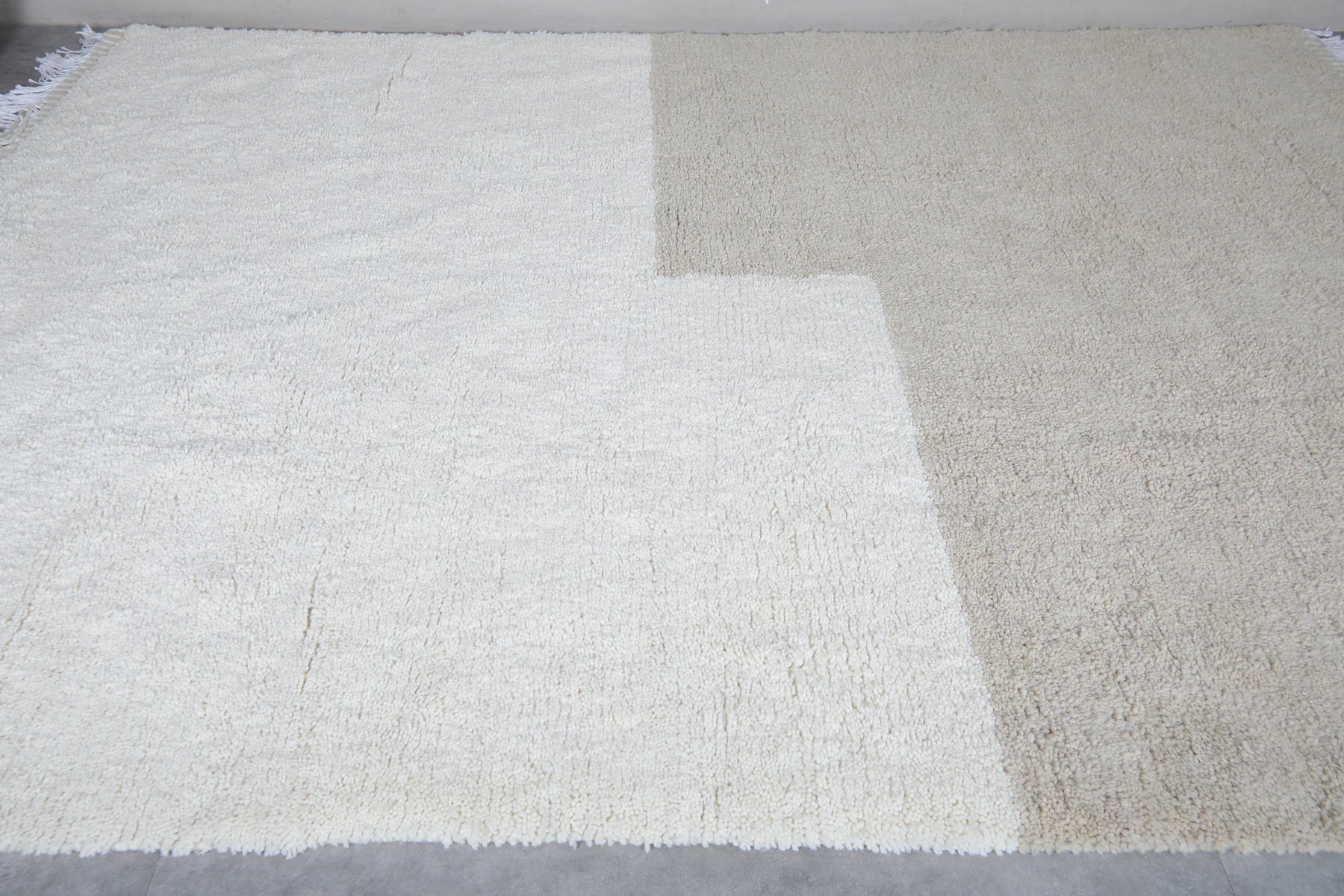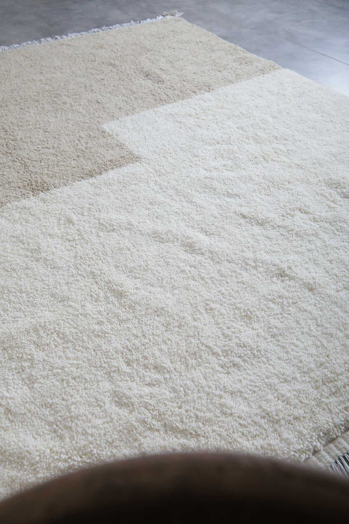 Bring calm sophistication into your home with this minimalist white and beige Moroccan wool rug, handwoven with a modern eye for simplicity and balance. Featuring a clean off-white base and a contrasting beige rectangular block, this rug is a perfect choice for lovers of neutral interiors and understated design.