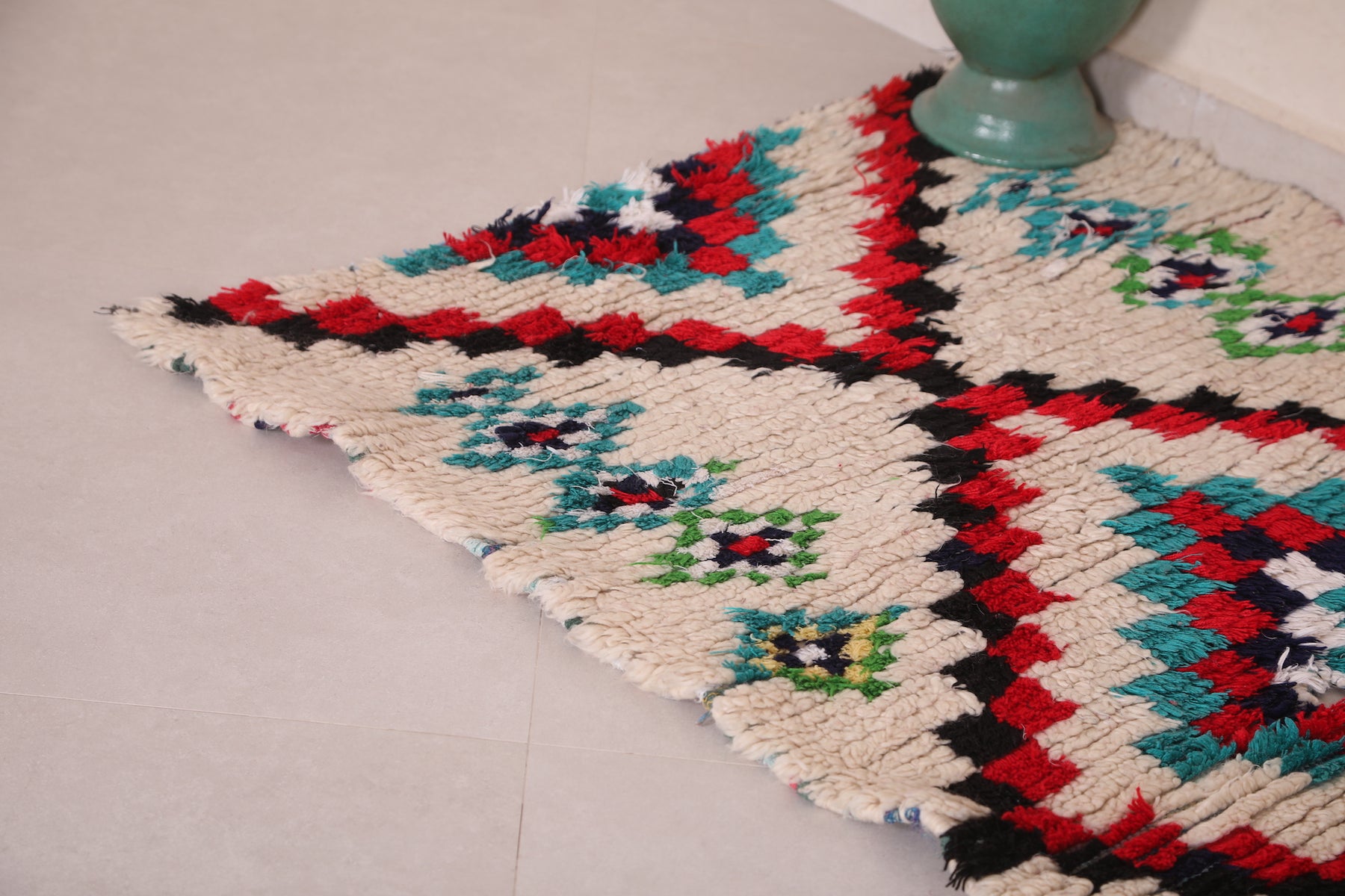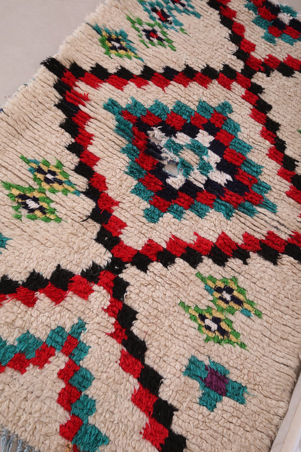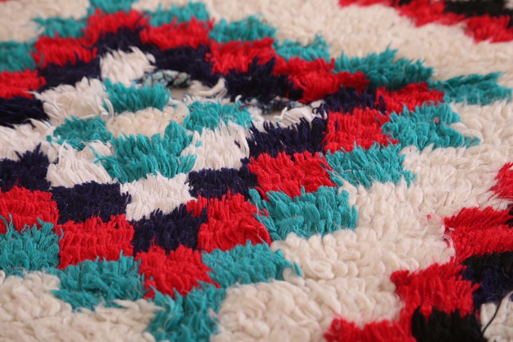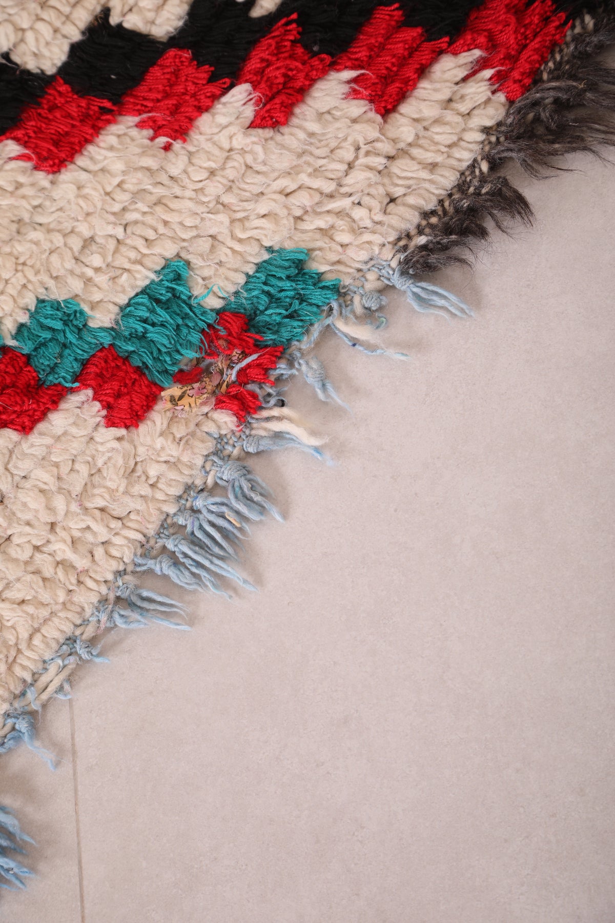 Enhance your space with this Moroccan rug, measuring 3.2 x 5.5 feet, featuring a bold and colorful diamond design. The vibrant combination of red, teal, black, and green creates a stunning visual impact, adding a touch of elegance and warmth to any room. Perfect for living rooms, bedrooms, or hallways, this handwoven rug will elevate your décor with its unique design and craftsmanship. Its lively colors and traditional pattern make it a versatile addition to both modern and traditional interiors.