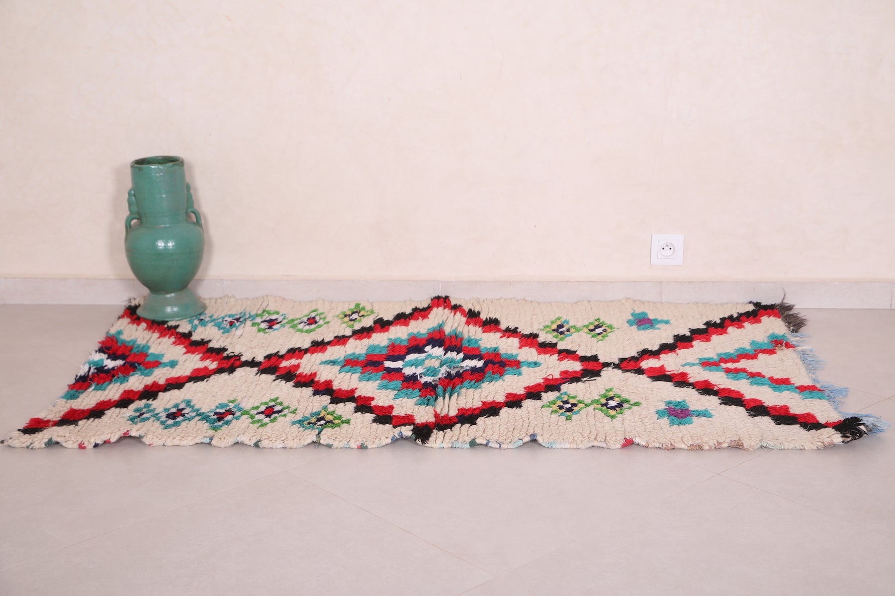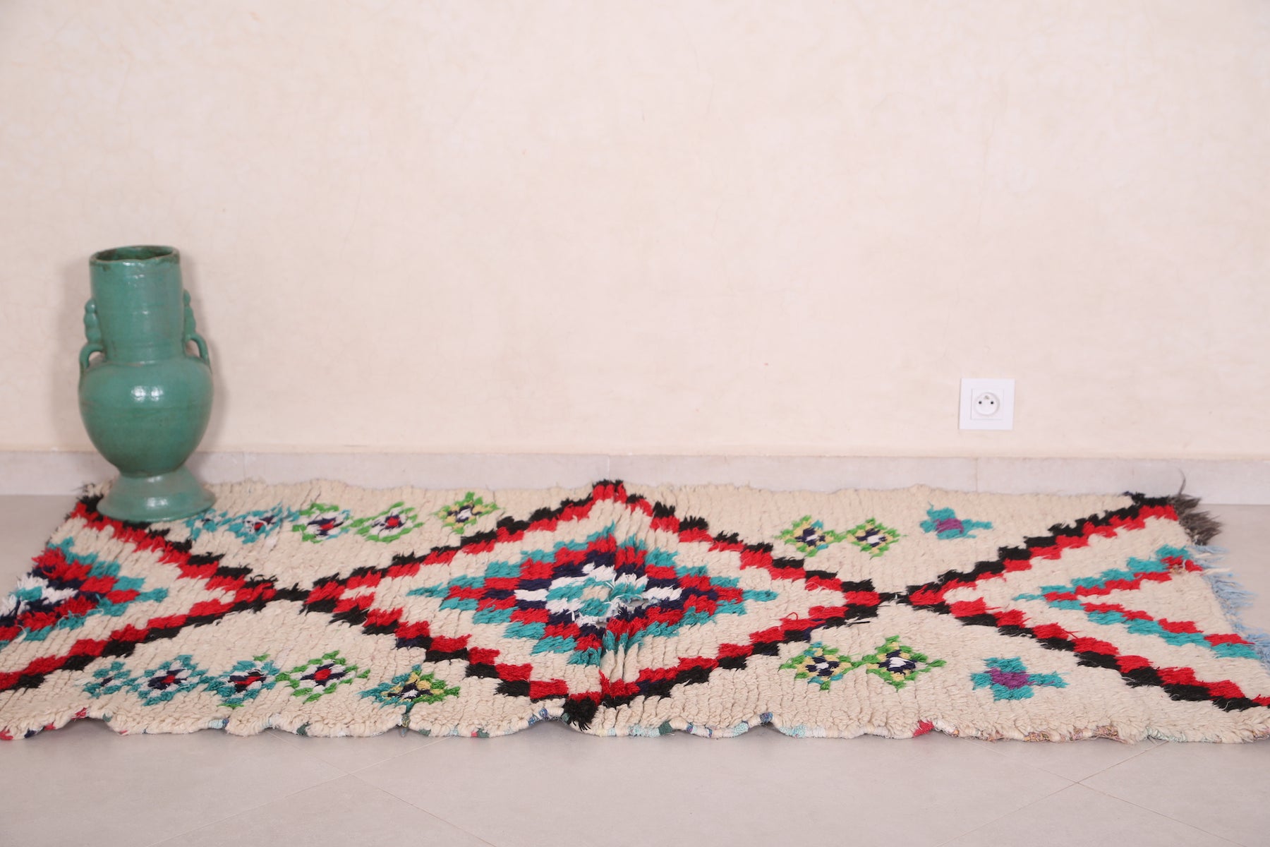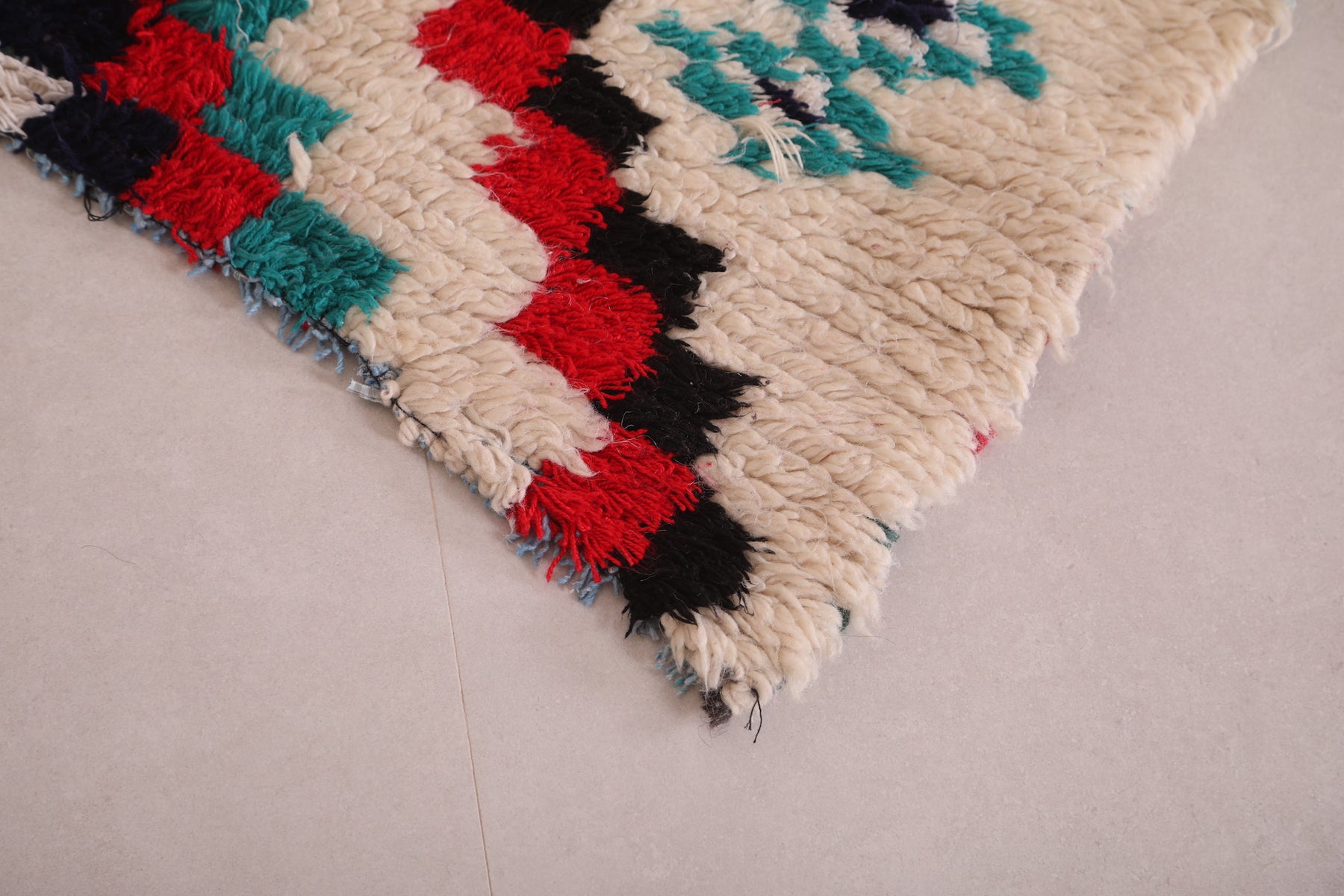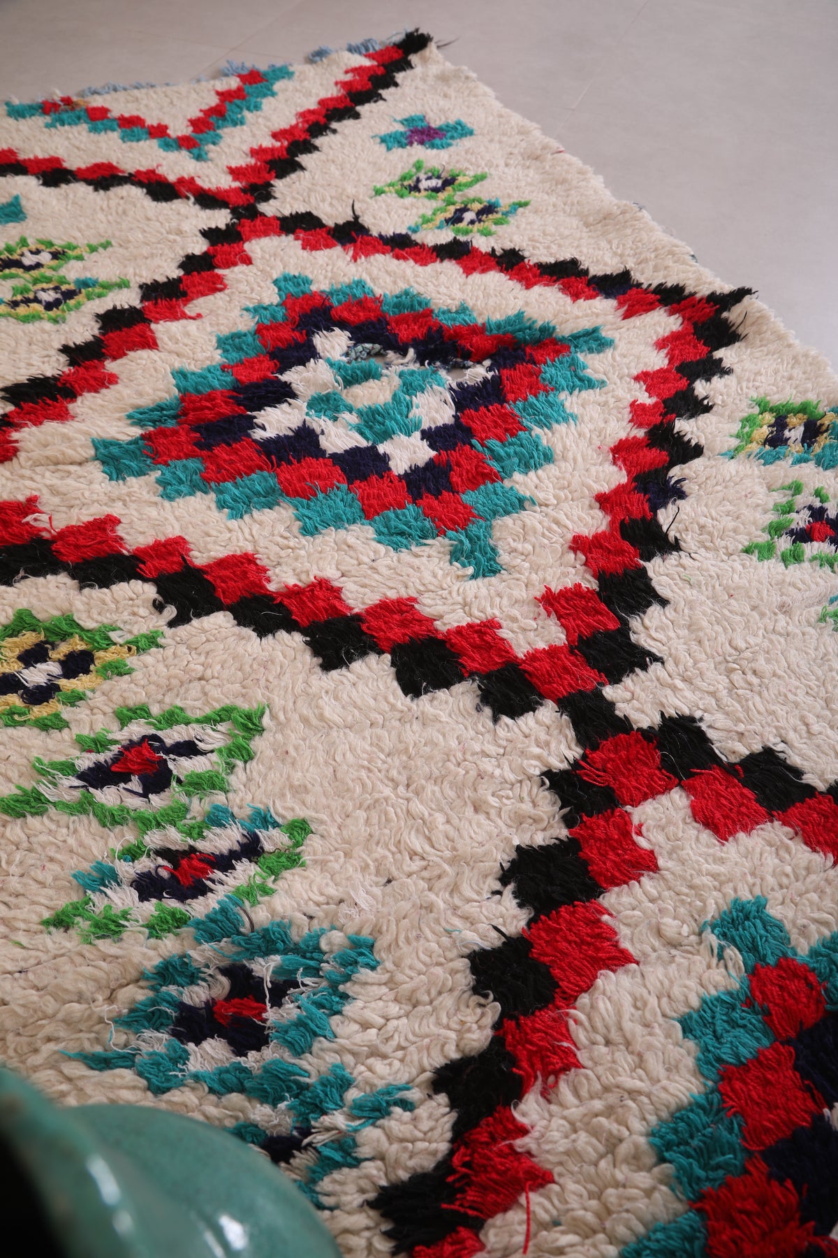 Enhance your space with this Moroccan rug, measuring 3.2 x 5.5 feet, featuring a bold and colorful diamond design. The vibrant combination of red, teal, black, and green creates a stunning visual impact, adding a touch of elegance and warmth to any room. Perfect for living rooms, bedrooms, or hallways, this handwoven rug will elevate your décor with its unique design and craftsmanship. Its lively colors and traditional pattern make it a versatile addition to both modern and traditional interiors.