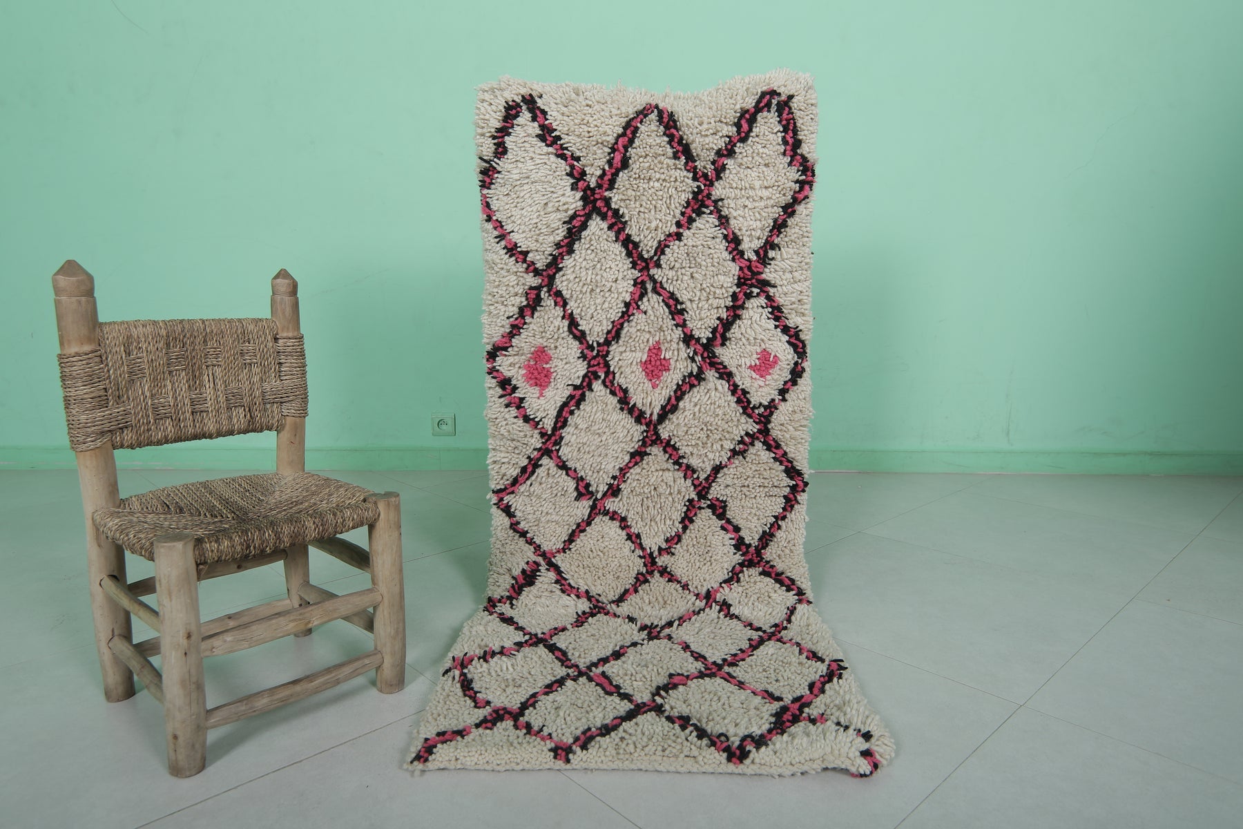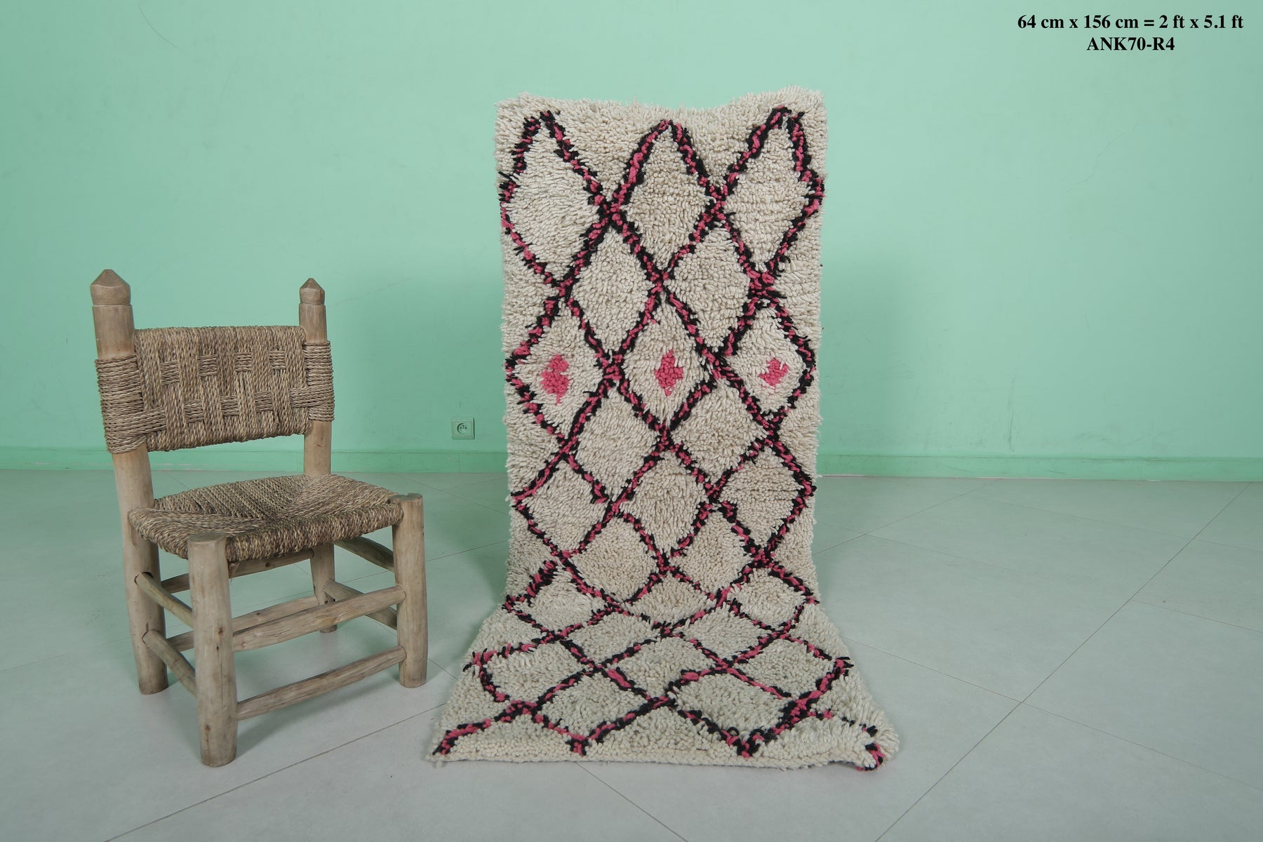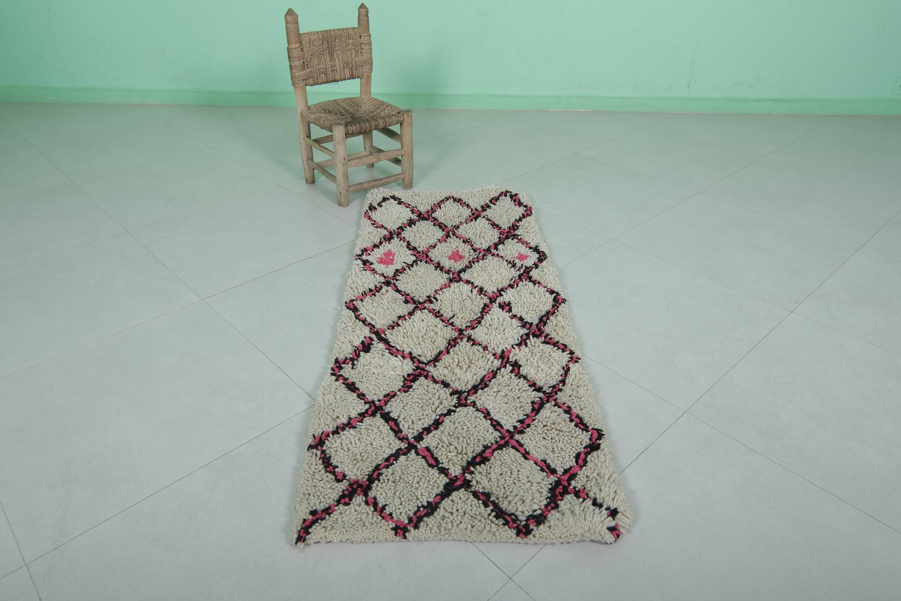 Elevate your space with this charming 2 x 5.1 feet (64 CM x 156 CM) Trellis Moroccan rug. Handwoven from 100% natural wool, this rug features a striking trellis pattern accented by vibrant pink details, showcasing the artistry of traditional Moroccan craftsmanship. Perfect as an accent piece, this small yet impactful rug adds warmth and style to entryways, reading nooks, or children’s rooms. The soft, plush texture ensures comfort underfoot, while the durable construction provides long-lasting quality. A unique addition to any home, this rug effortlessly blends modern and bohemian decor.