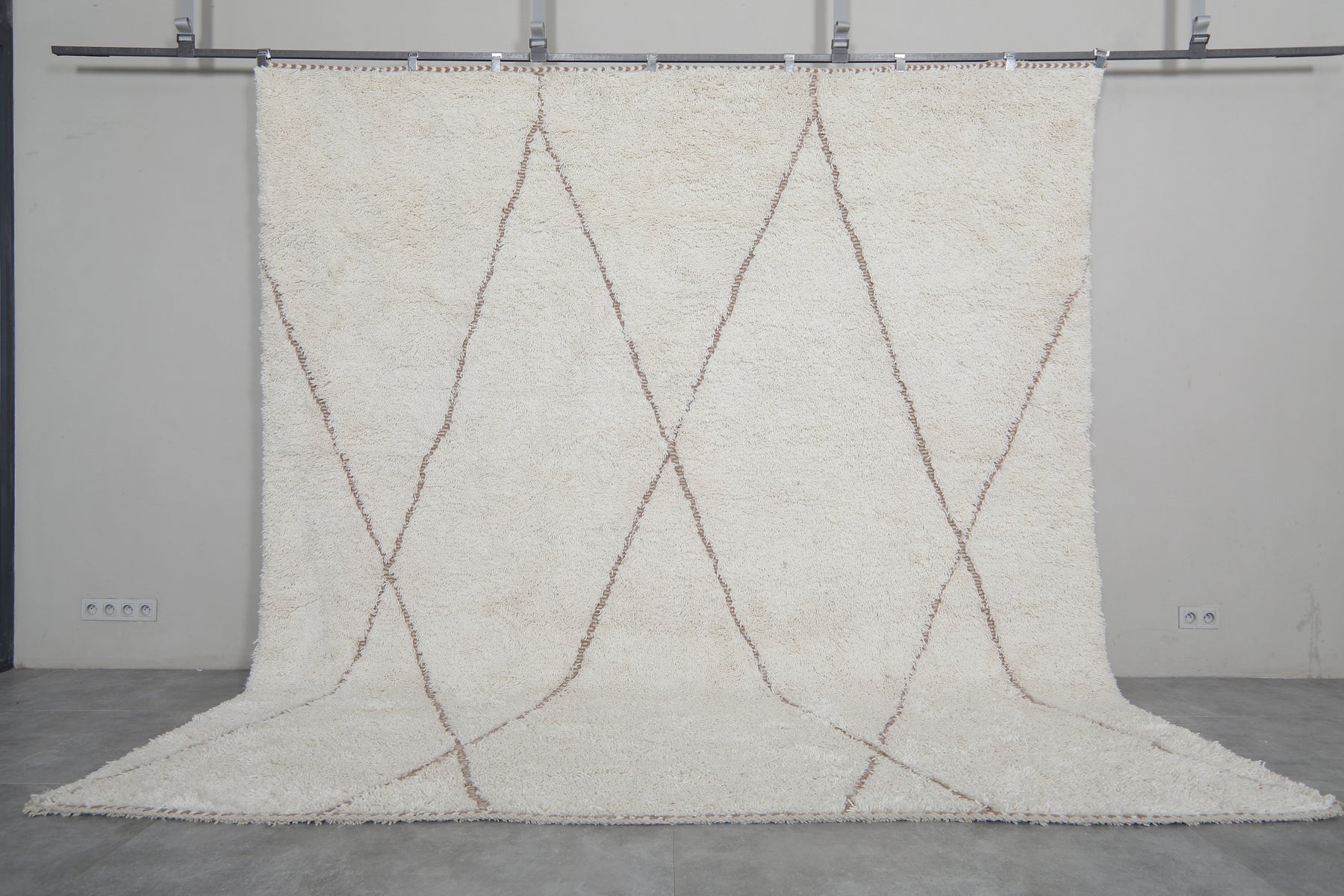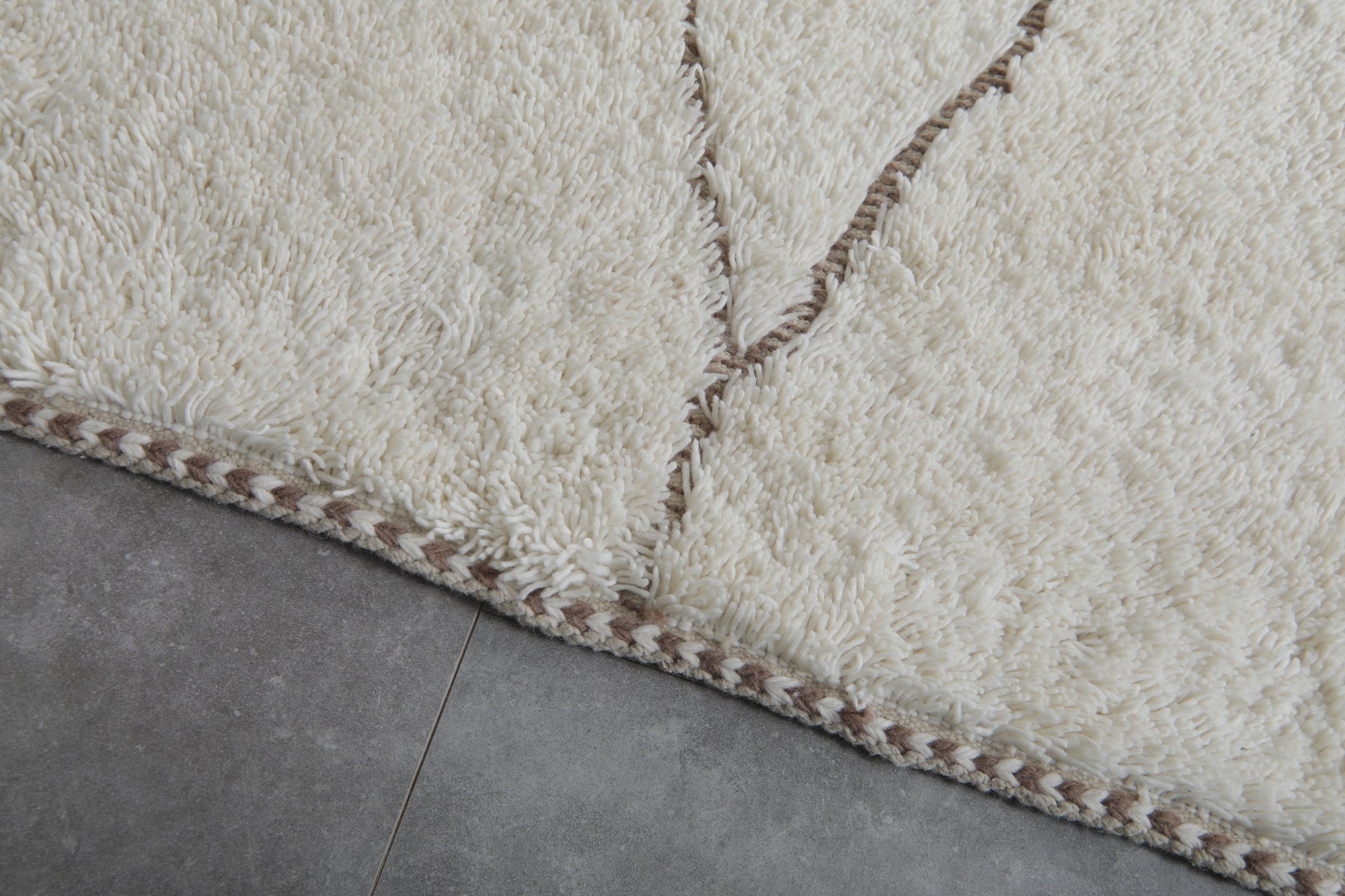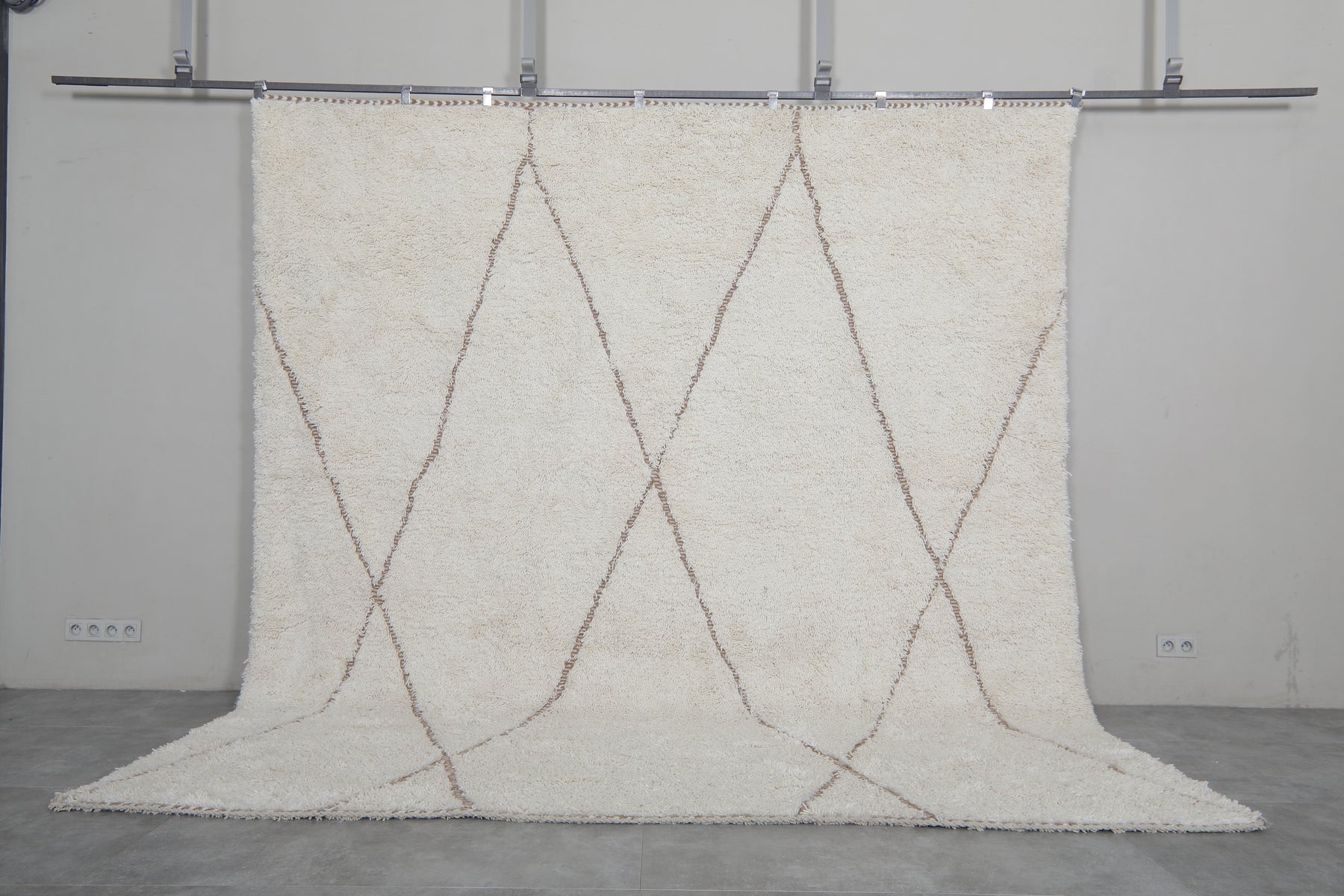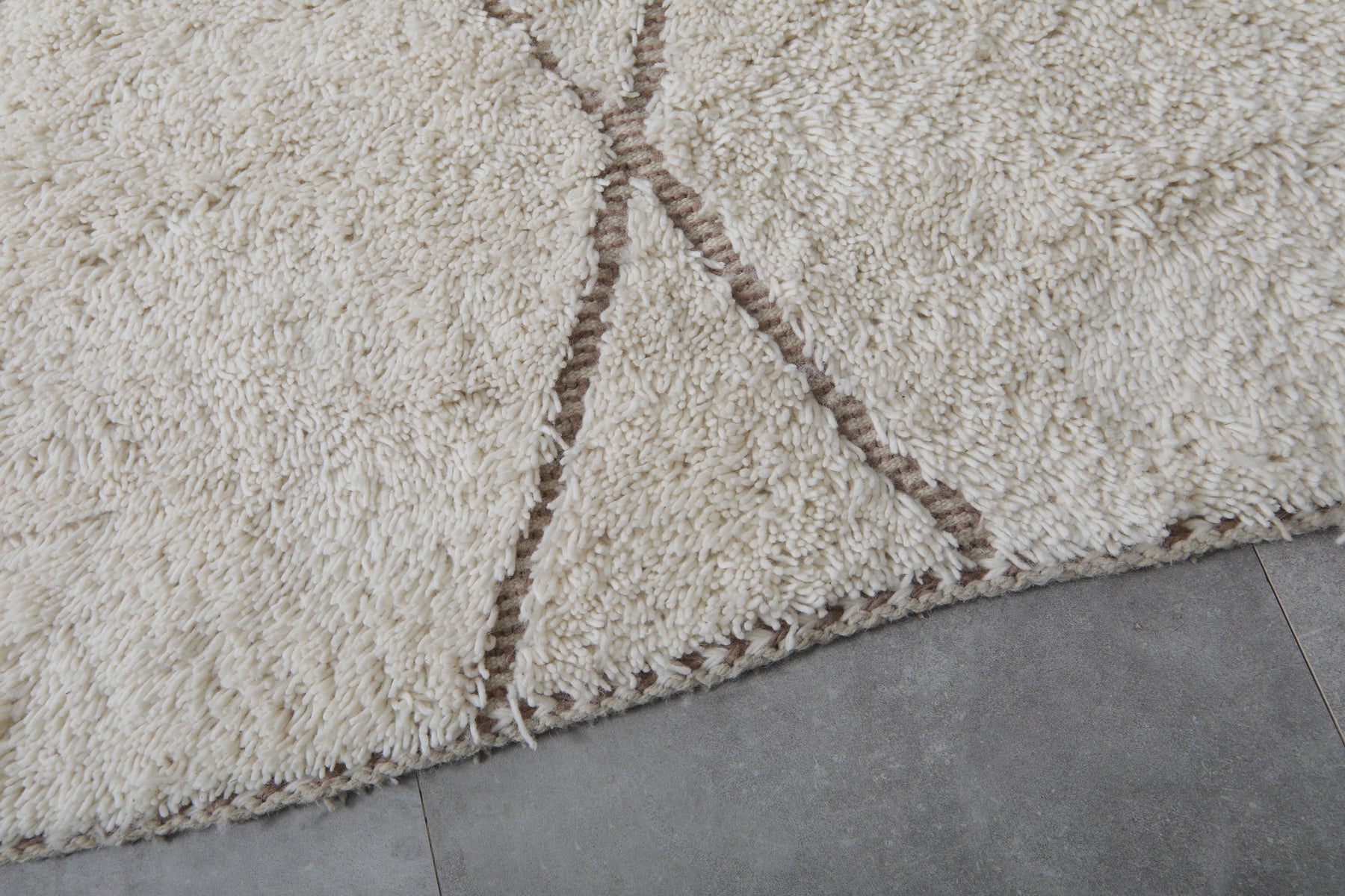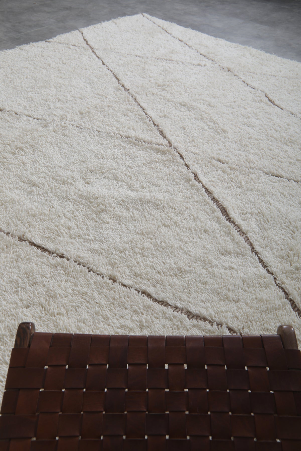 This Moroccan rug is handcrafted from premium wool, offering a luxurious, soft texture that is sure to become a cozy addition to any space. Its plain white color and minimalist design will bring an elegant feel to your living room or bedroom. Customize the size to fit your needs.