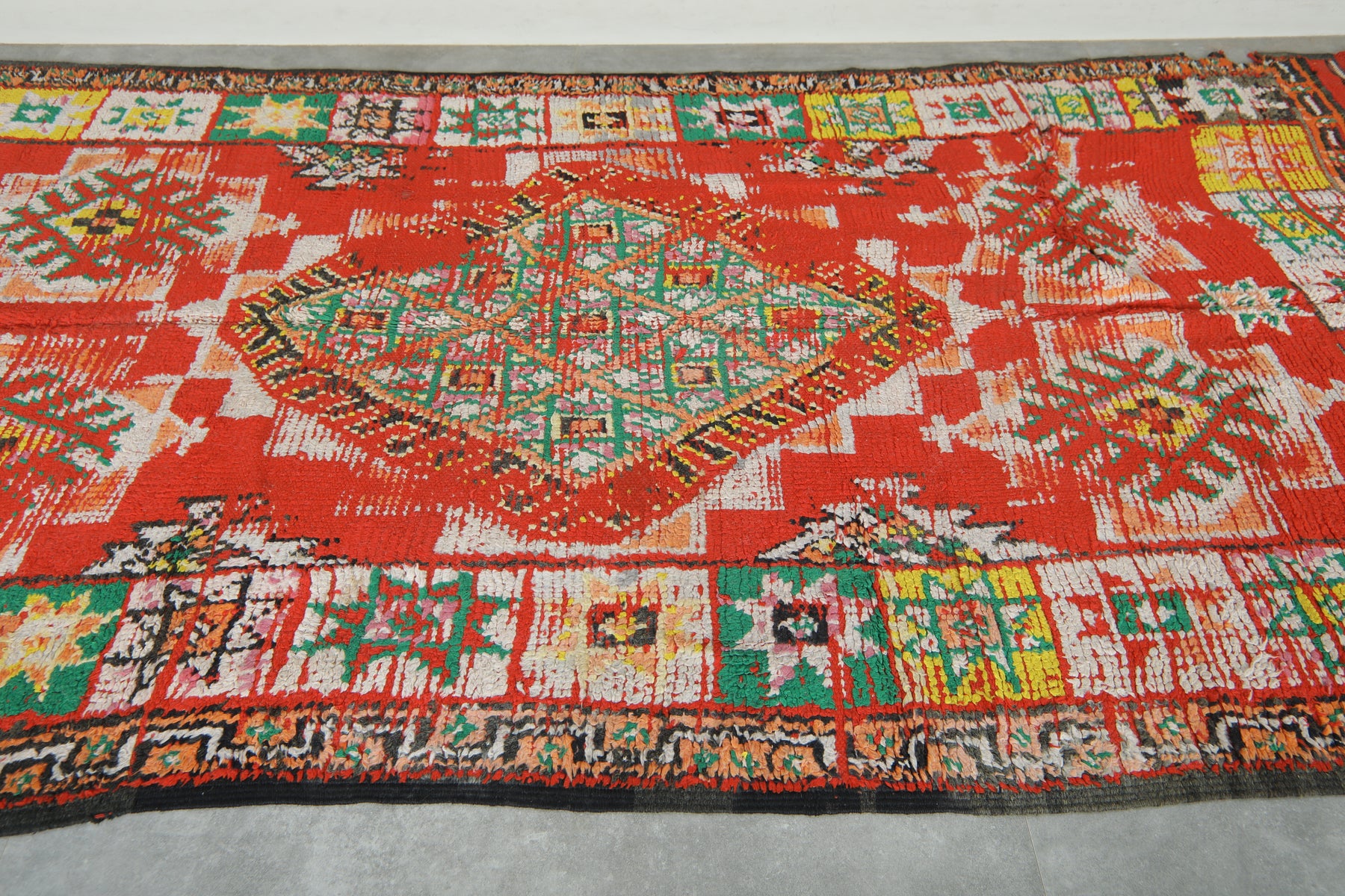 This handmade Moroccan rug, measuring 5.5 ft by 8.3 ft, features a striking geometric pattern in vibrant red and multicolor tones. Crafted from high-quality wool, it offers durability and natural warmth, making it a sophisticated addition to any space. Its artisanal construction ensures each detail is unique, combining traditional techniques with modern style for a rug that enhances both comfort and aesthetic appeal.
