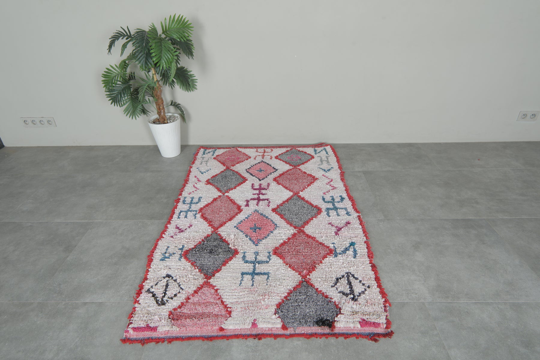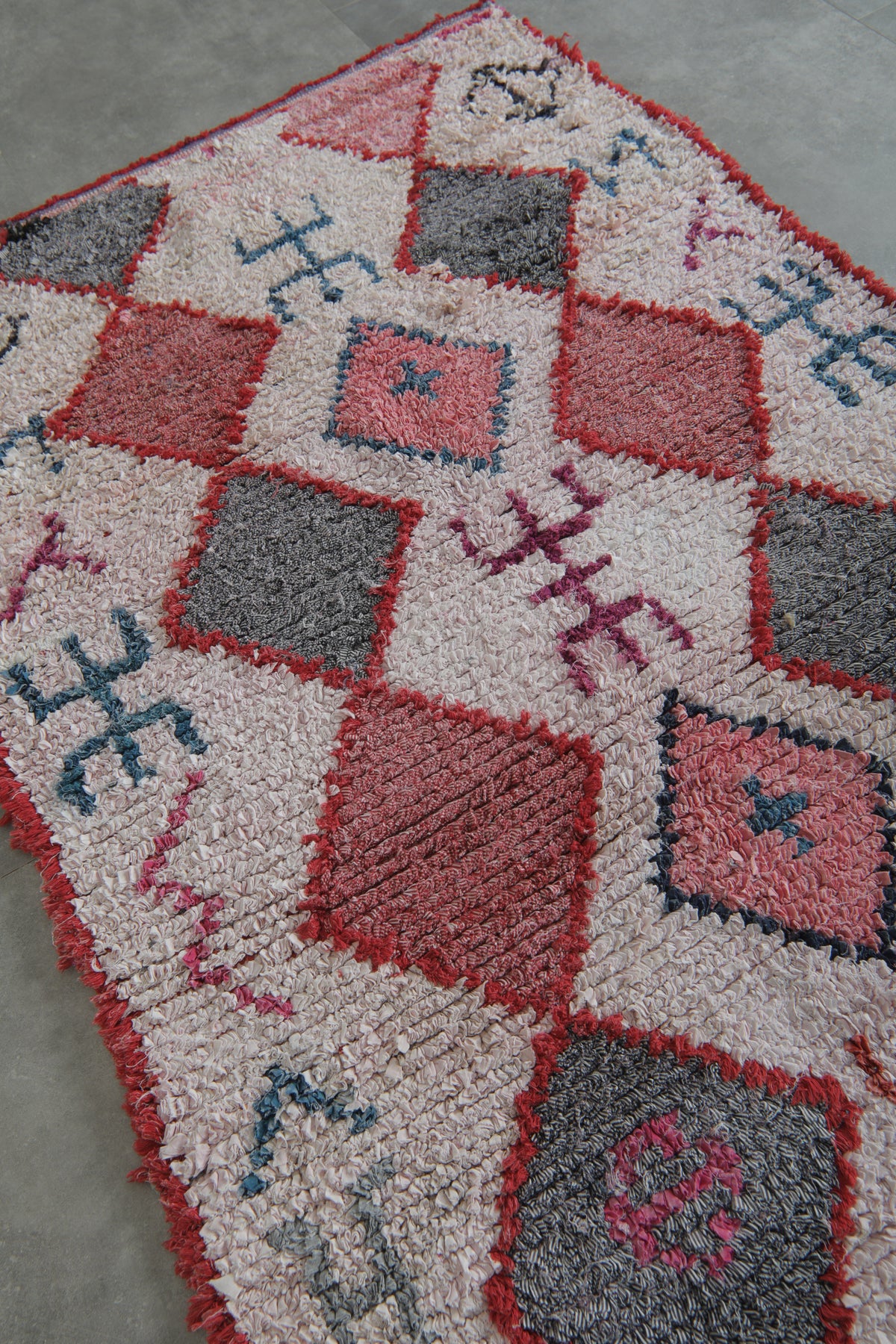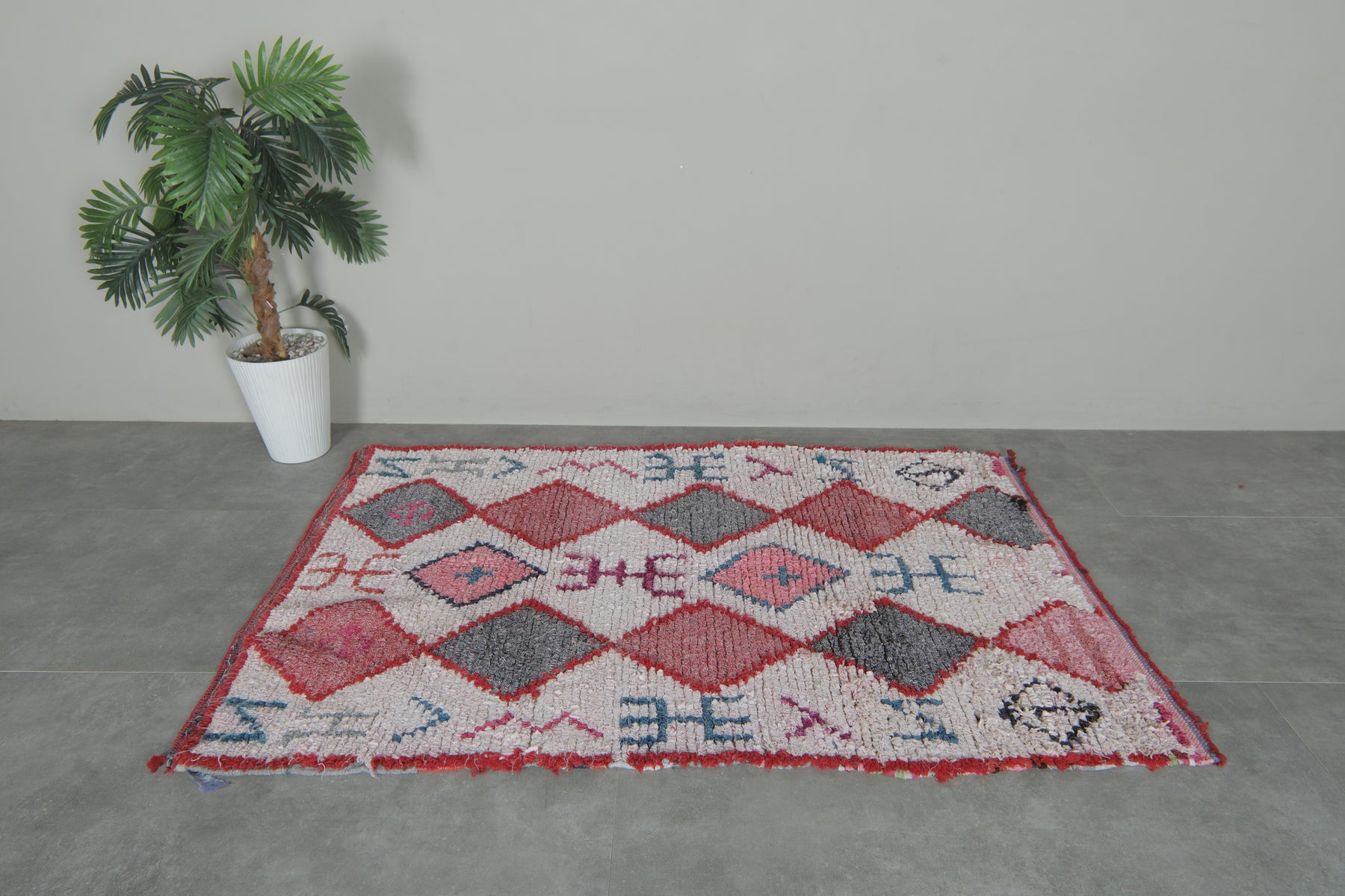 Add a bold tribal flair to your interior with this handcrafted Moroccan Boucherouite rug, measuring 3.8 x 5.8 feet. This one-of-a-kind piece showcases a rhythmic diamond pattern in shades of crimson, ash grey, blush, and coral—outlined by red borders and surrounded by symbolic Berber motifs. The creamy white background brings brightness and contrast, while the scattered abstract glyphs in teal, magenta, and navy create a storybook charm. Perfect for eclectic nooks or statement entryways, this rug is both cultural and contemporary.
