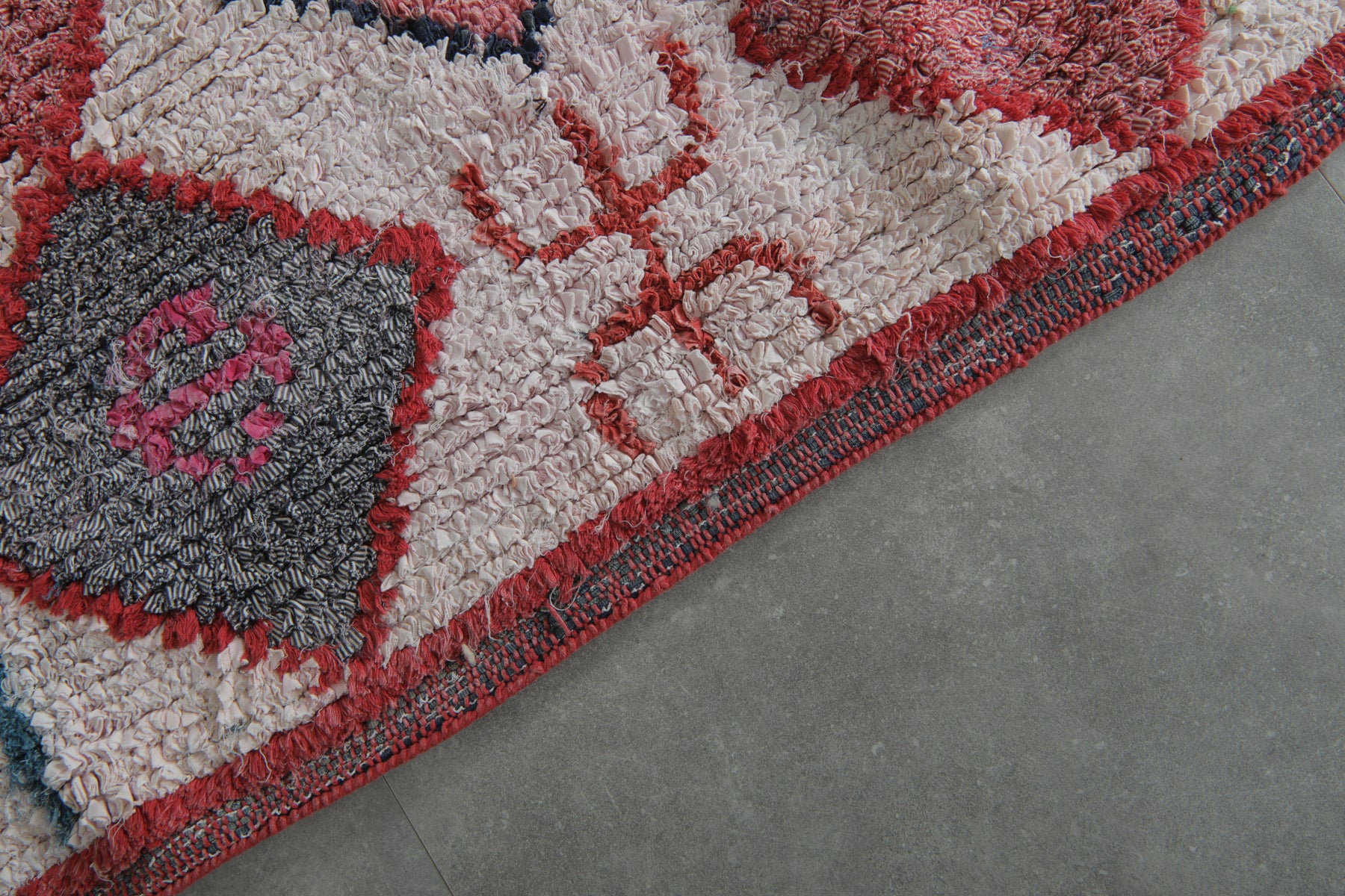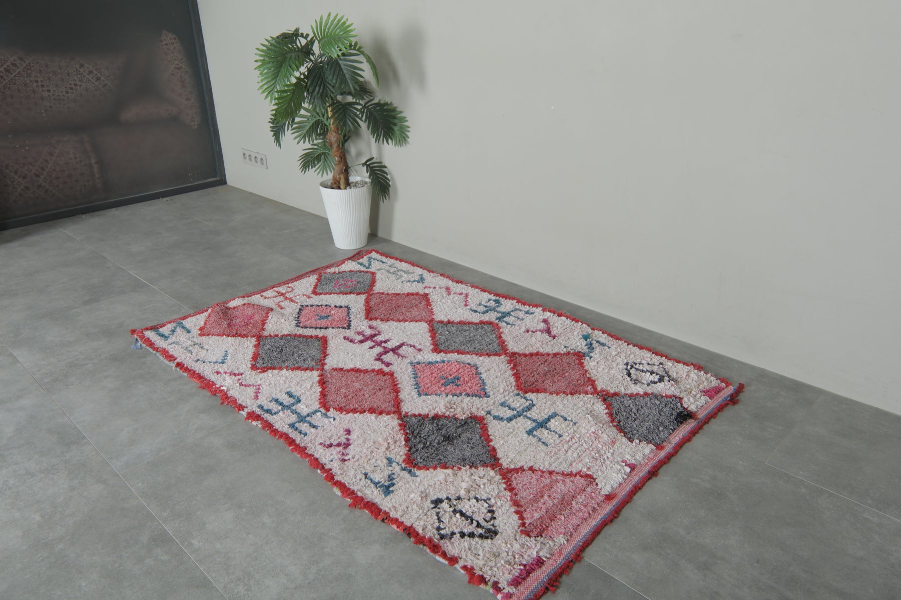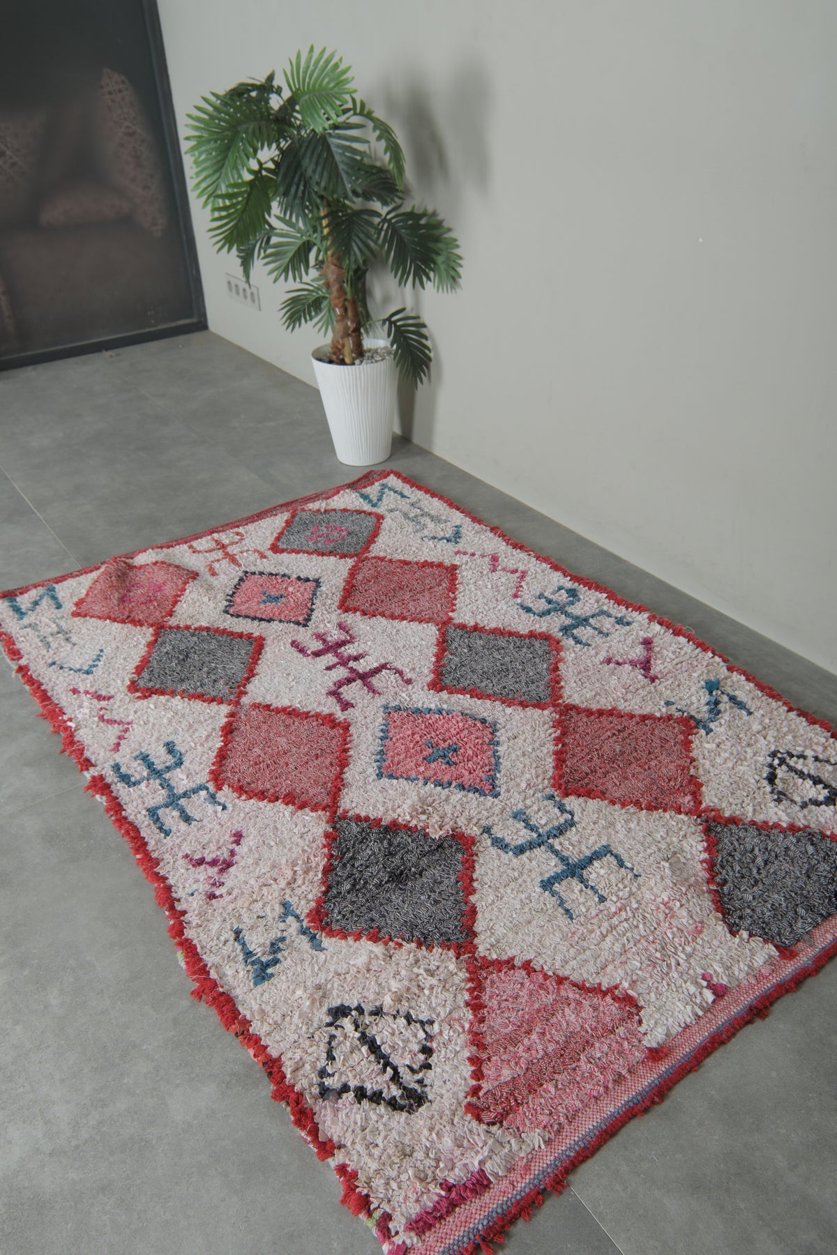 Add a bold tribal flair to your interior with this handcrafted Moroccan Boucherouite rug, measuring 3.8 x 5.8 feet. This one-of-a-kind piece showcases a rhythmic diamond pattern in shades of crimson, ash grey, blush, and coral—outlined by red borders and surrounded by symbolic Berber motifs. The creamy white background brings brightness and contrast, while the scattered abstract glyphs in teal, magenta, and navy create a storybook charm. Perfect for eclectic nooks or statement entryways, this rug is both cultural and contemporary.