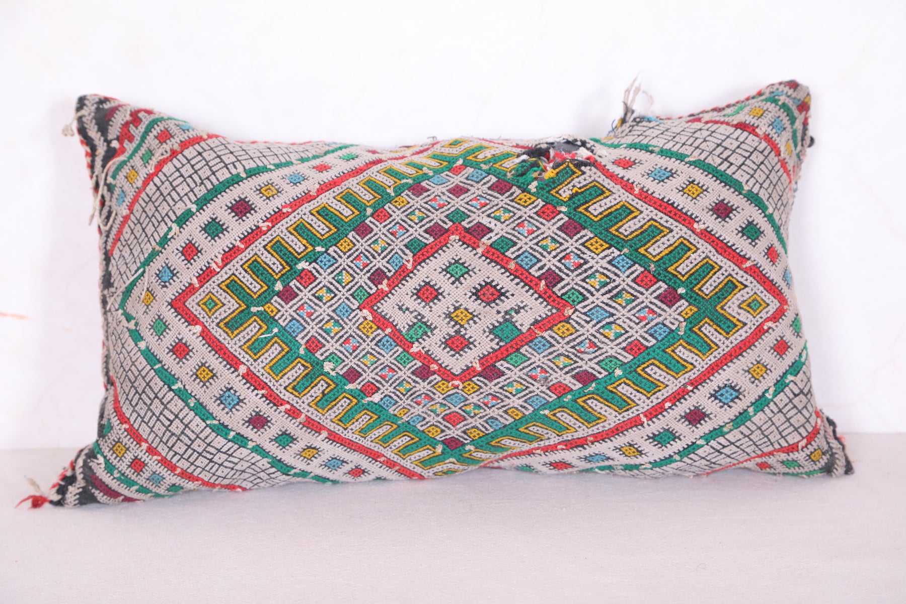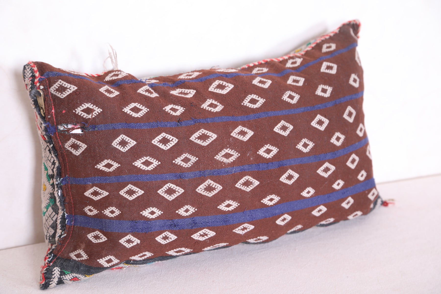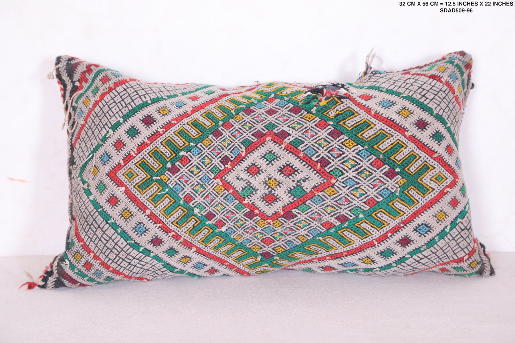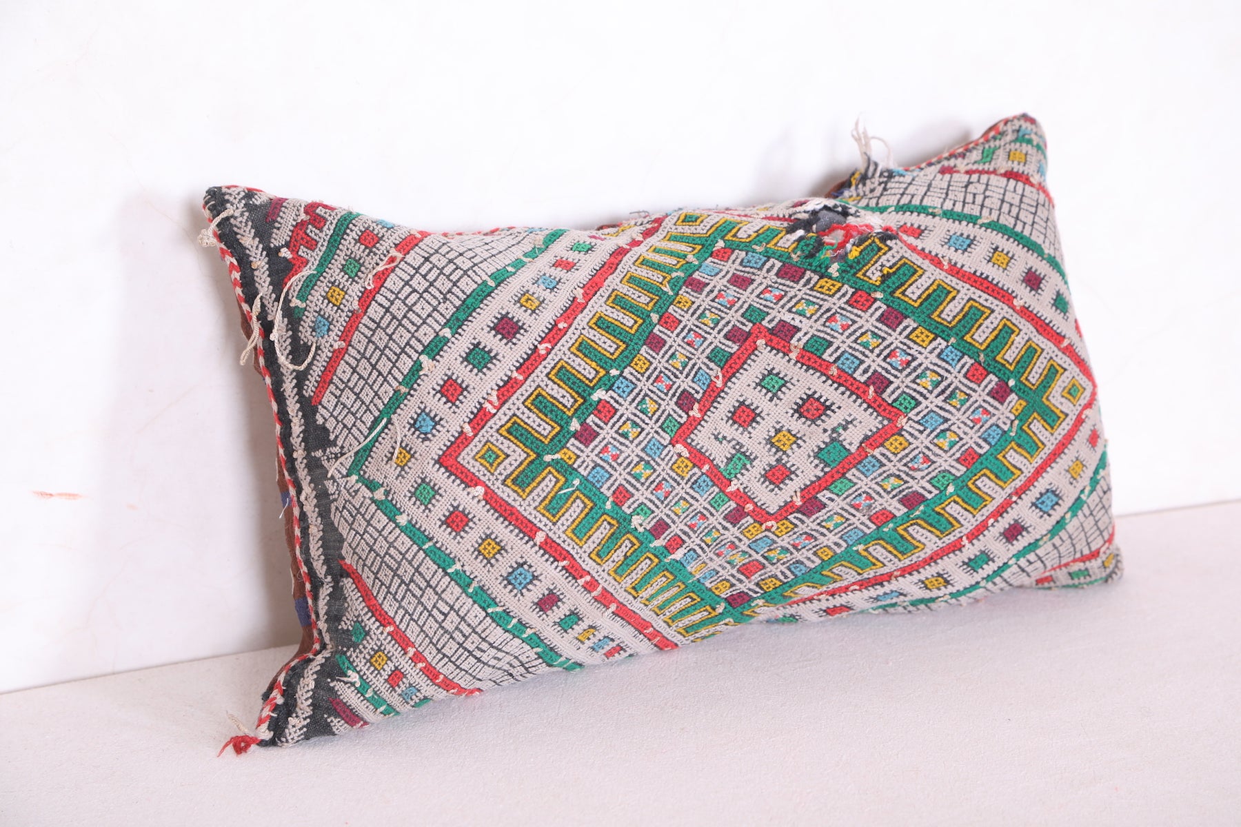 This 12.5 x 22 inches Vintage Berber Kilim Pillow features a bold central diamond medallion surrounded by vibrant tribal motifs in green, red, pink, and teal—handwoven with rich texture and timeless artistry. Ideal for beds, benches, or boho-inspired living spaces.