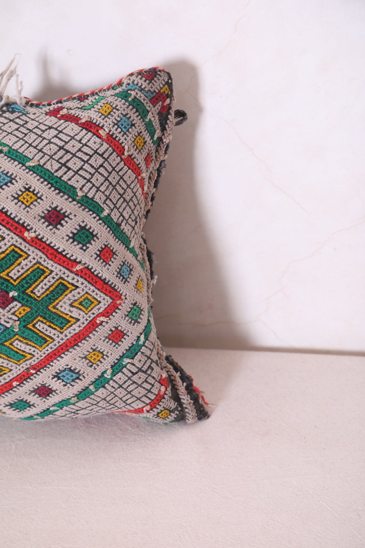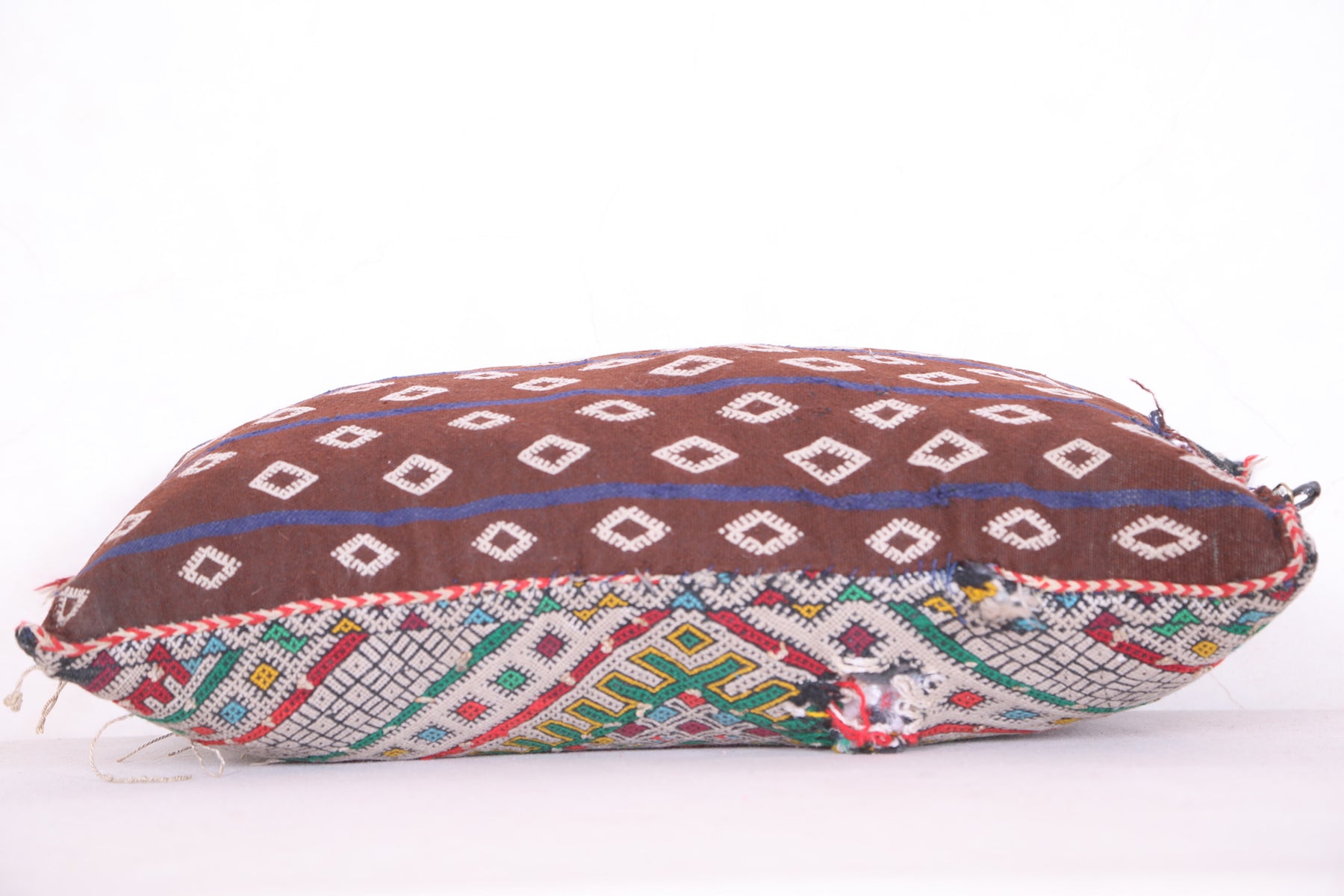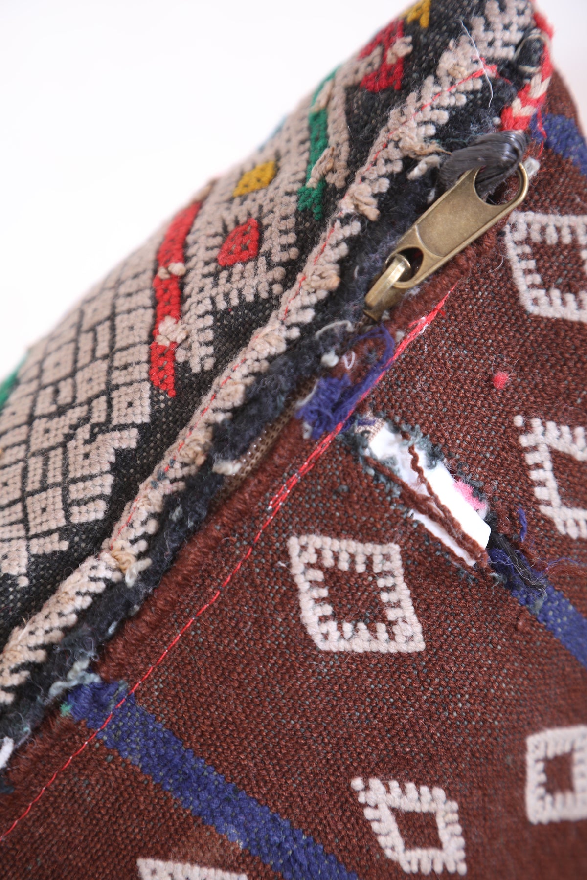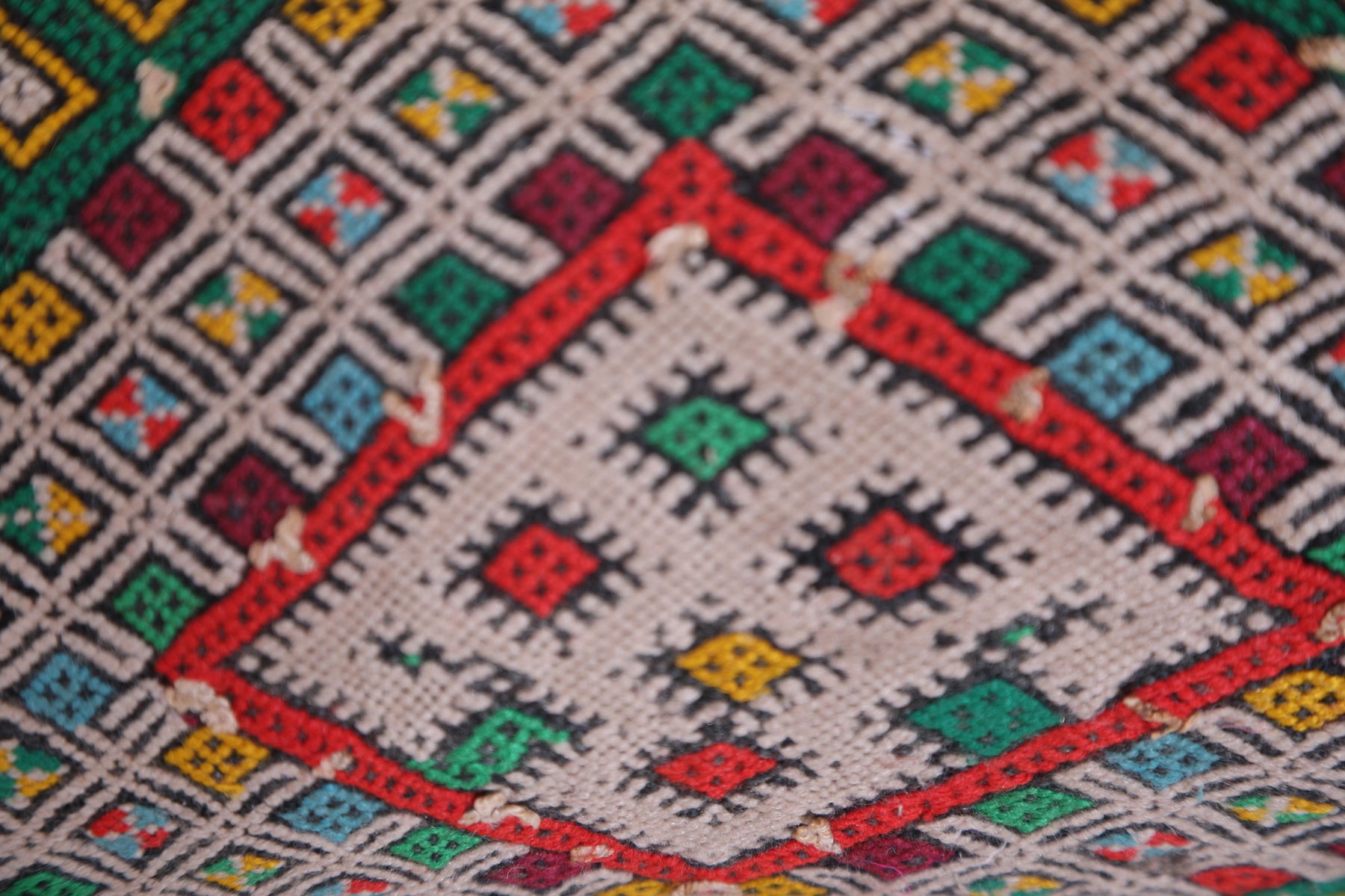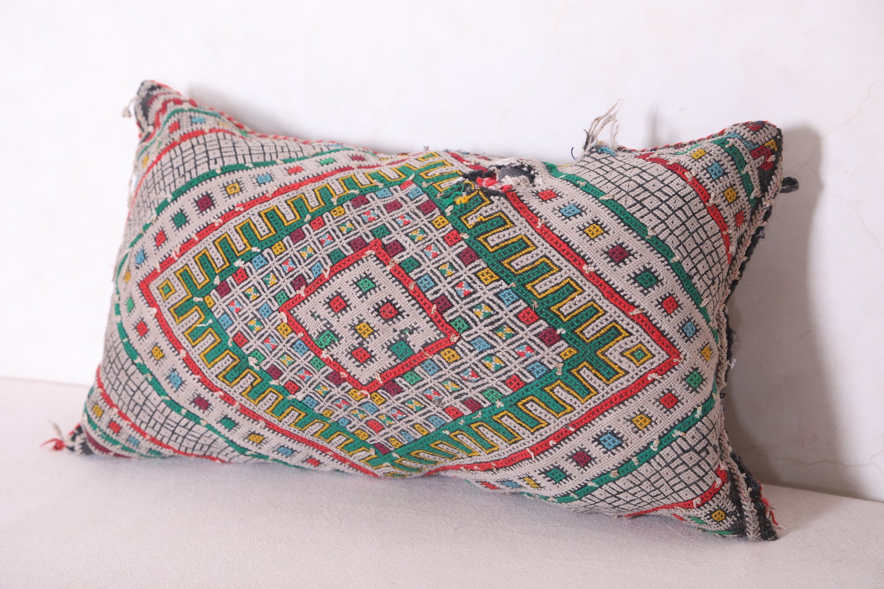 This 12.5 x 22 inches Vintage Berber Kilim Pillow features a bold central diamond medallion surrounded by vibrant tribal motifs in green, red, pink, and teal—handwoven with rich texture and timeless artistry. Ideal for beds, benches, or boho-inspired living spaces.
