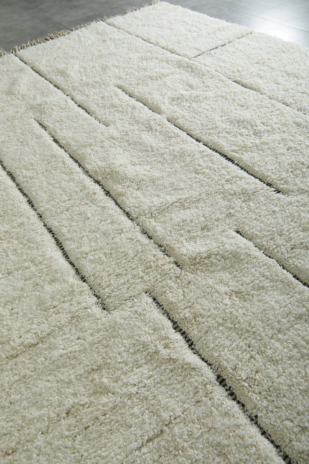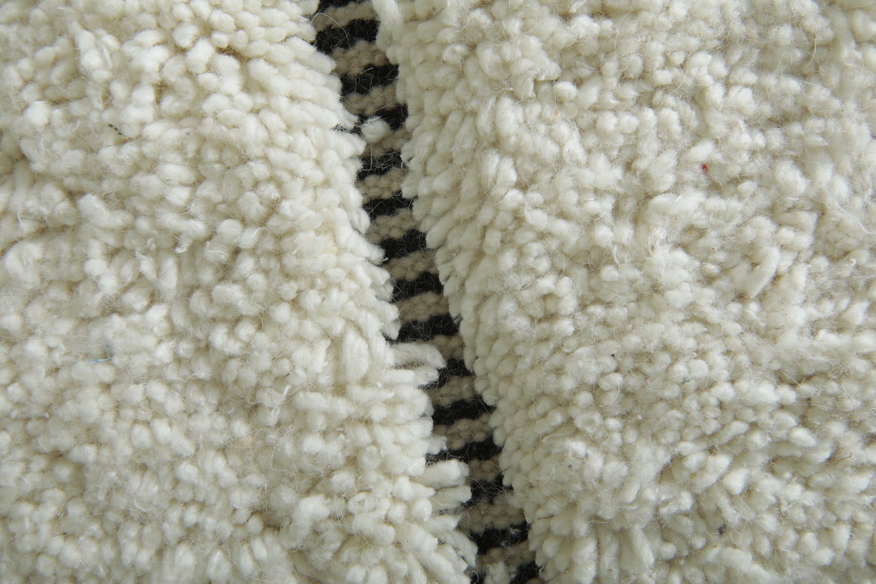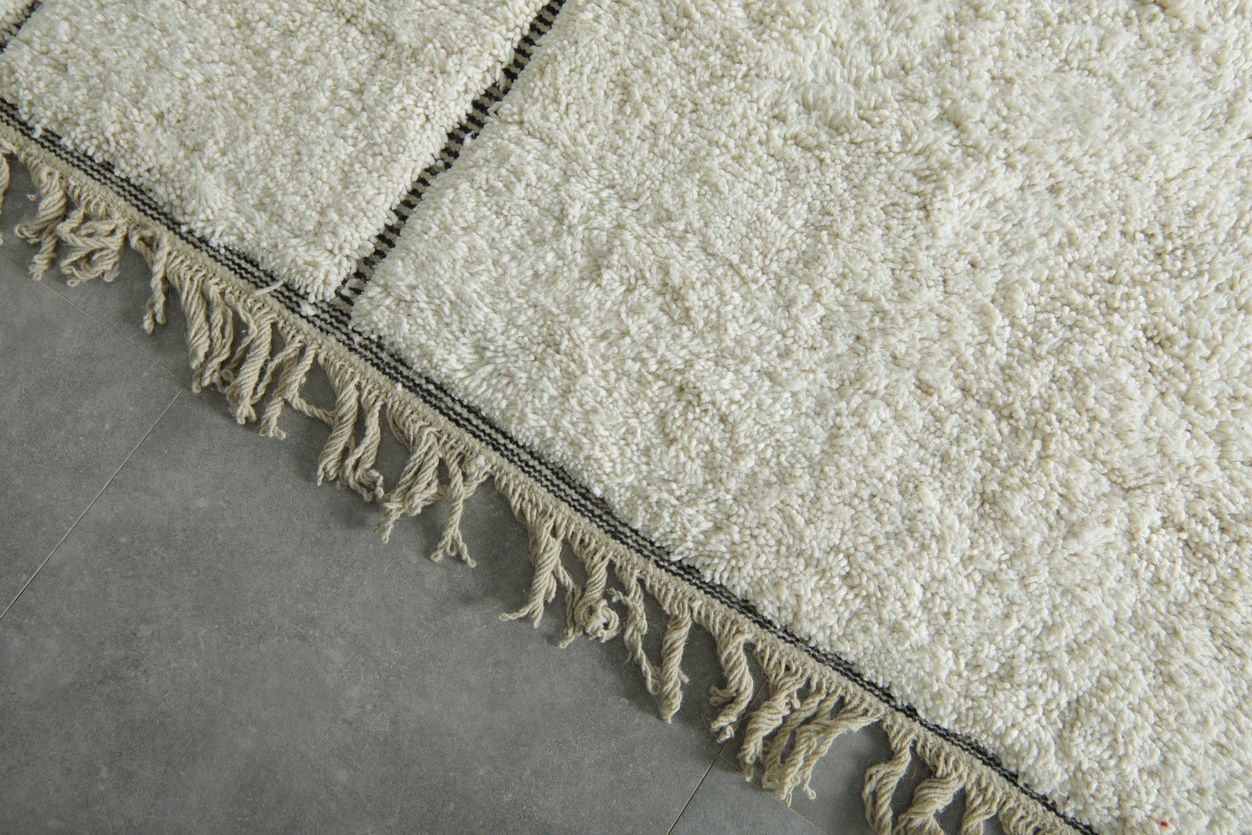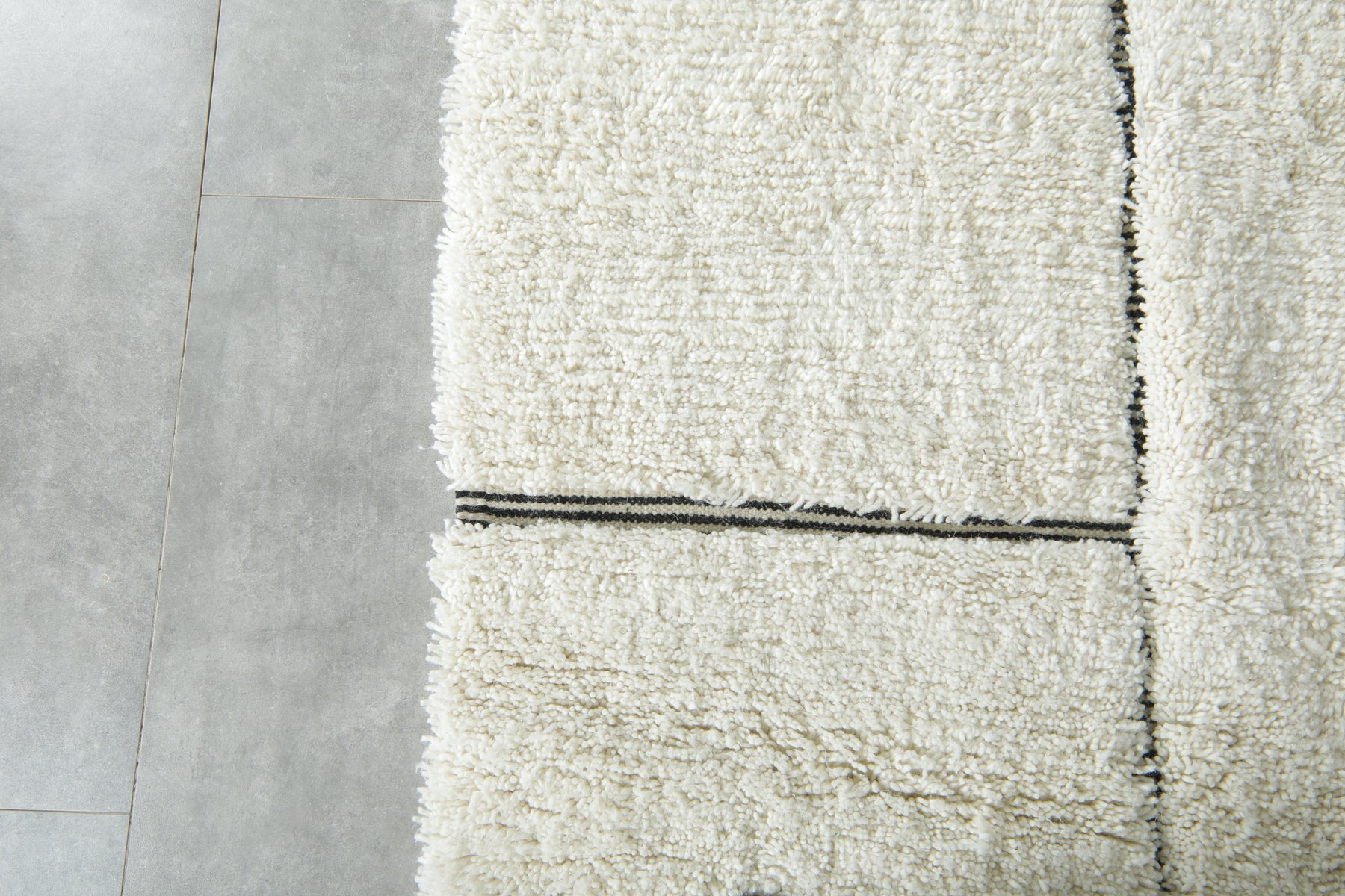 Bring warmth and minimal elegance to your home with this handwoven Moroccan Beni Ourain rug. Crafted with a pure white wool base and accented by bold, black geometric lines, this modern design adds visual interest without overwhelming your space. Its plush texture provides comfort and luxury underfoot, making it ideal for bedrooms, living rooms, or serene workspaces. A versatile statement rug that seamlessly fits into minimalist, modern, or eclectic interiors.