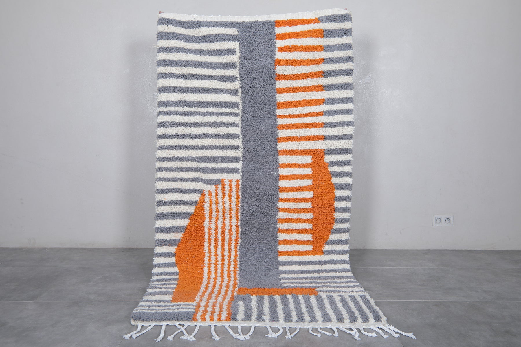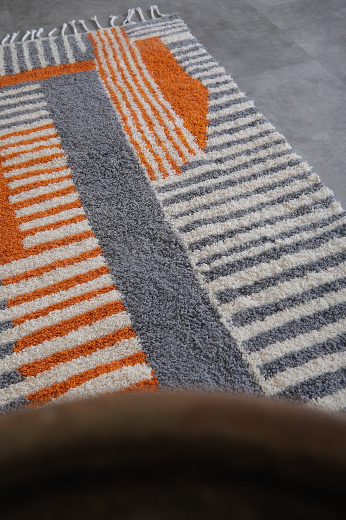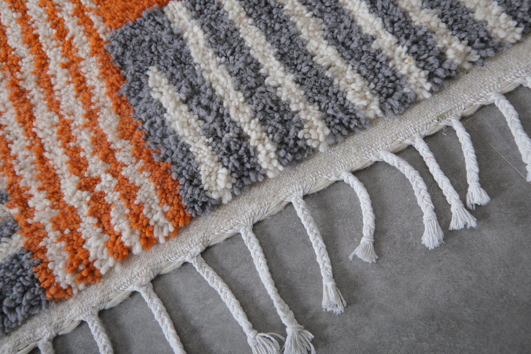 Add a bold and artistic touch to your space with this custom handmade Beni Ourain rug, crafted from premium Moroccan wool. This contemporary Berber rug combines traditional craftsmanship with a modern geometric design, blending grey, white, and orange tones into a stunning striped and abstract pattern.