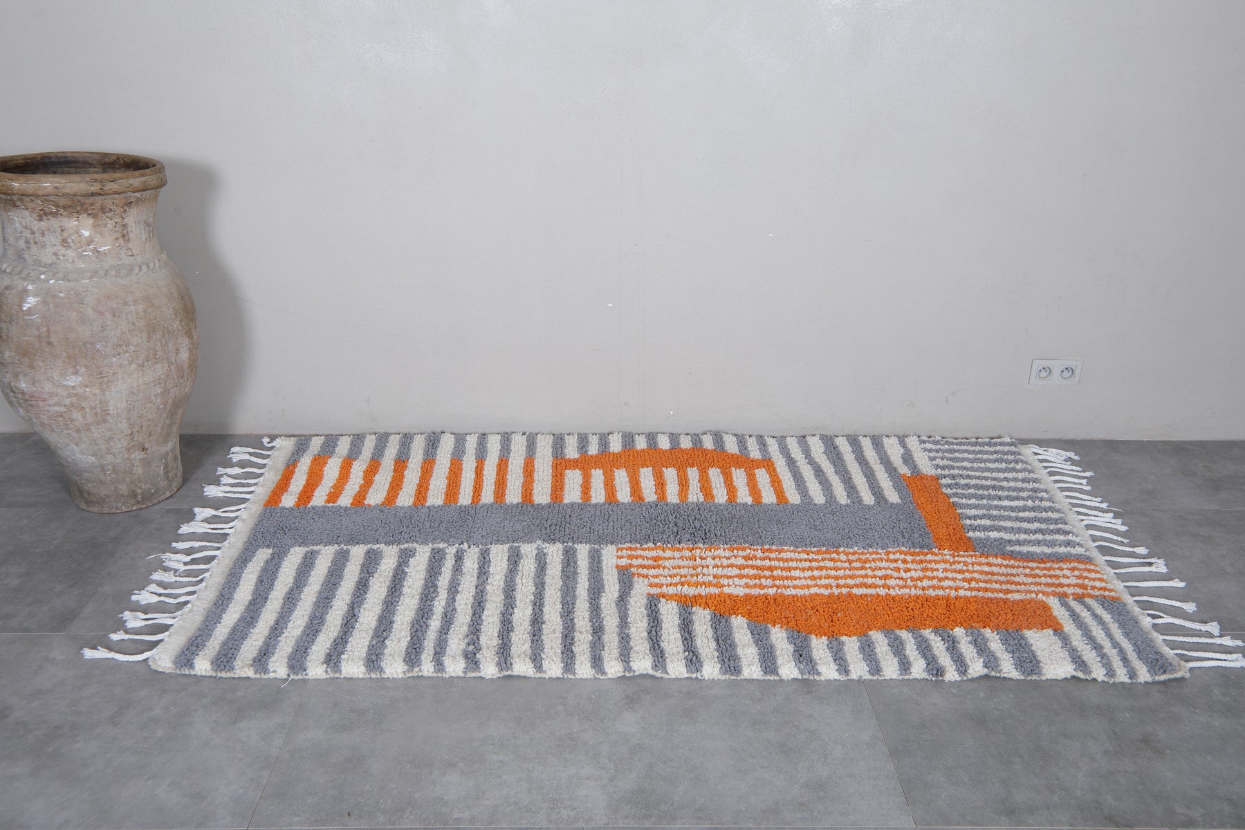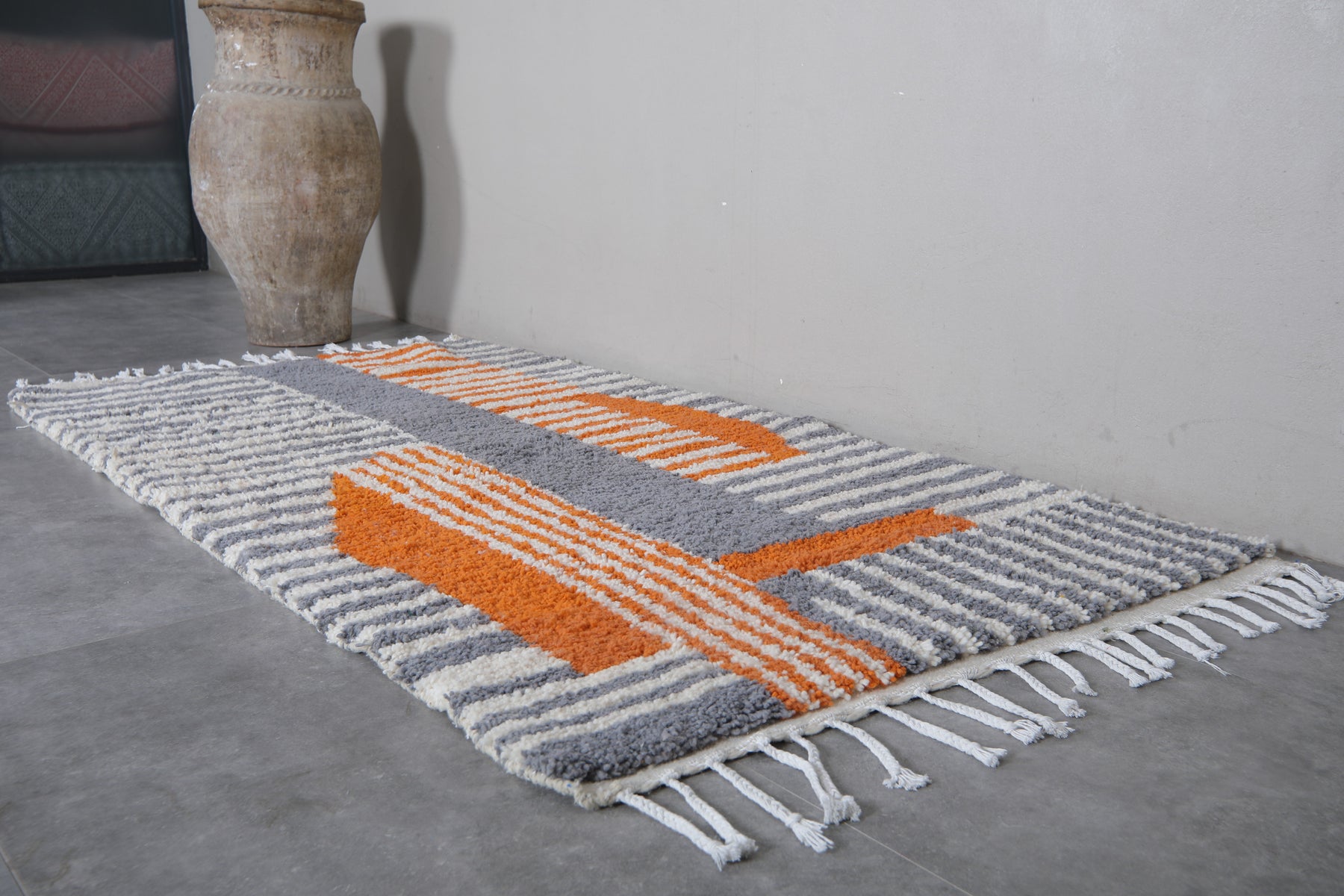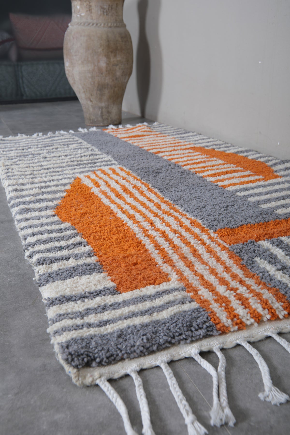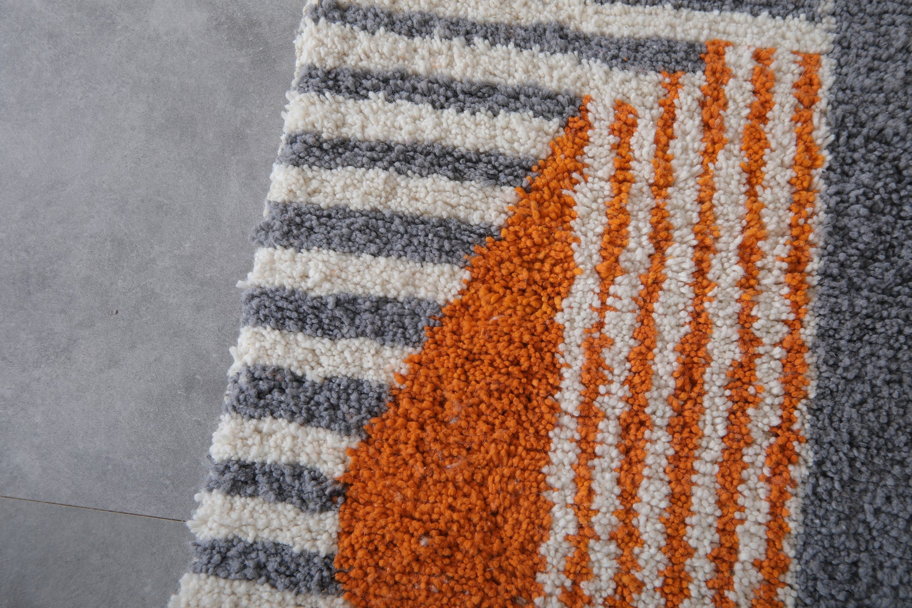 Add a bold and artistic touch to your space with this custom handmade Beni Ourain rug, crafted from premium Moroccan wool. This contemporary Berber rug combines traditional craftsmanship with a modern geometric design, blending grey, white, and orange tones into a stunning striped and abstract pattern.