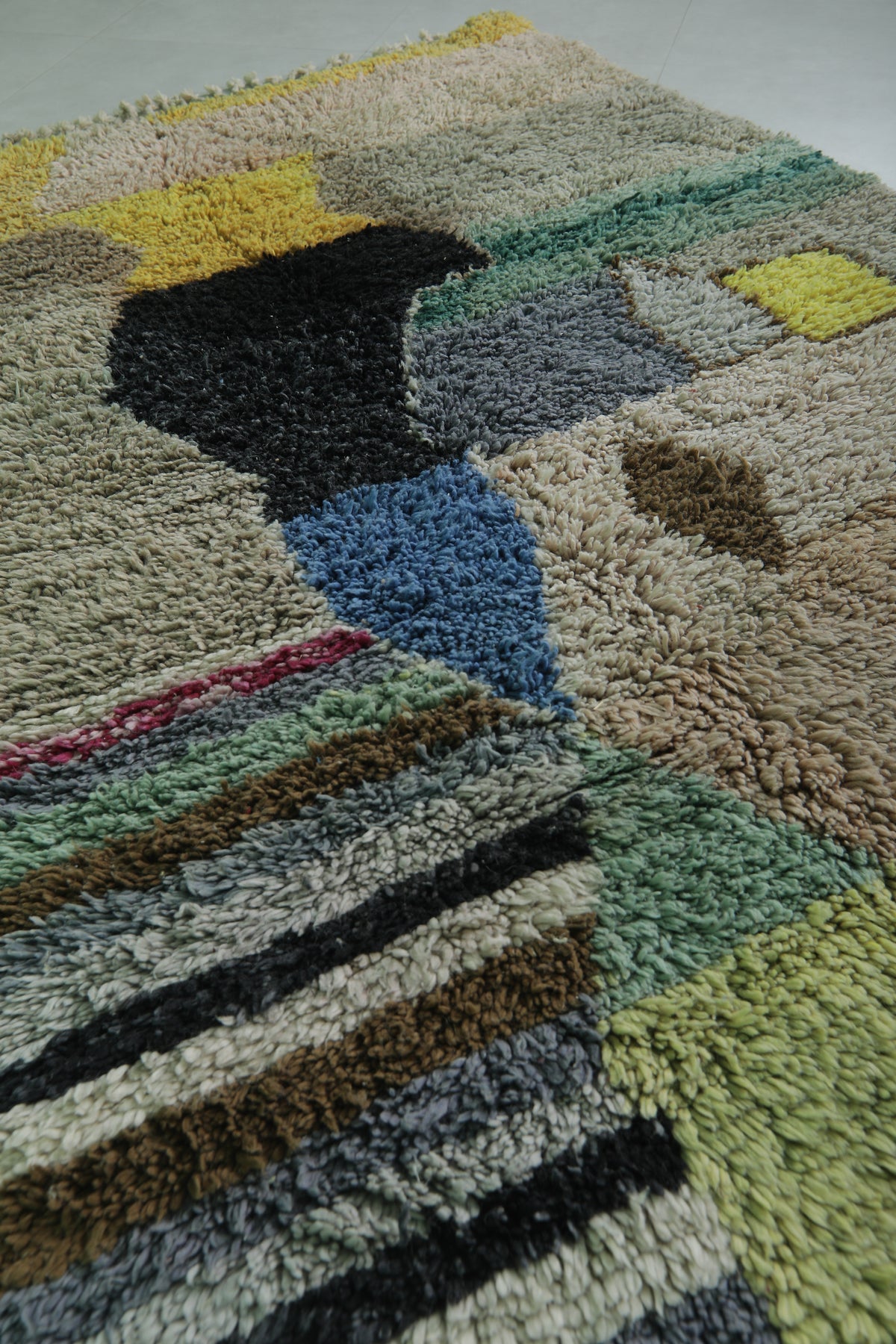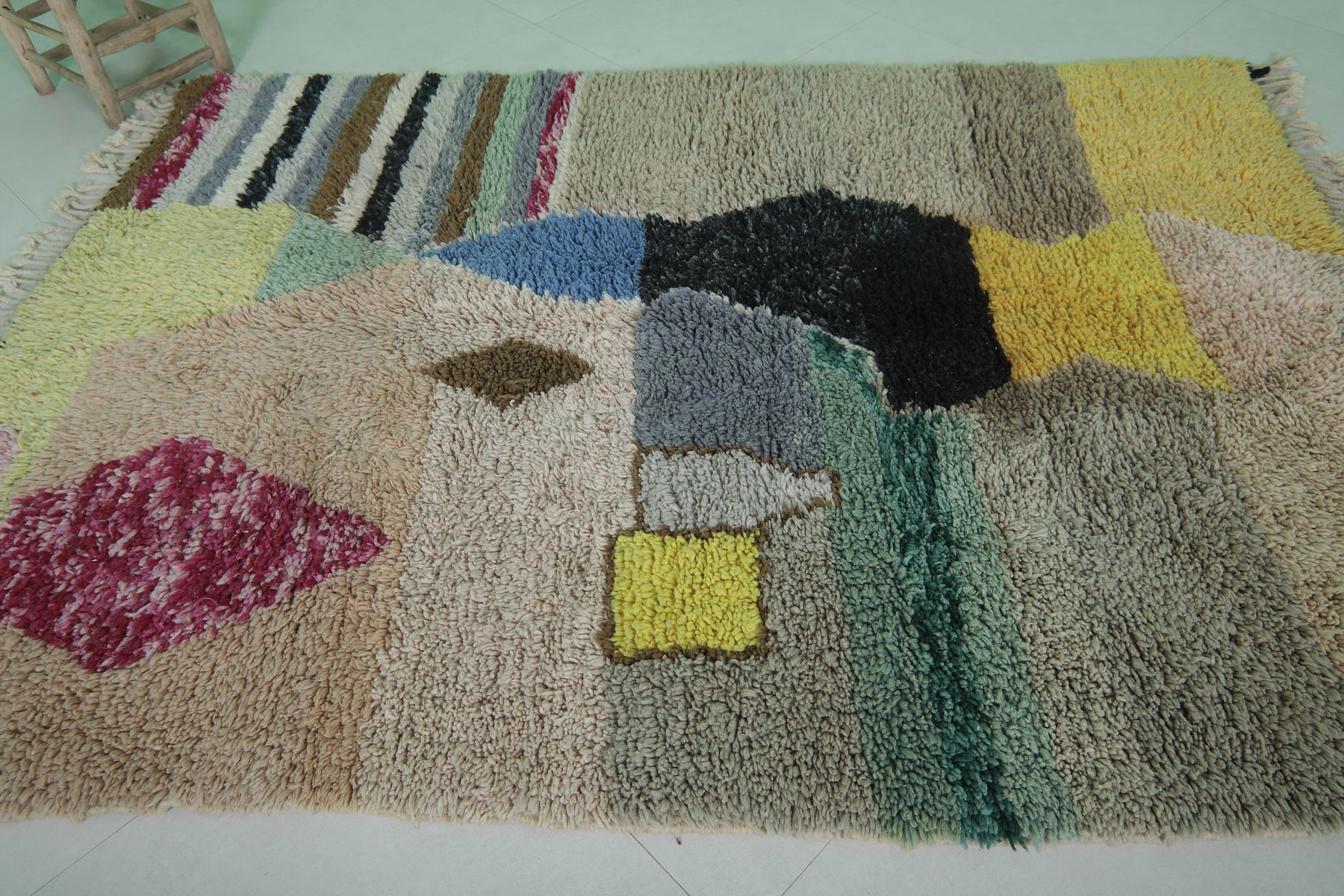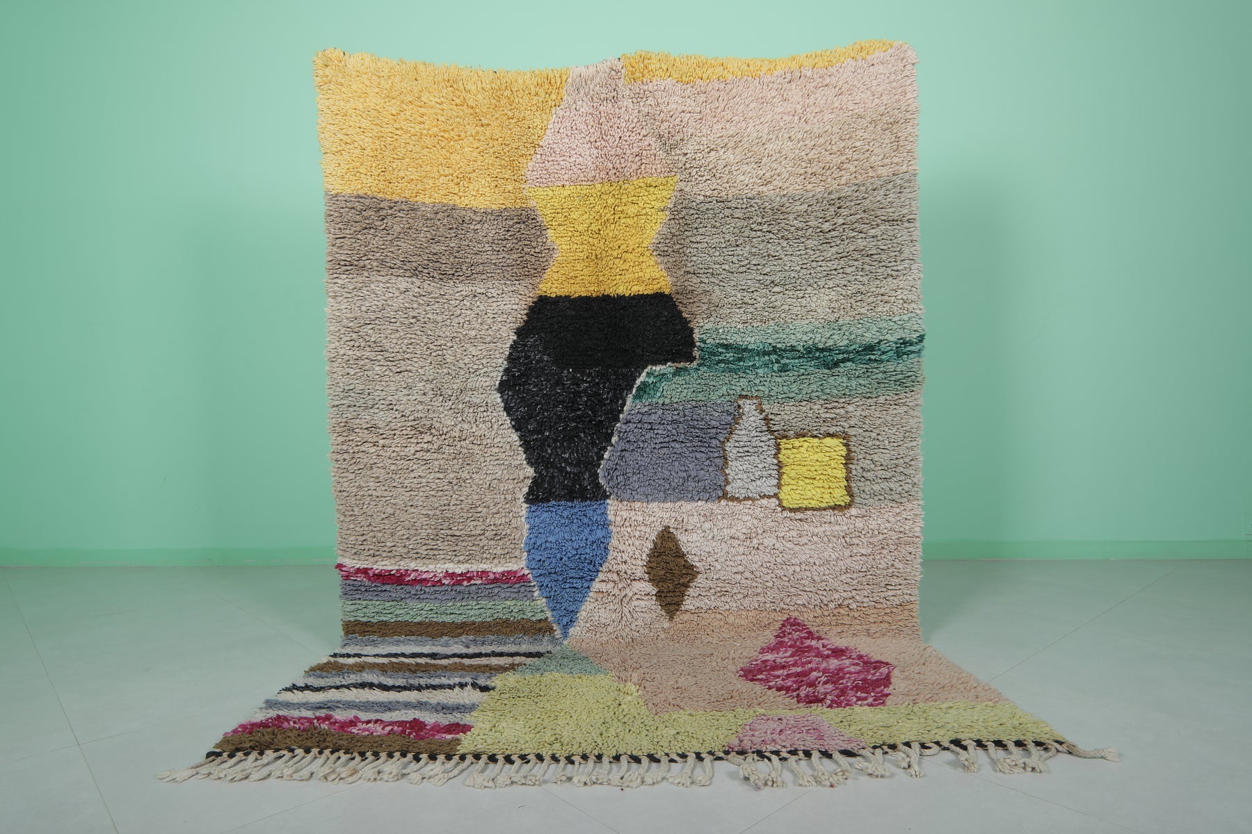 Elevate your space with this contemporary Moroccan rug, measuring 5.6 x 7.7 feet. Designed with modern sensibilities while honoring traditional Moroccan craftsmanship, this rug features sleek geometric patterns and soft neutral tones with bold color accents.