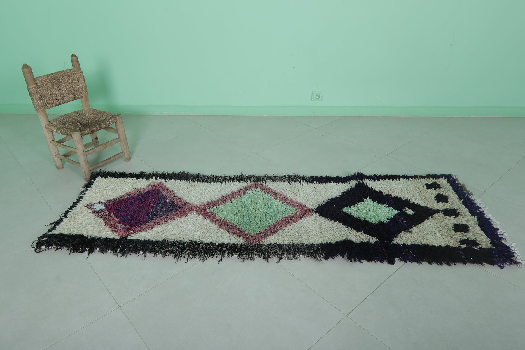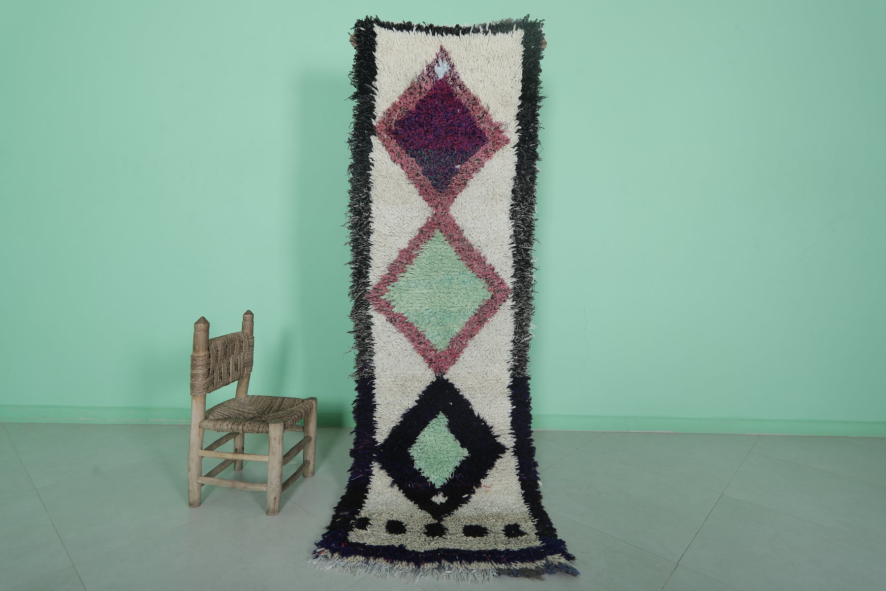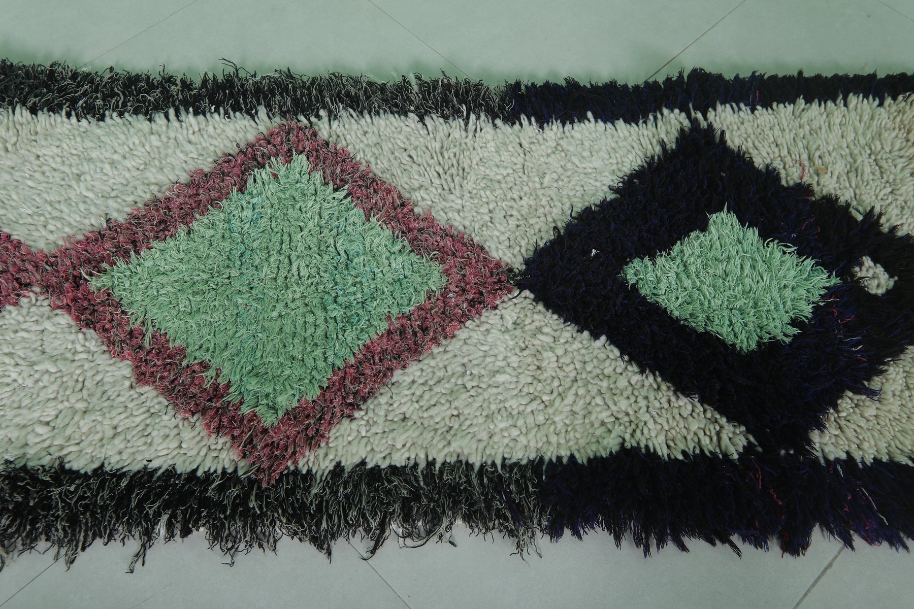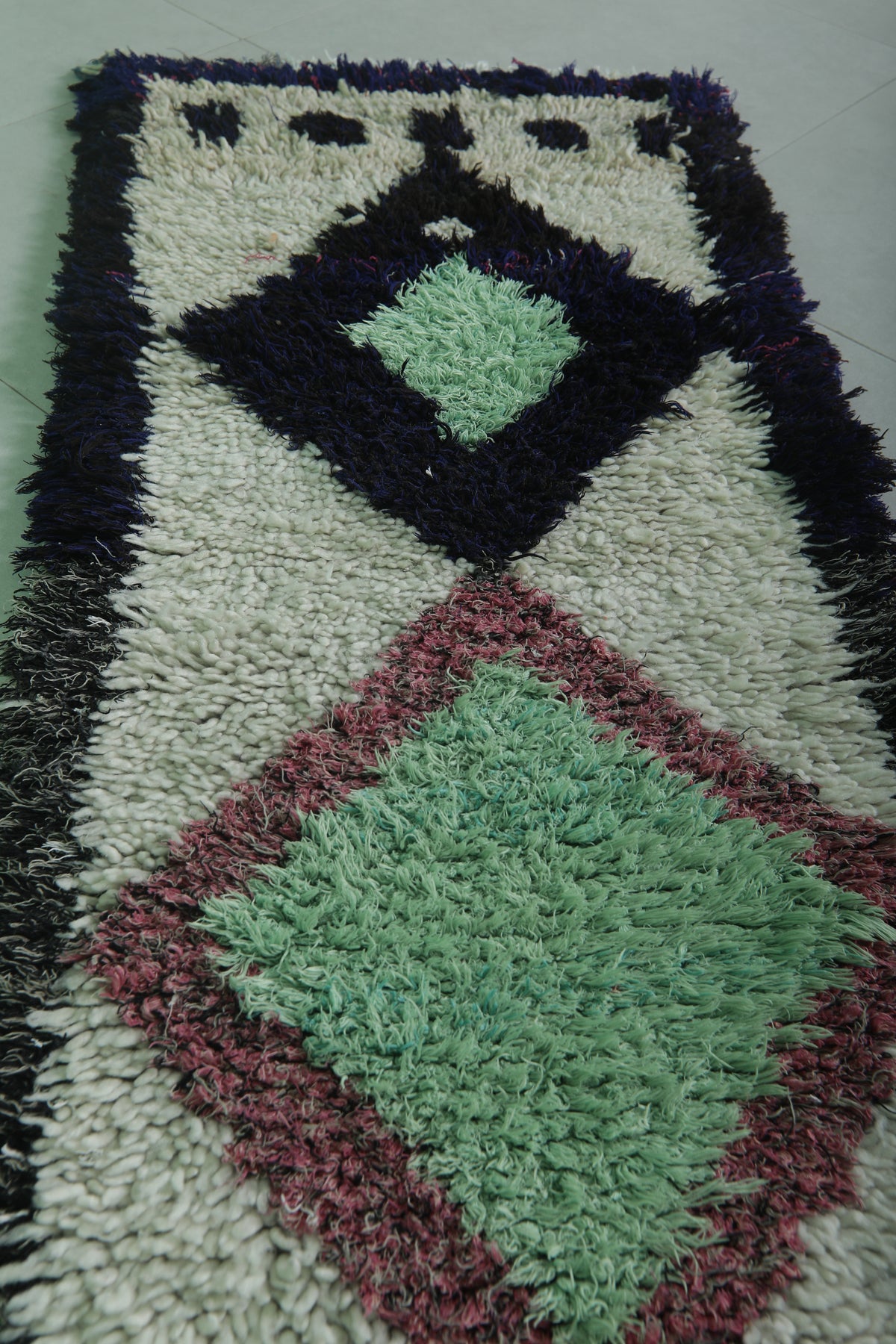 Elevate your interior with this Moroccan Berber rug, measuring 2.1 x 6.8 feet. Handwoven by skilled artisans, this exquisite piece features bold diamond patterns in purple, mint, and black on a soft cream background. Crafted from premium wool, it blends traditional craftsmanship with modern aesthetics, offering both warmth and durability. Ideal for hallways, entryways, or as a statement piece in narrow spaces.