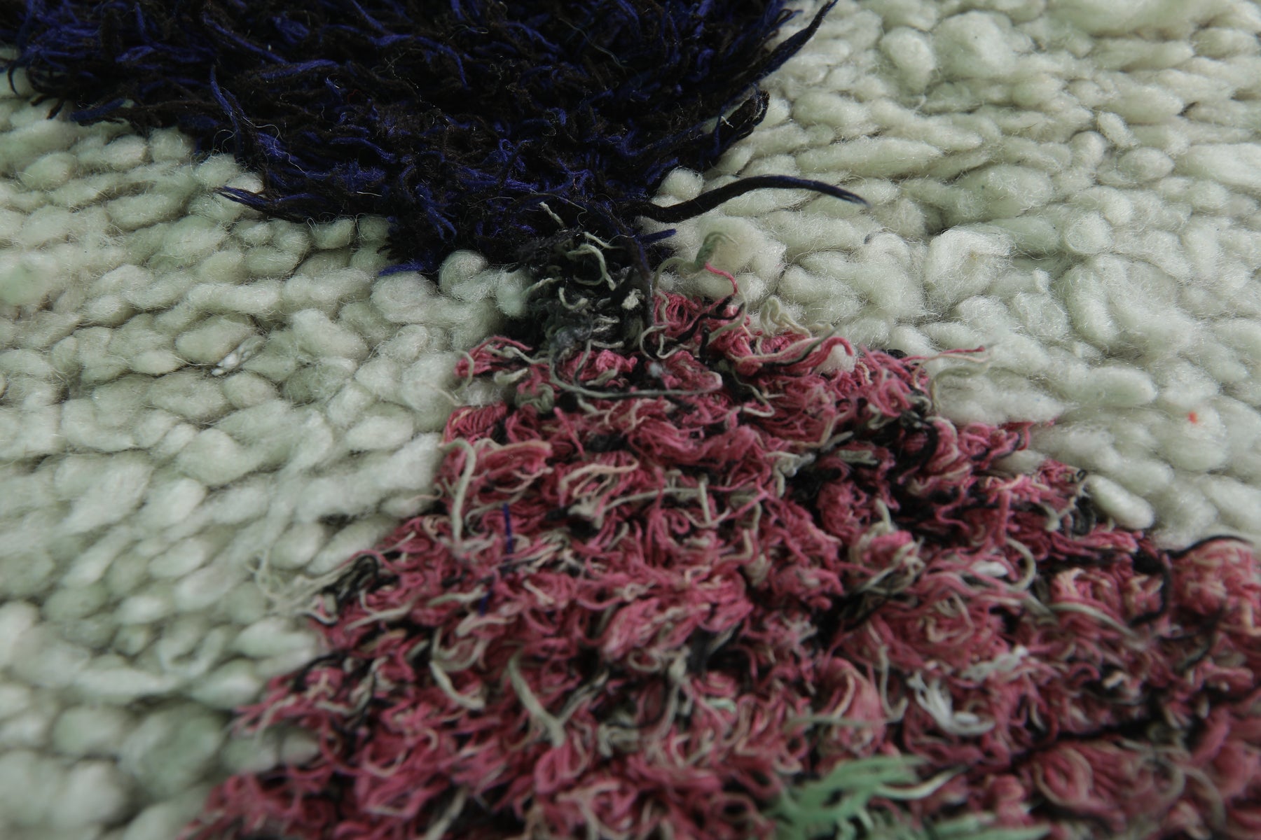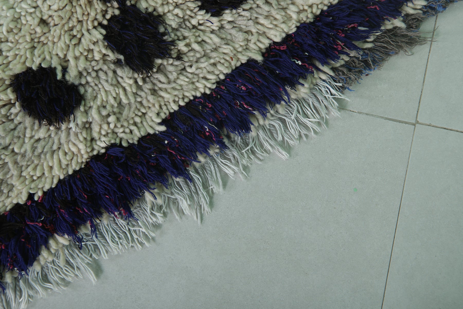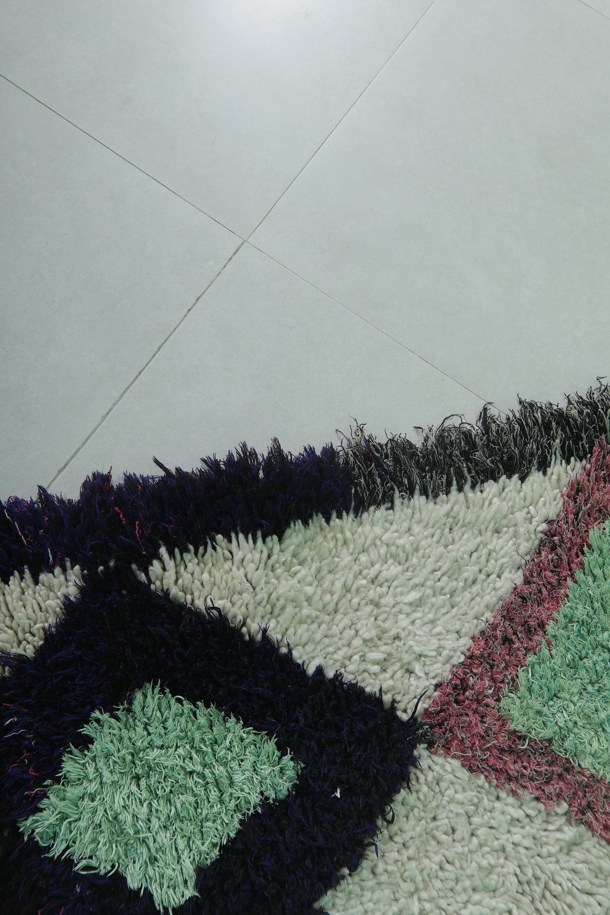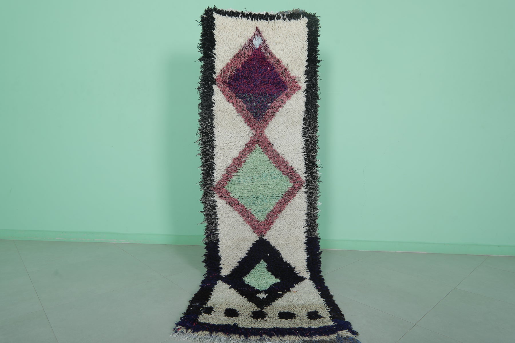 Elevate your interior with this Moroccan Berber rug, measuring 2.1 x 6.8 feet. Handwoven by skilled artisans, this exquisite piece features bold diamond patterns in purple, mint, and black on a soft cream background. Crafted from premium wool, it blends traditional craftsmanship with modern aesthetics, offering both warmth and durability. Ideal for hallways, entryways, or as a statement piece in narrow spaces.