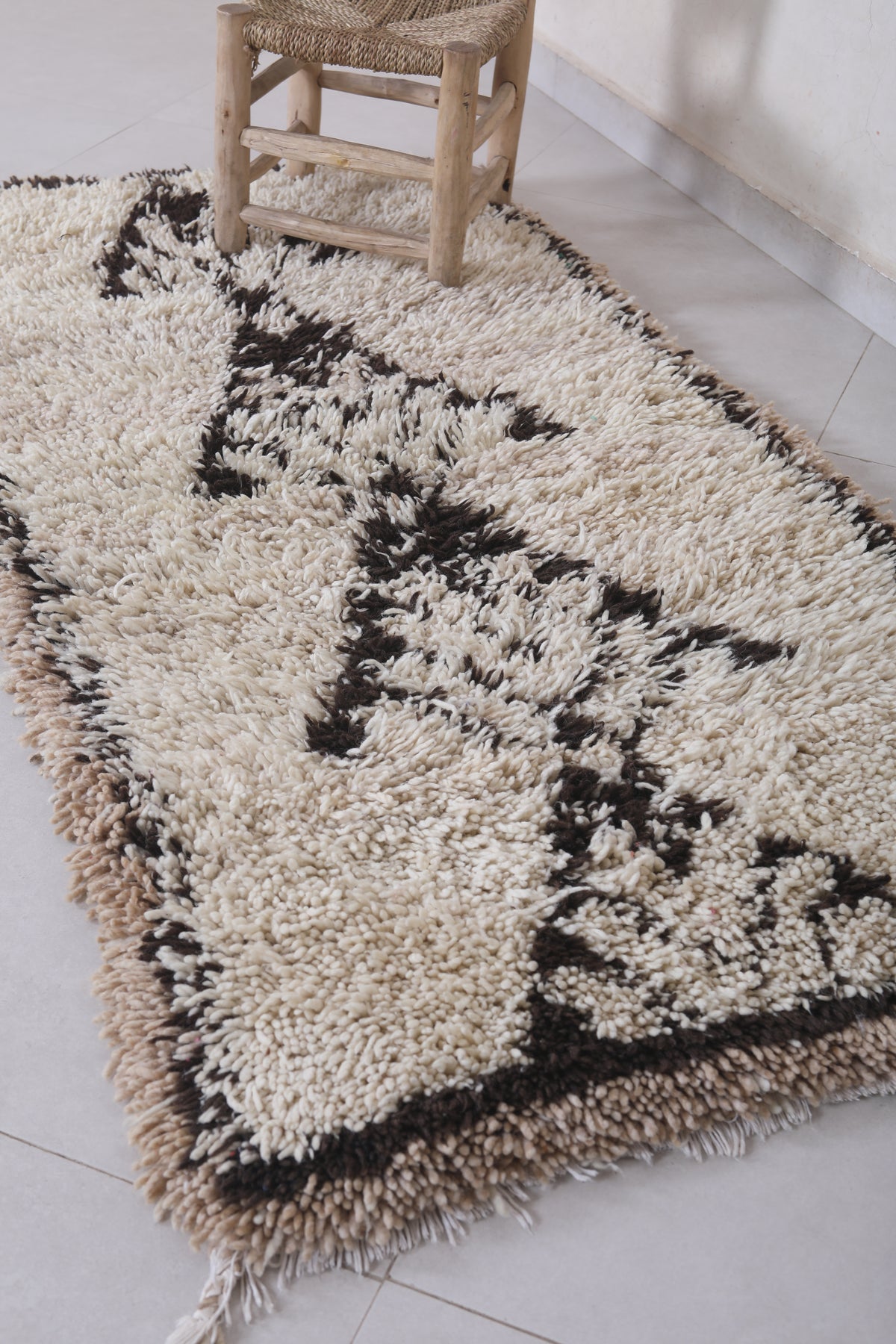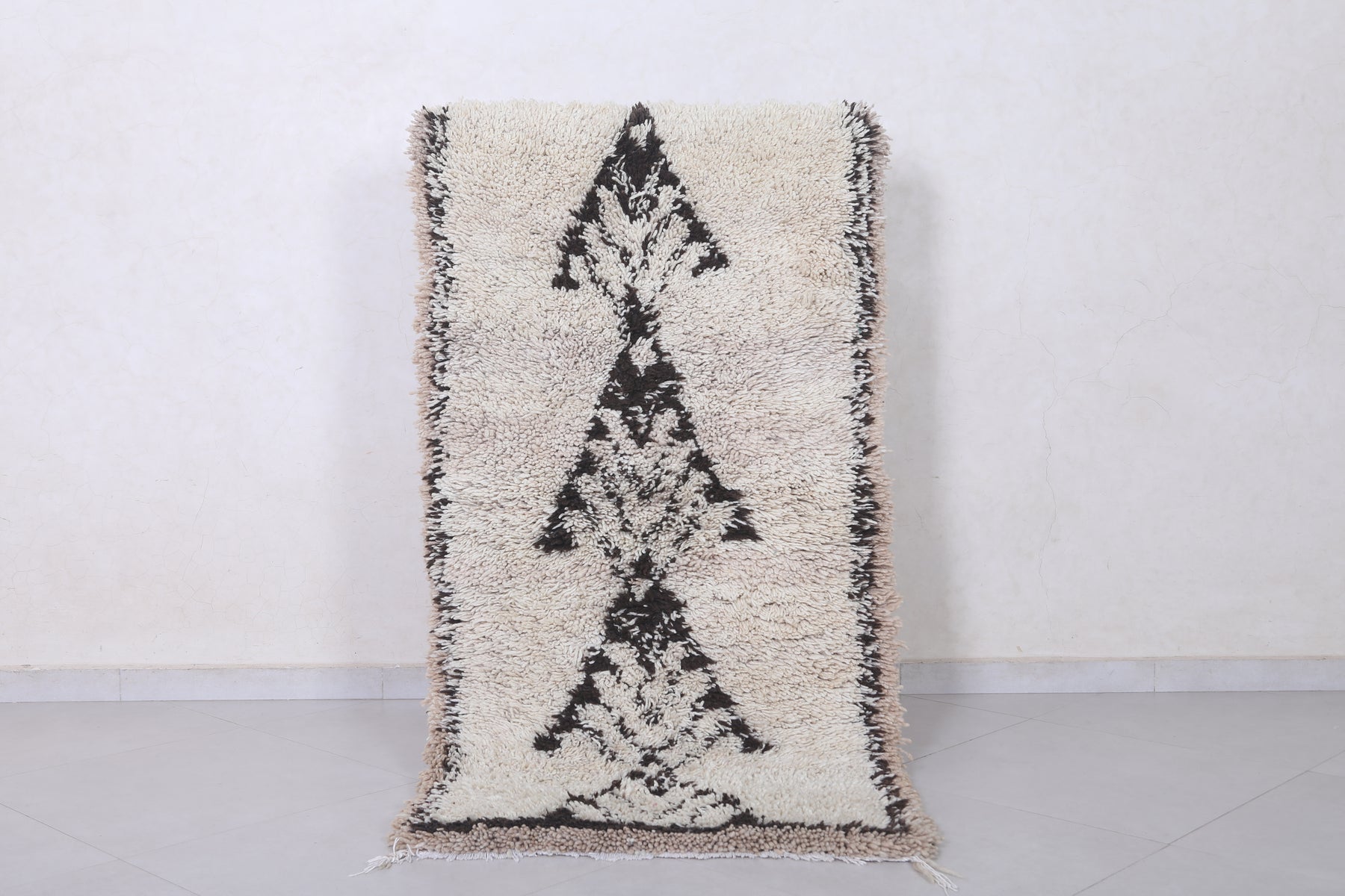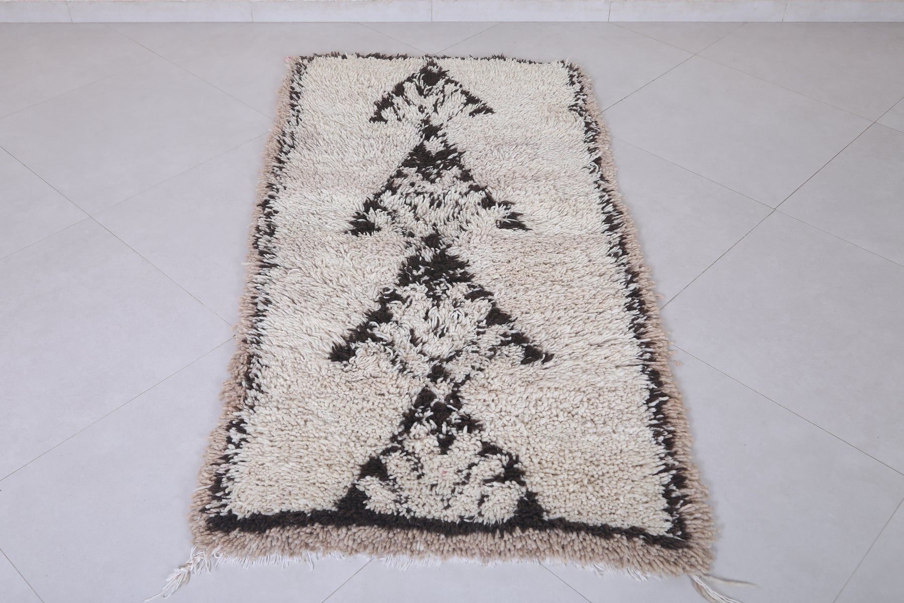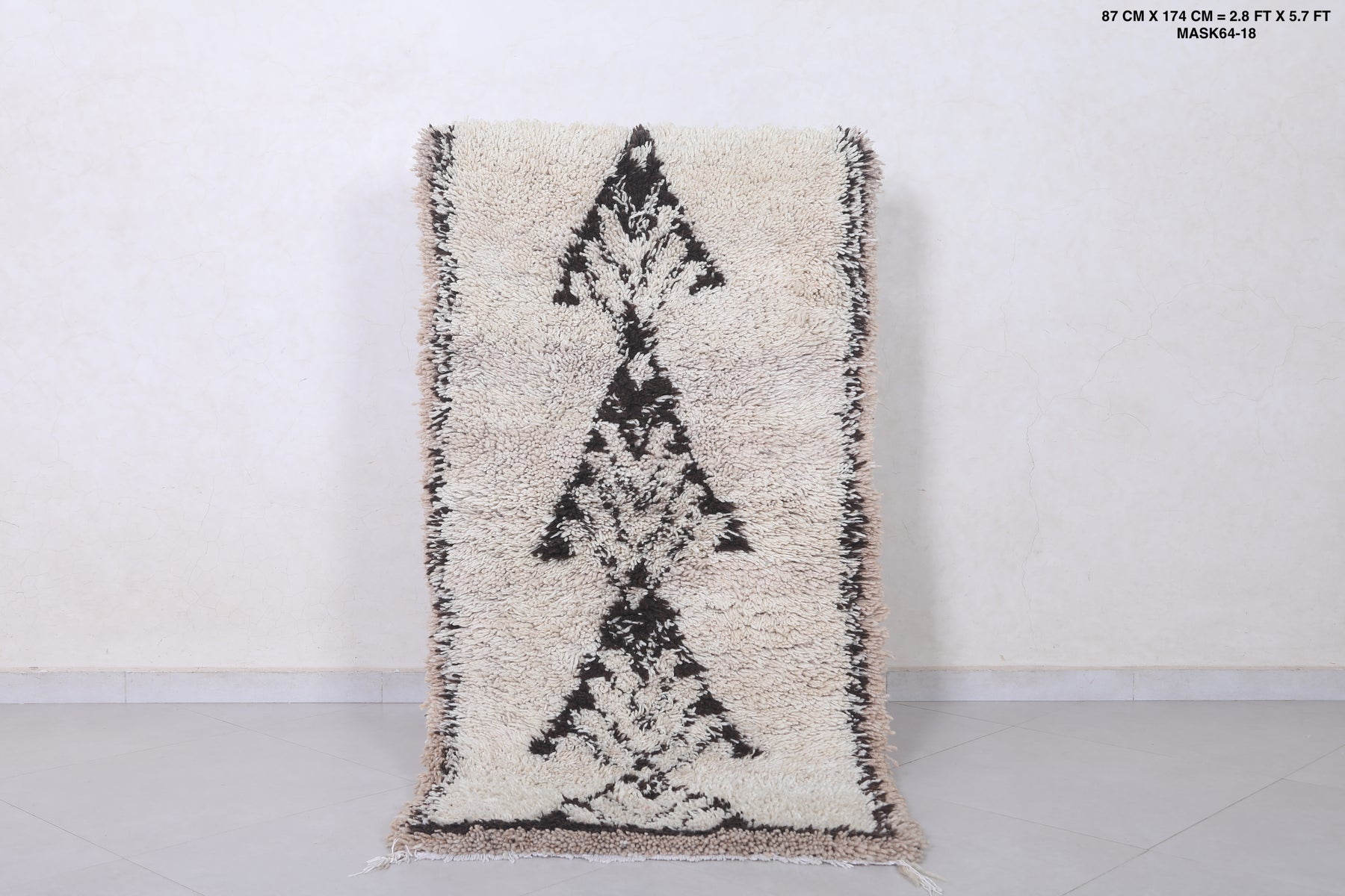 Discover the timeless charm of this Moroccan Berber rug, measuring 2.8 x 5.7 feet. Handwoven by skilled artisans, this stunning piece features intricate tribal designs in deep black on a soft ivory background, blending tradition with modern appeal. Crafted from premium wool, it offers a plush texture, warmth, and durability, making it perfect for adding character to living rooms, bedrooms, or cozy reading spaces.