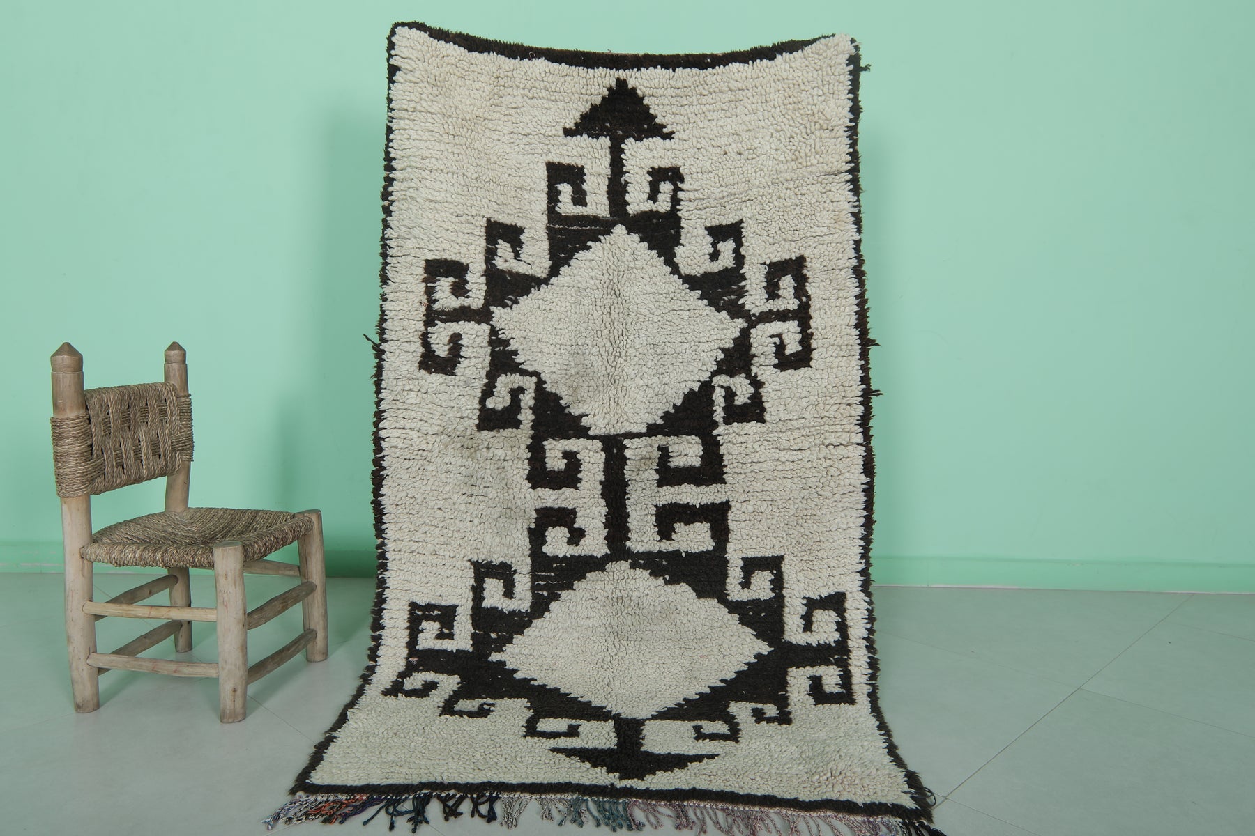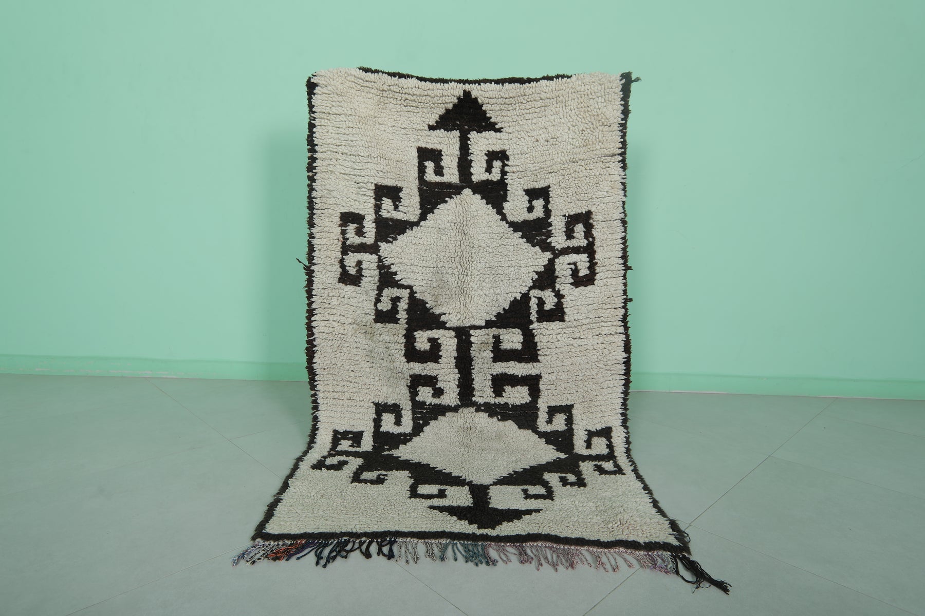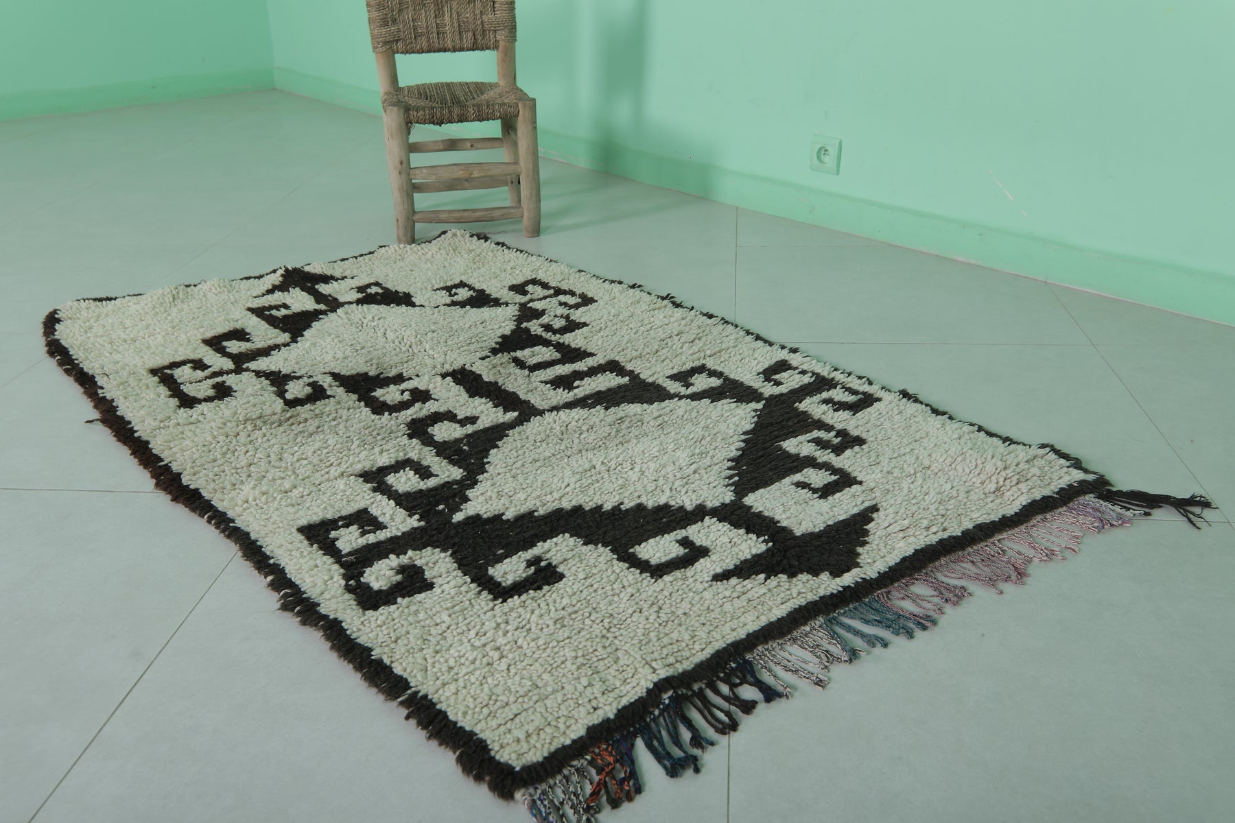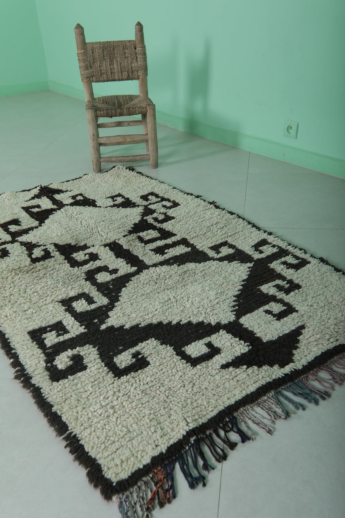 Add warmth and charm to your space with this Moroccan Berber rug, measuring 3.2 x 5.3 feet. Handwoven by skilled artisans, this striking piece features a bold black and cream geometric design, blending cultural heritage with modern sophistication. Crafted from premium wool, it offers durability, plush comfort, and a luxurious feel. Perfect for living rooms, bedrooms, or office decor, bringing timeless elegance to any interior.