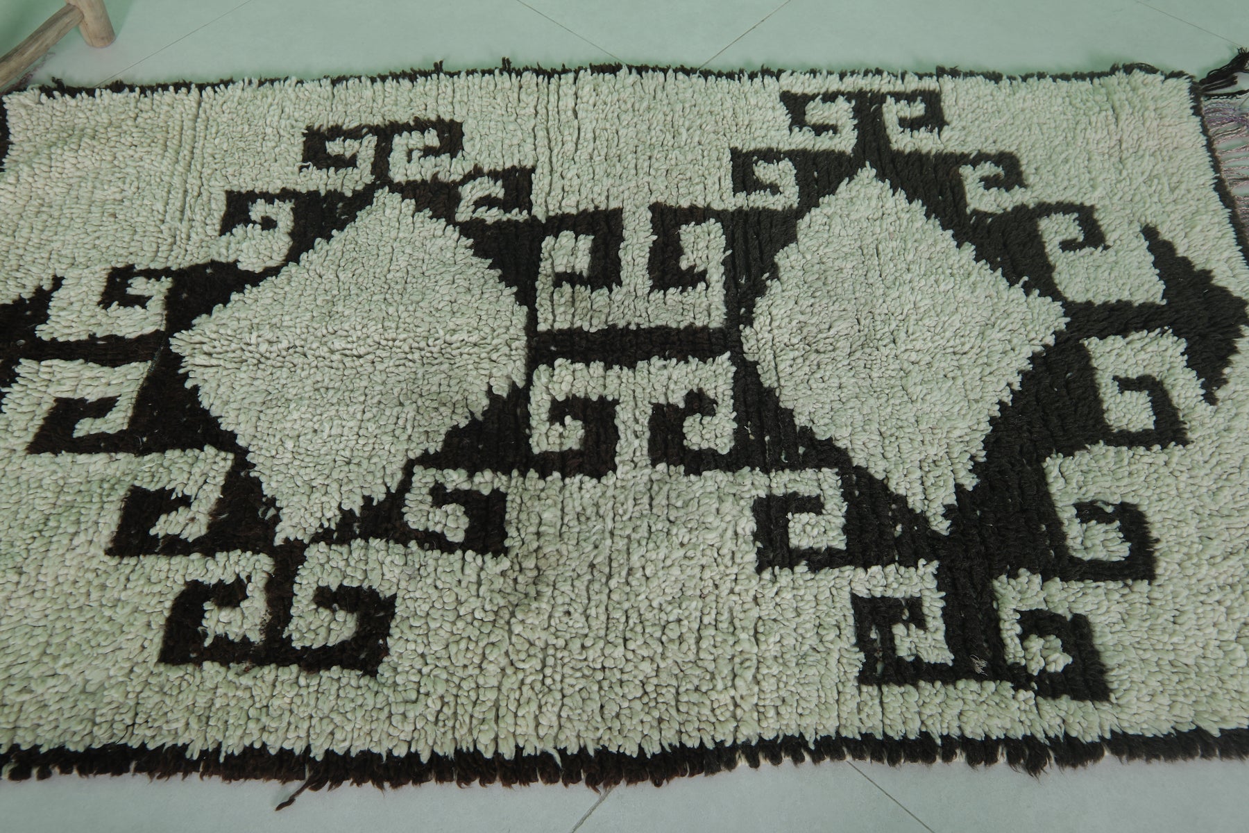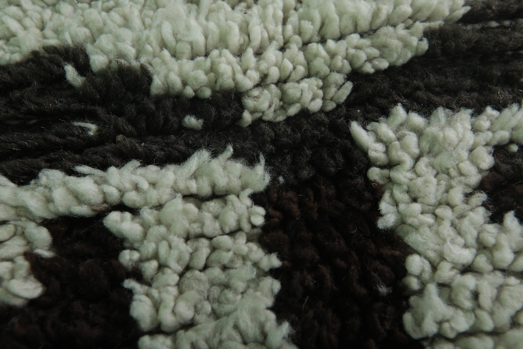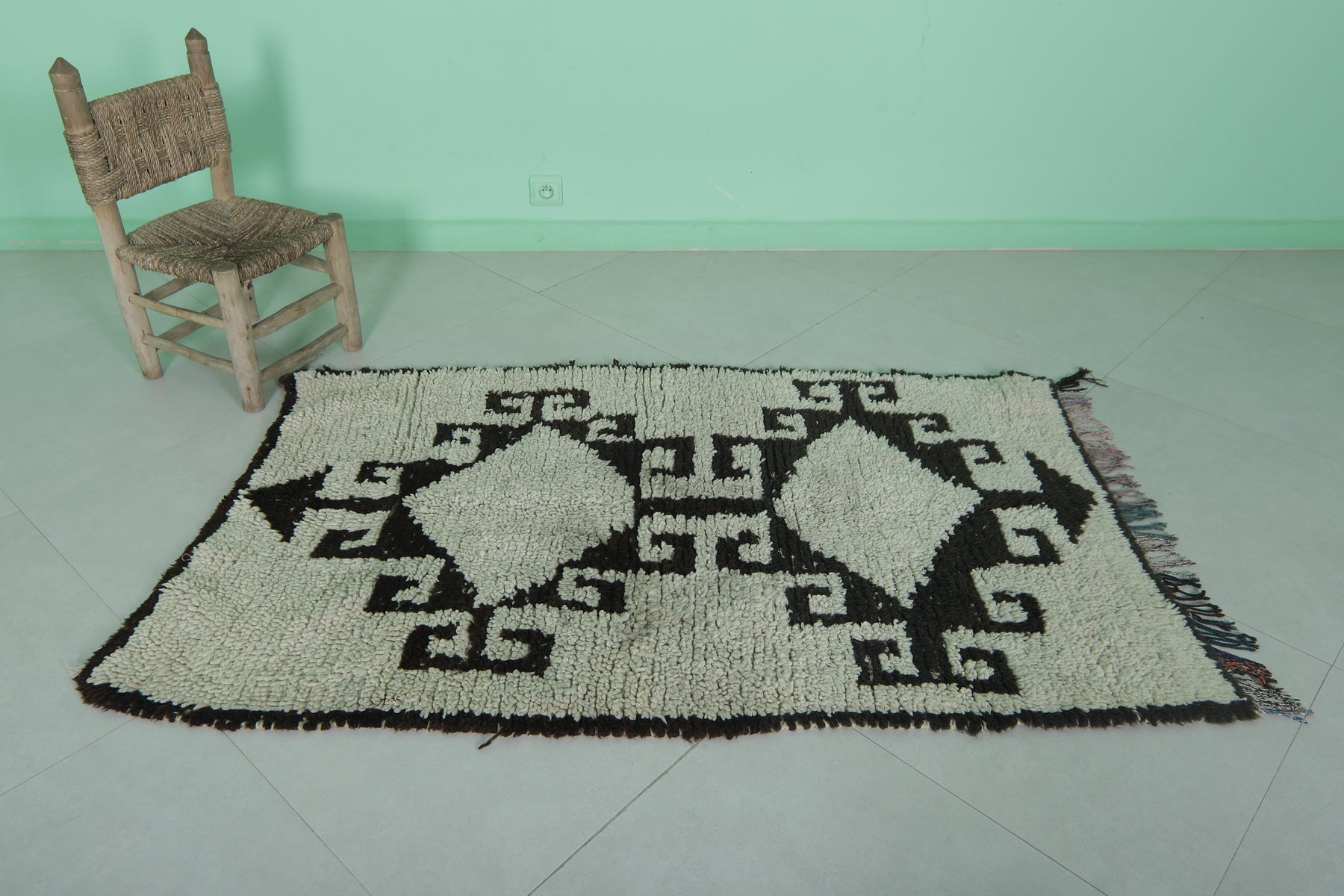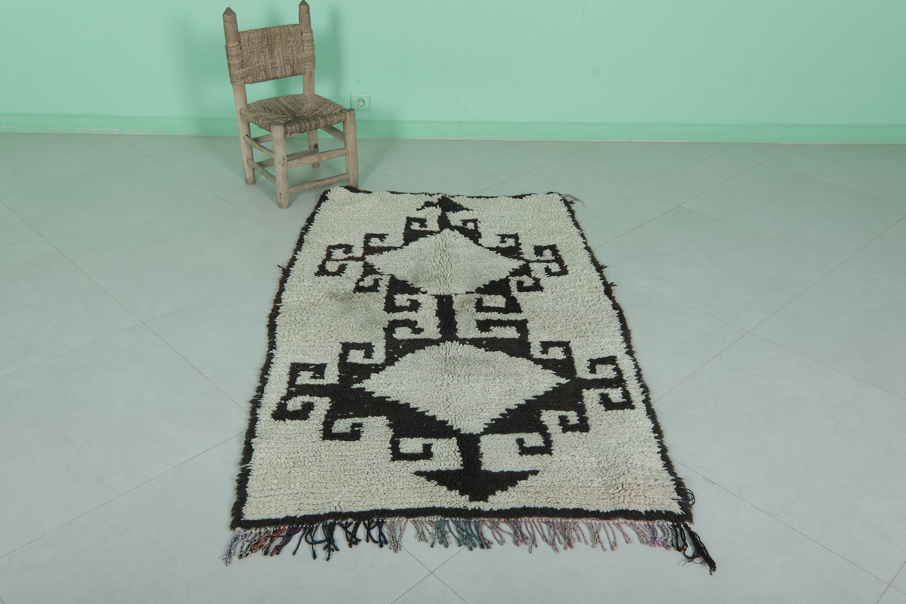 Add warmth and charm to your space with this Moroccan Berber rug, measuring 3.2 x 5.3 feet. Handwoven by skilled artisans, this striking piece features a bold black and cream geometric design, blending cultural heritage with modern sophistication. Crafted from premium wool, it offers durability, plush comfort, and a luxurious feel. Perfect for living rooms, bedrooms, or office decor, bringing timeless elegance to any interior.
