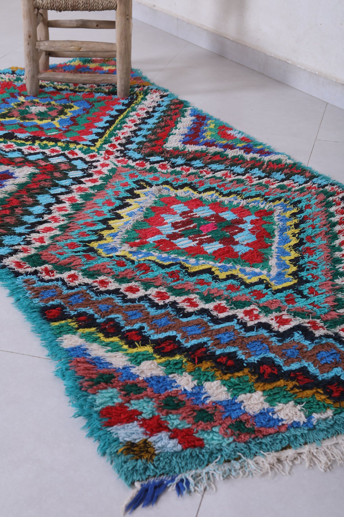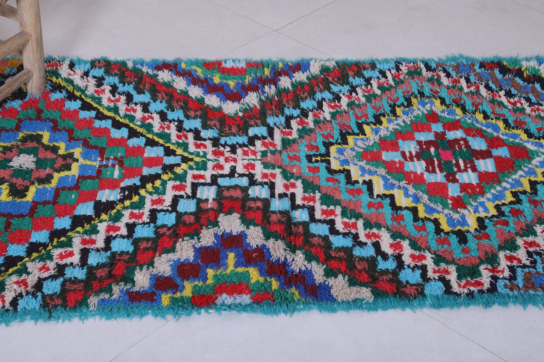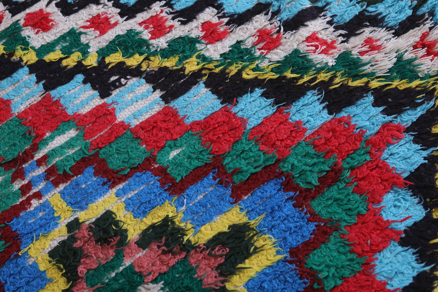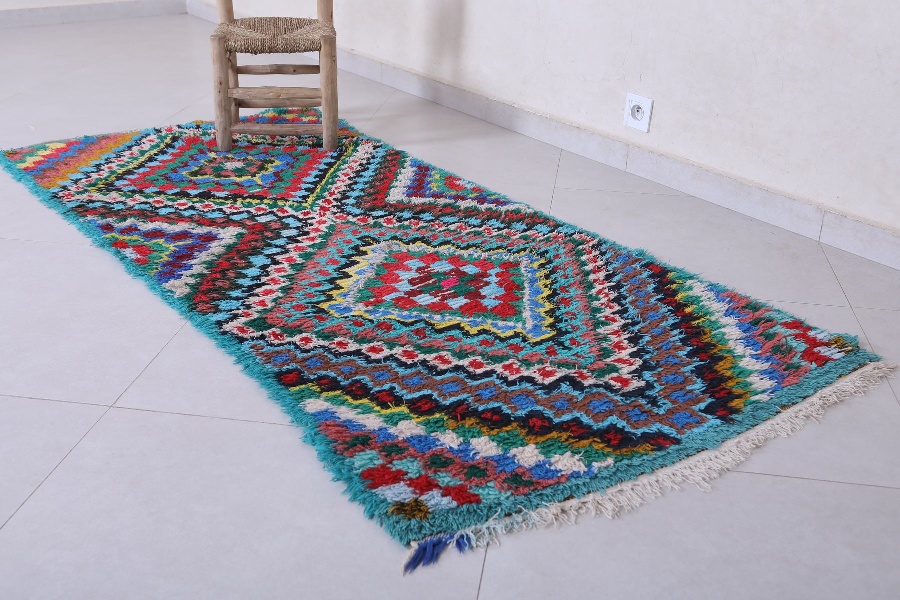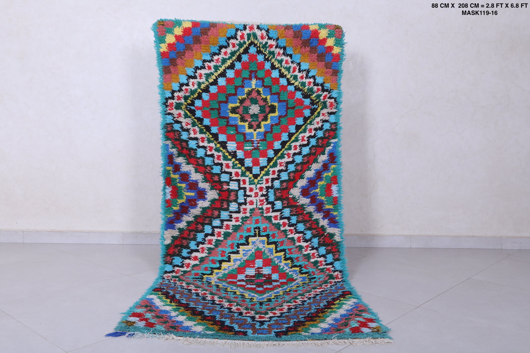 Add vibrant charm to your home with this handcrafted Moroccan Berber rug, featuring a striking multicolor geometric design. At 2.8 x 6.8 ft, this piece blends vivid hues of turquoise, red, green, and yellow, forming intricate diamond and triangle patterns that showcase Moroccan artistry. Perfect for hallways, living spaces, or bedrooms, this rug provides a pop of color while preserving the authenticity of traditional craftsmanship. Elevate your interior with this unique and colorful statement rug.