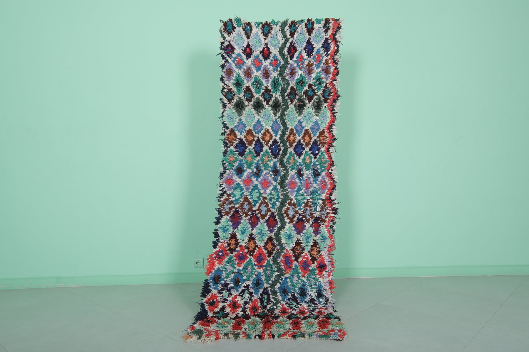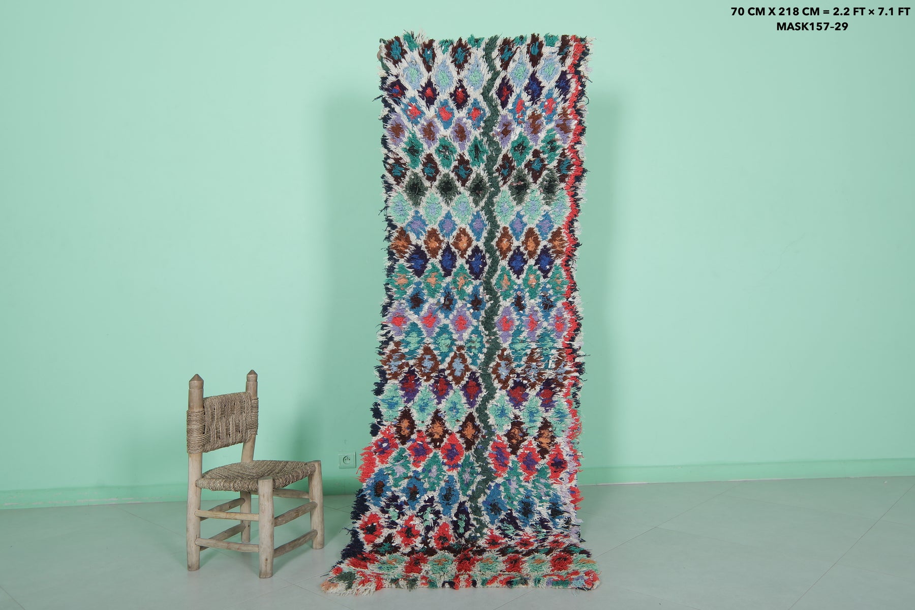 Bring life to your hallway or living space with this Moroccan rug, measuring 2.2 x 7.1 feet. Featuring bold diamond patterns in a vibrant color palette, this handwoven runner showcases the beauty of traditional Berber craftsmanship. Made from premium natural wool, it is soft, durable, and ideal for high-traffic areas, adding both comfort and charm to your home decor.