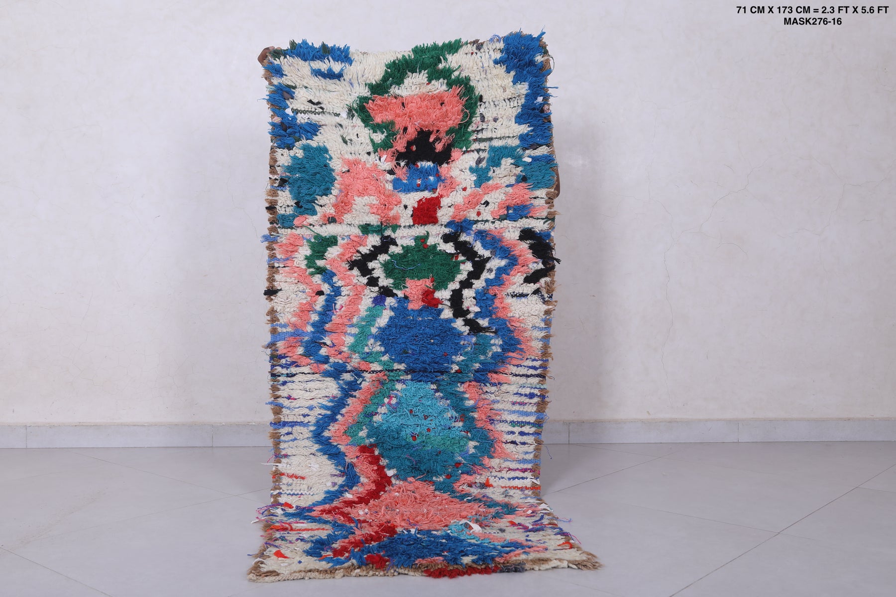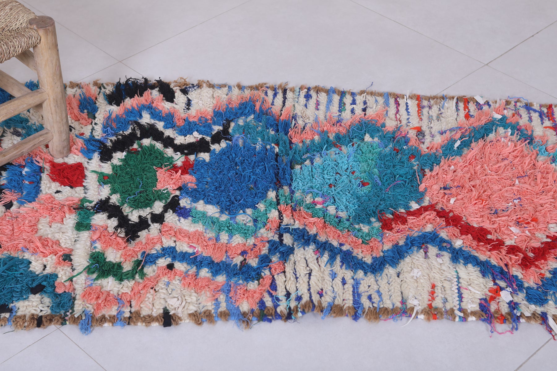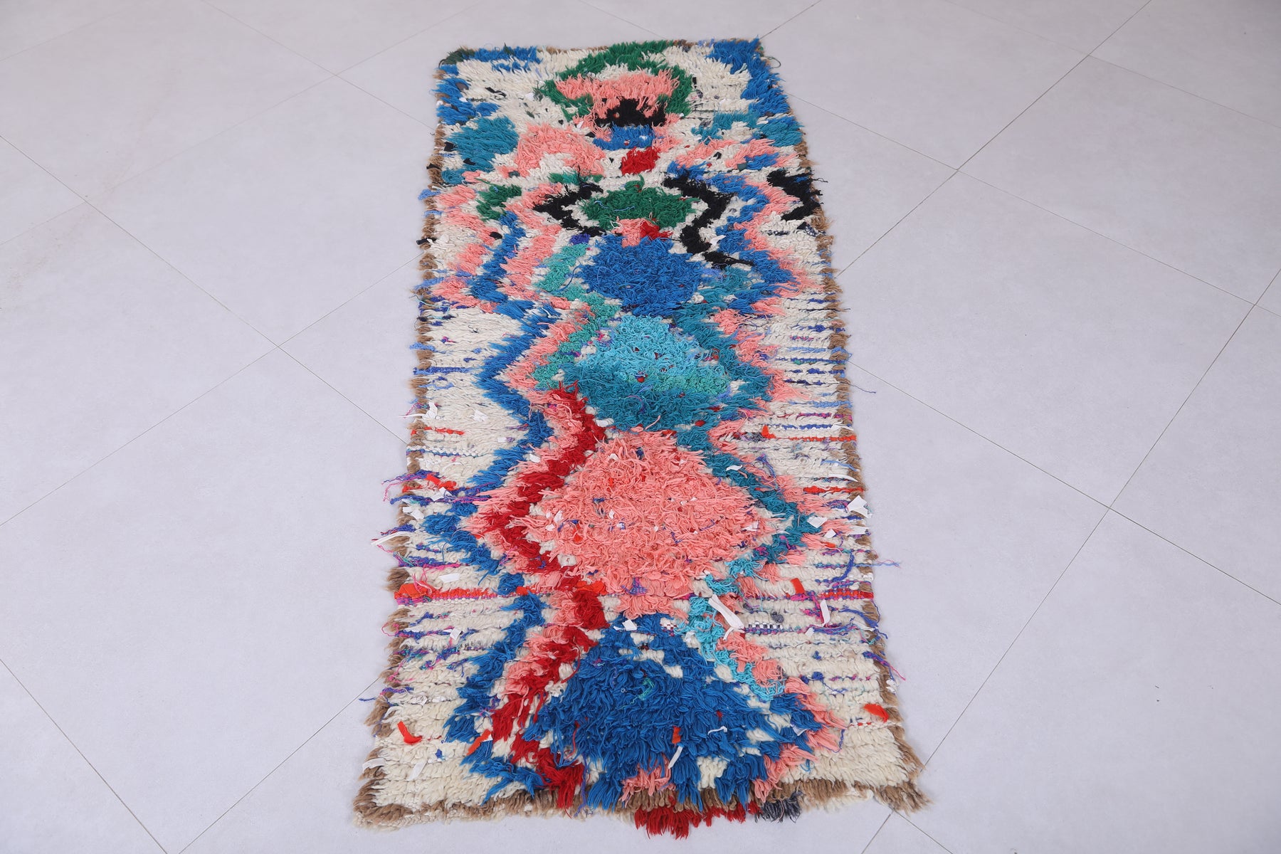 Transform your space with this vibrant Moroccan Berber Rug, featuring an intricate blend of vivid blues, pinks, greens, and reds in a mesmerizing abstract pattern. Handwoven with care, this 2.3 x 5.6 feet rug combines traditional artistry with modern aesthetics. Its rich textures and bold colors make it a standout piece for any room, perfect for adding a pop of personality to your decor.