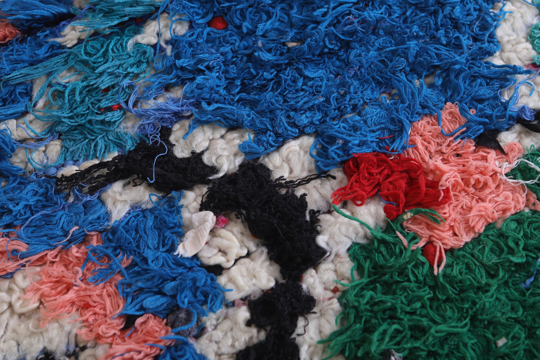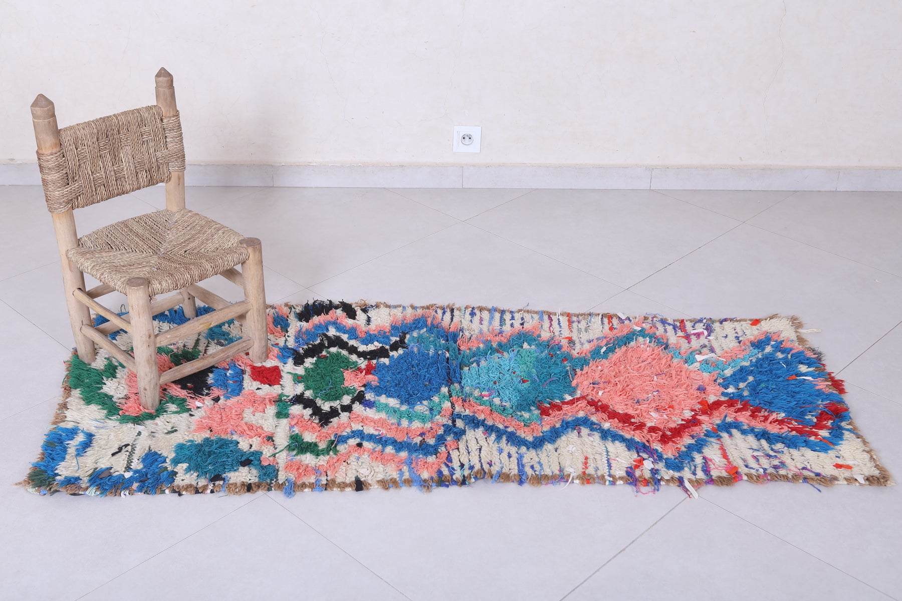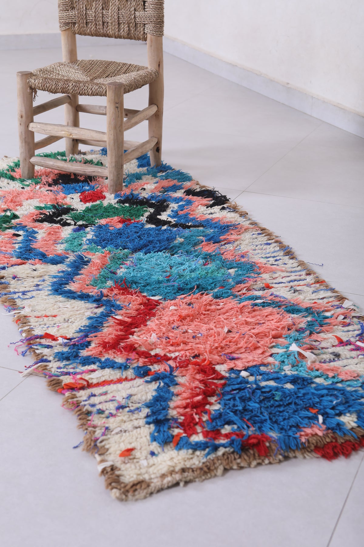 Transform your space with this vibrant Moroccan Berber Rug, featuring an intricate blend of vivid blues, pinks, greens, and reds in a mesmerizing abstract pattern. Handwoven with care, this 2.3 x 5.6 feet rug combines traditional artistry with modern aesthetics. Its rich textures and bold colors make it a standout piece for any room, perfect for adding a pop of personality to your decor.