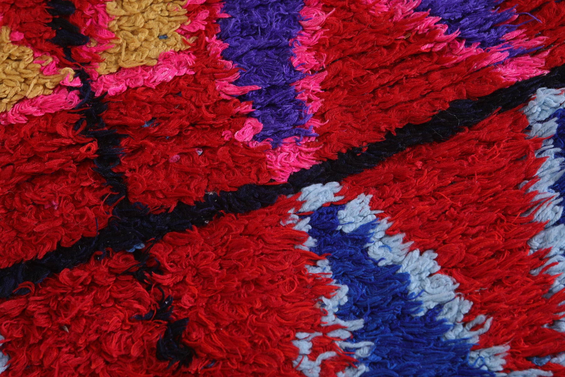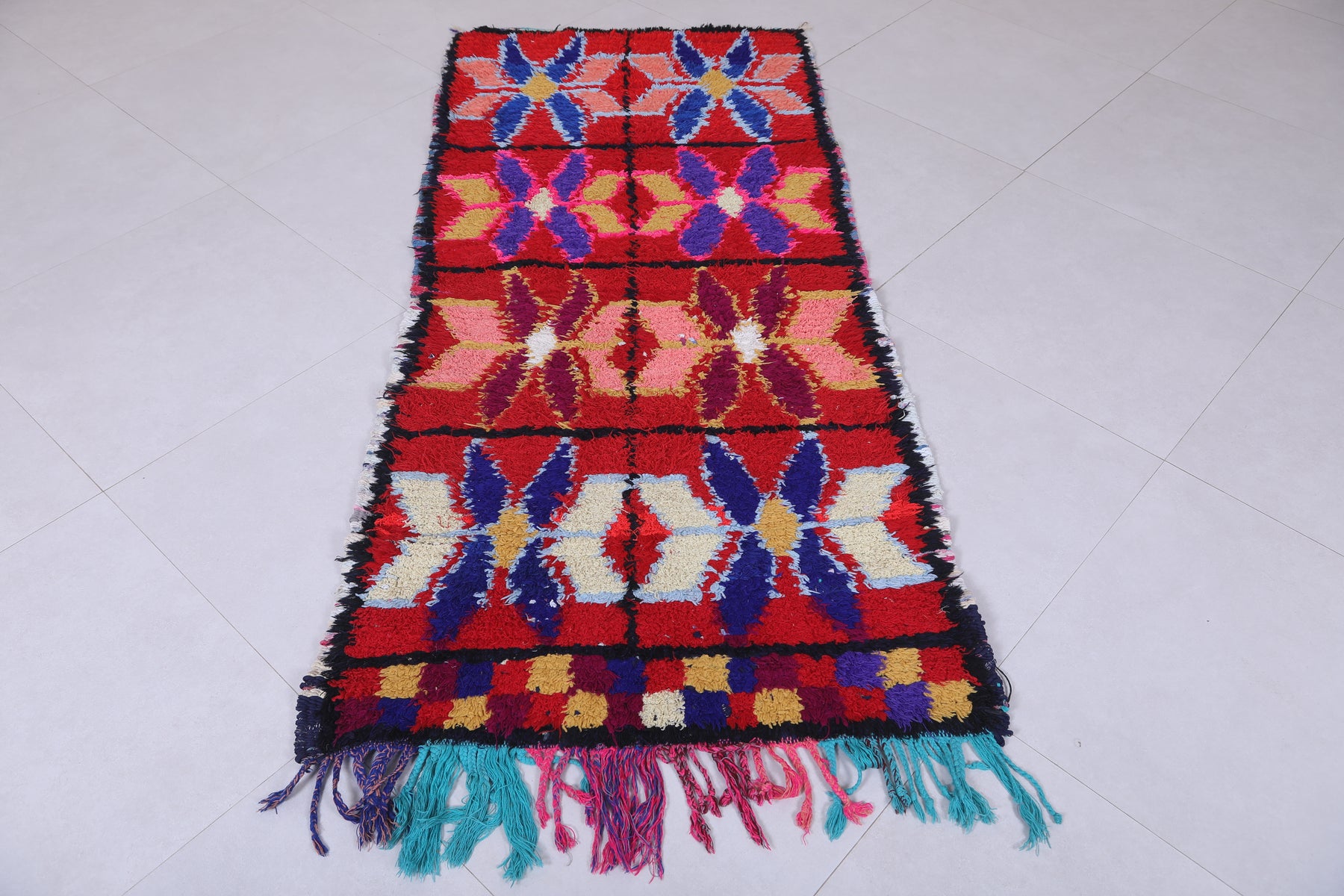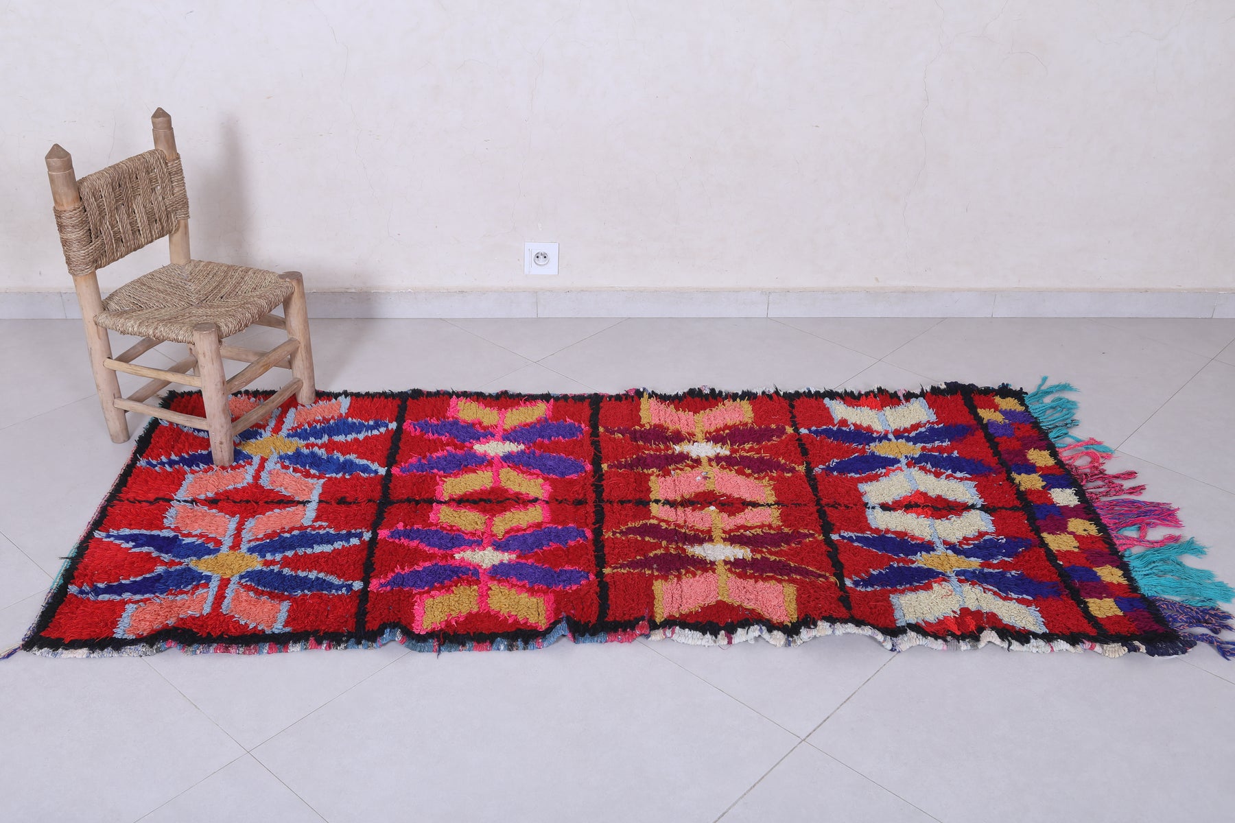 Transform your space with this vibrant Moroccan Berber rug, measuring 2.8 x 6.4 feet. Showcasing bold flower motifs in striking shades of red, blue, pink, and yellow, this rug is framed by a black border for added depth and contrast. Its intricate patterns and colorful palette make it an eye-catching addition to any room. Handwoven with care by skilled artisans, this rug is a unique expression of Moroccan craftsmanship. Perfect for adding warmth and charm to your living room, hallway, or bedroom decor.
