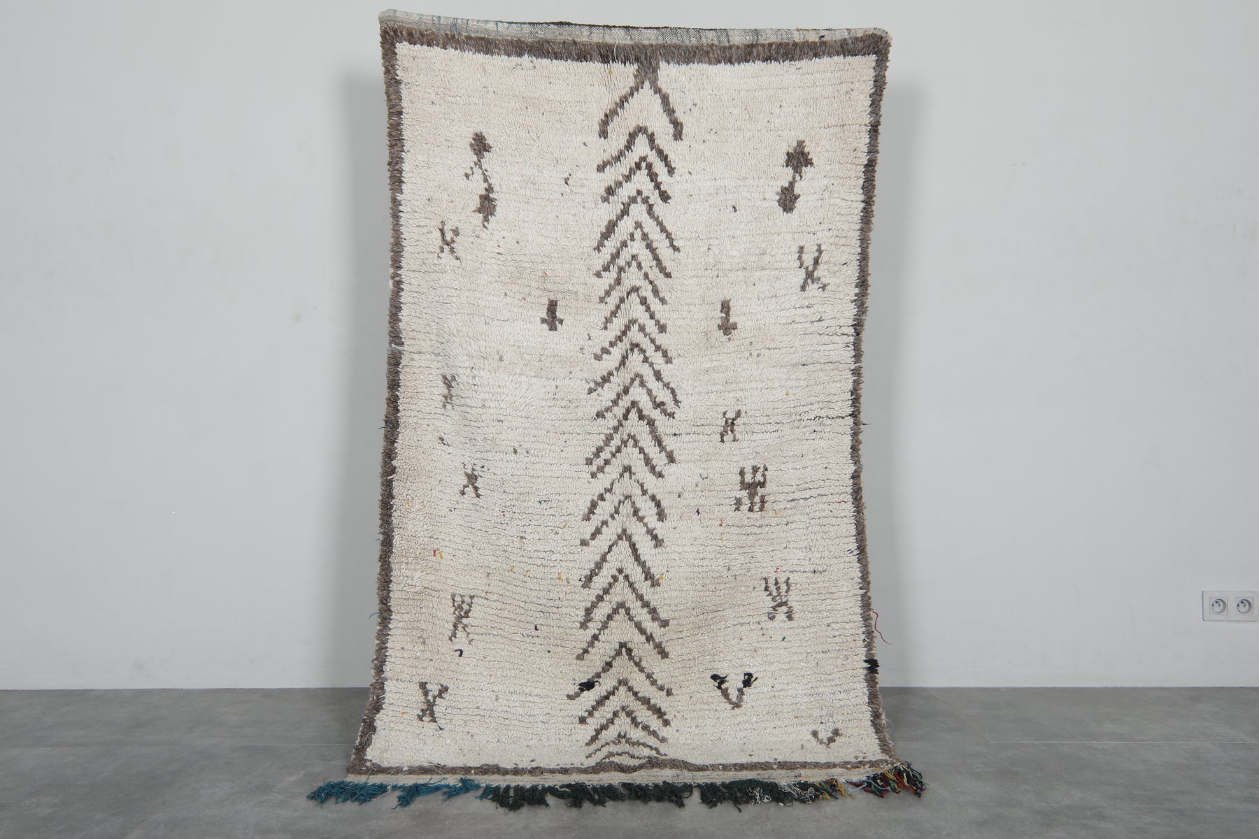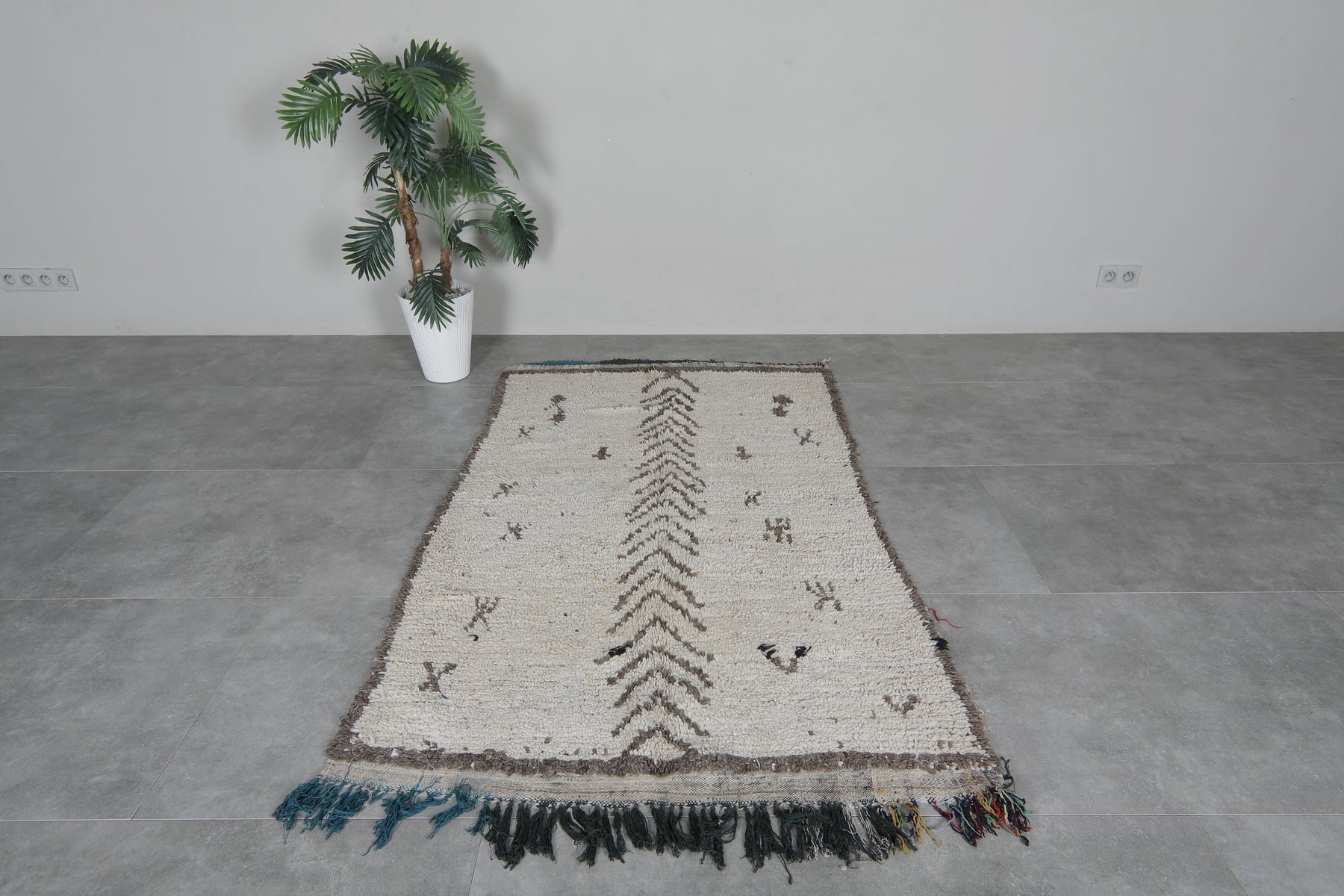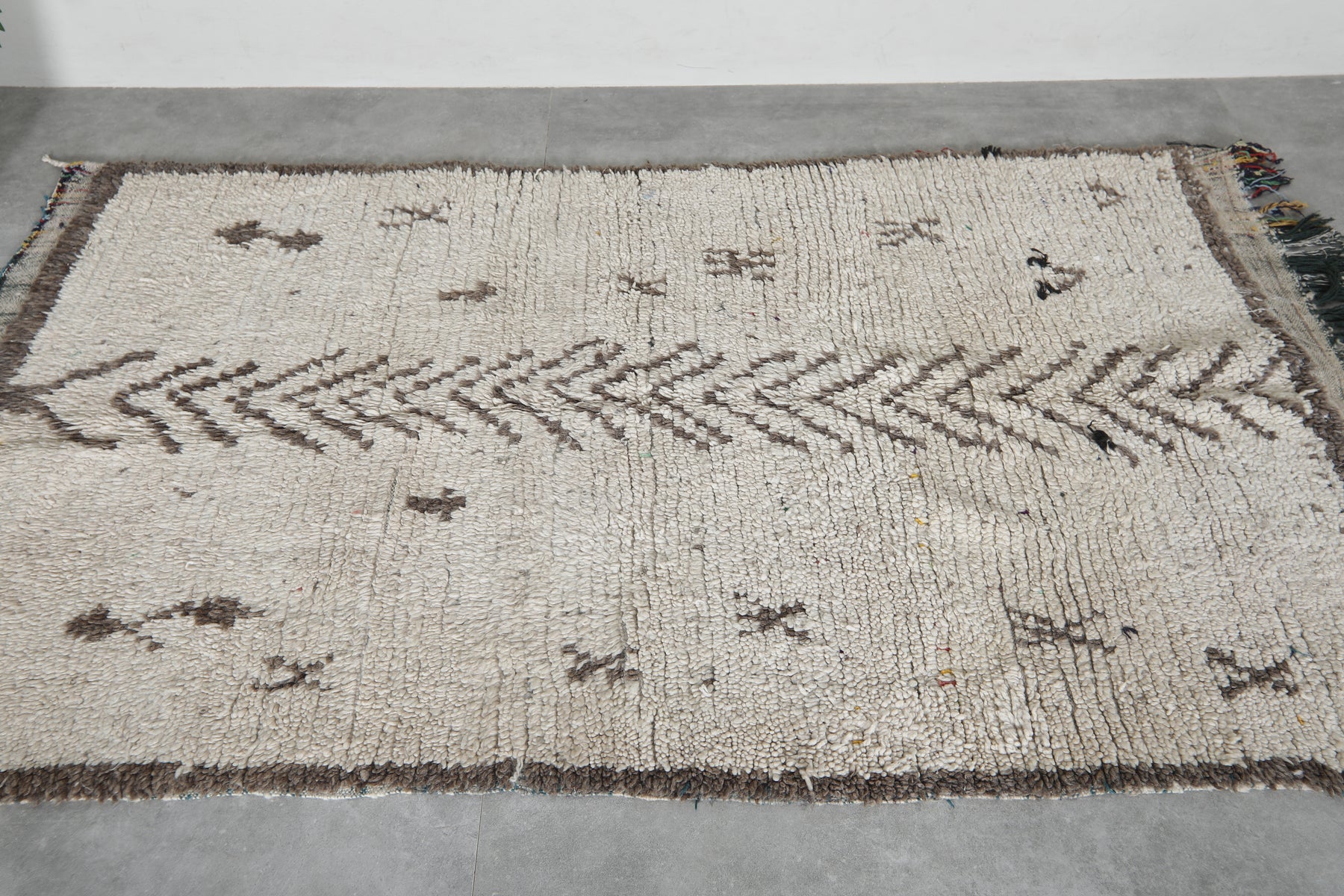 Authentic handmade wool rug measuring 3.8 x 6.5 ft, featuring a soft ivory base with minimalist Berber symbols. This Moroccan rug adds warmth, texture, and an artisanal touch to bohemian, rustic, or modern interiors. A timeless and cozy accent for any space.