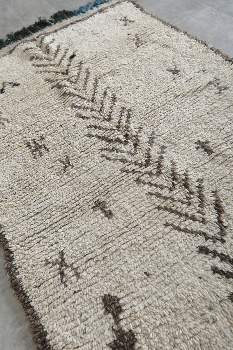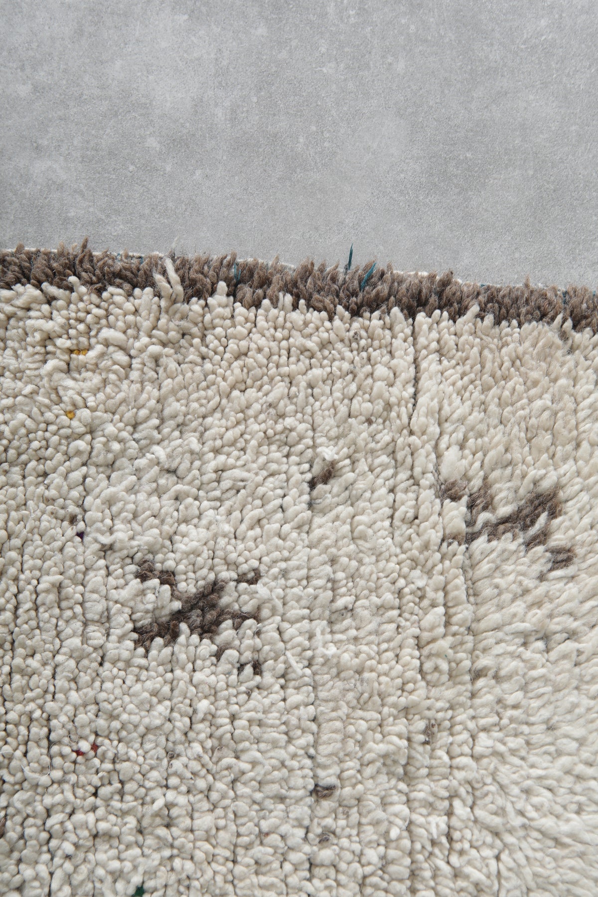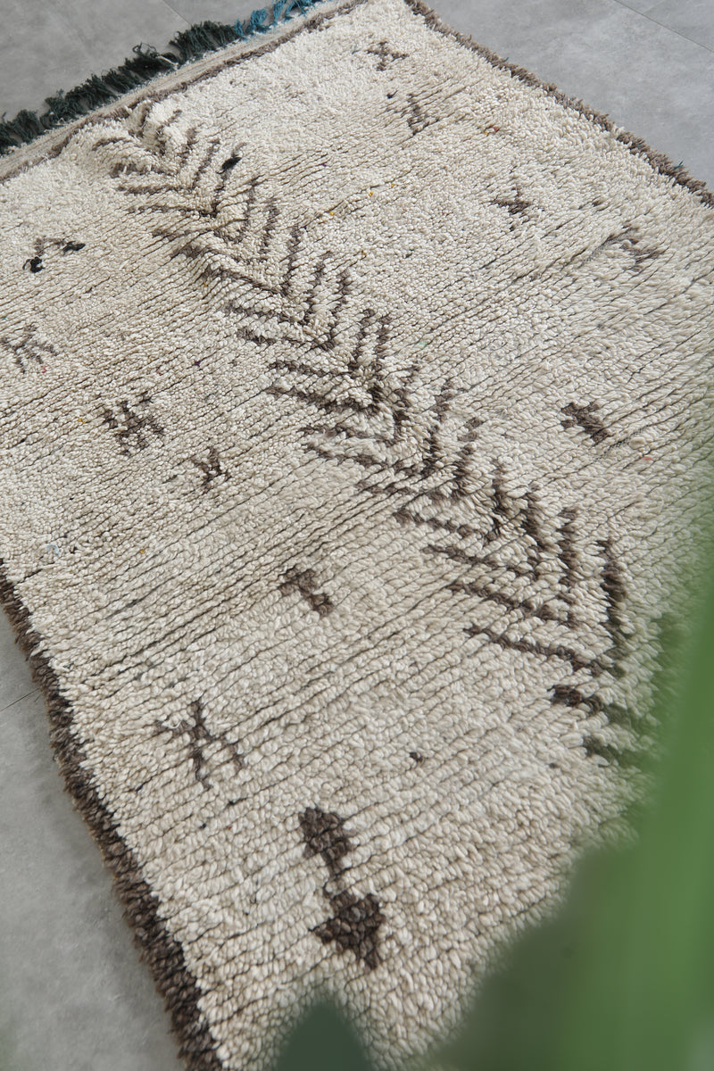Authentic handmade wool rug measuring 3.8 x 6.5 ft, featuring a soft ivory base with minimalist Berber symbols. This Moroccan rug adds warmth, texture, and an artisanal touch to bohemian, rustic, or modern interiors. A timeless and cozy accent for any space.