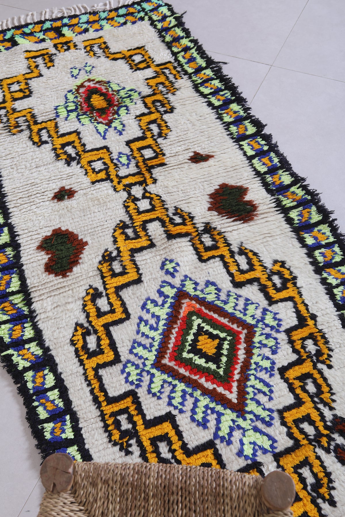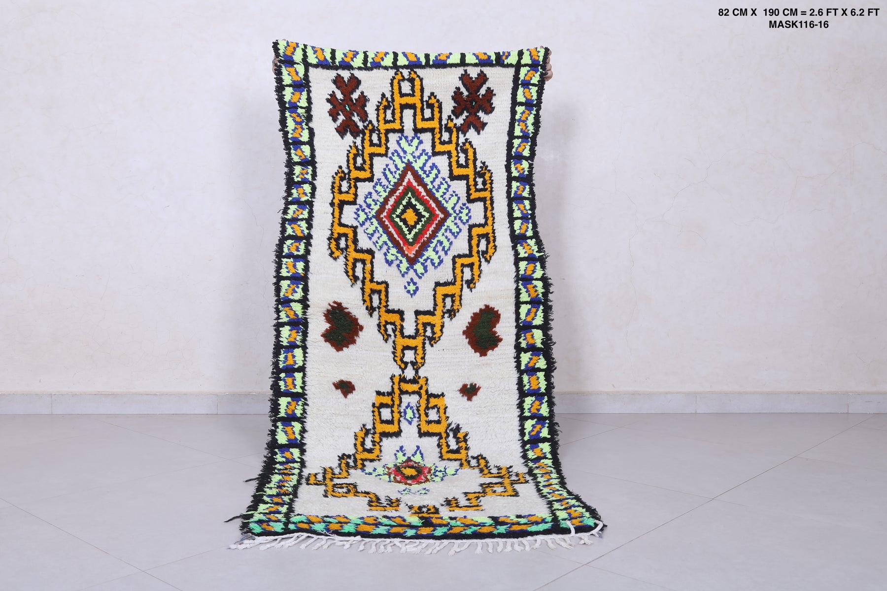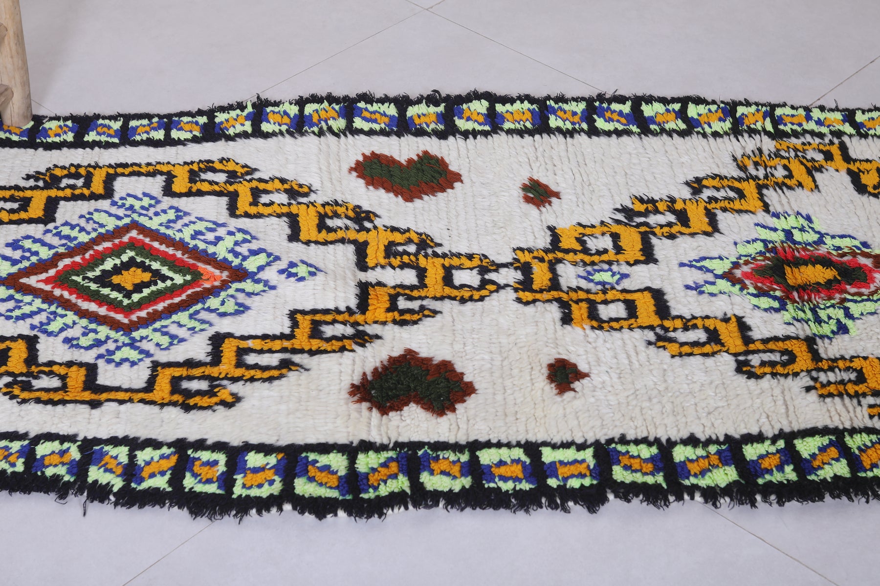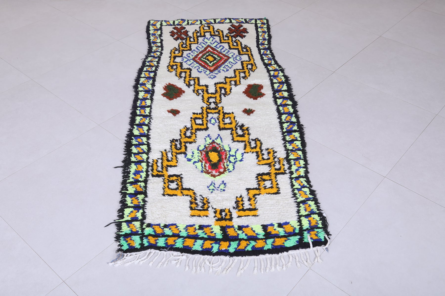 Add a touch of cultural elegance to your home with this Moroccan Berber rug, measuring 2.6 x 6.2 feet. Vibrant geometric patterns in shades of yellow, green, red, and blue stand out against a soft cream background, creating a visually stunning design. Handcrafted by Berber artisans, this rug is made from premium materials, ensuring durability and comfort. Its unique border accents and central diamond motifs make it a centerpiece for any room. Perfect for hallways, living spaces, or bedrooms, this rug blends traditional craftsmanship with modern aesthetics.