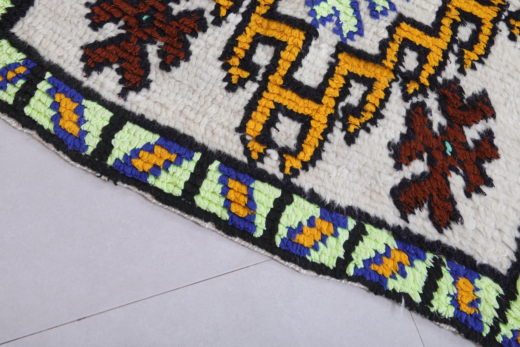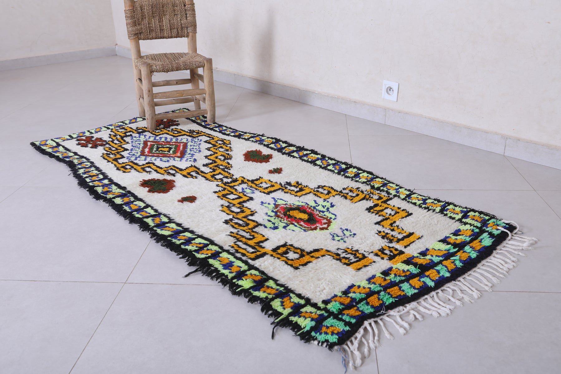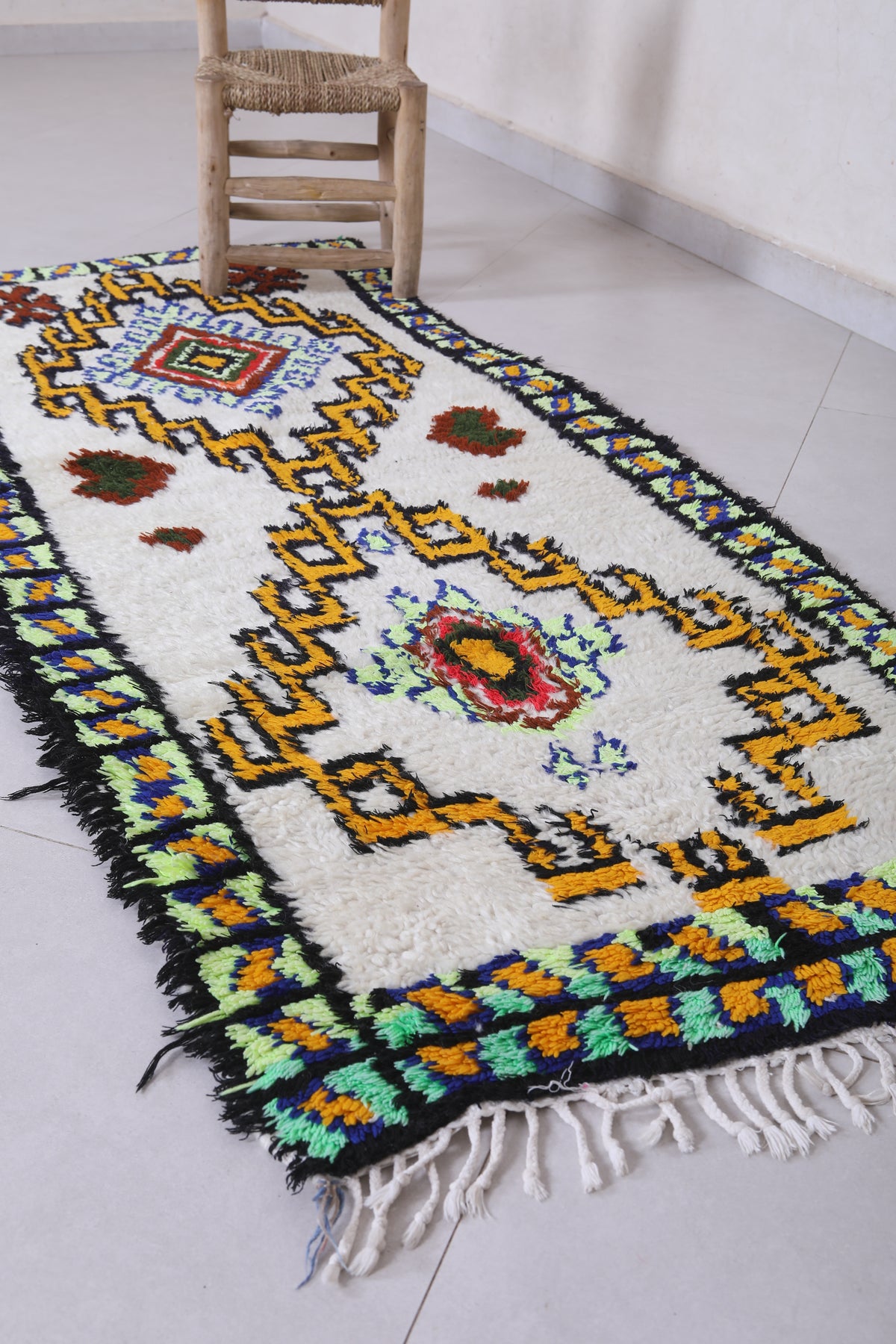 Add a touch of cultural elegance to your home with this Moroccan Berber rug, measuring 2.6 x 6.2 feet. Vibrant geometric patterns in shades of yellow, green, red, and blue stand out against a soft cream background, creating a visually stunning design. Handcrafted by Berber artisans, this rug is made from premium materials, ensuring durability and comfort. Its unique border accents and central diamond motifs make it a centerpiece for any room. Perfect for hallways, living spaces, or bedrooms, this rug blends traditional craftsmanship with modern aesthetics.