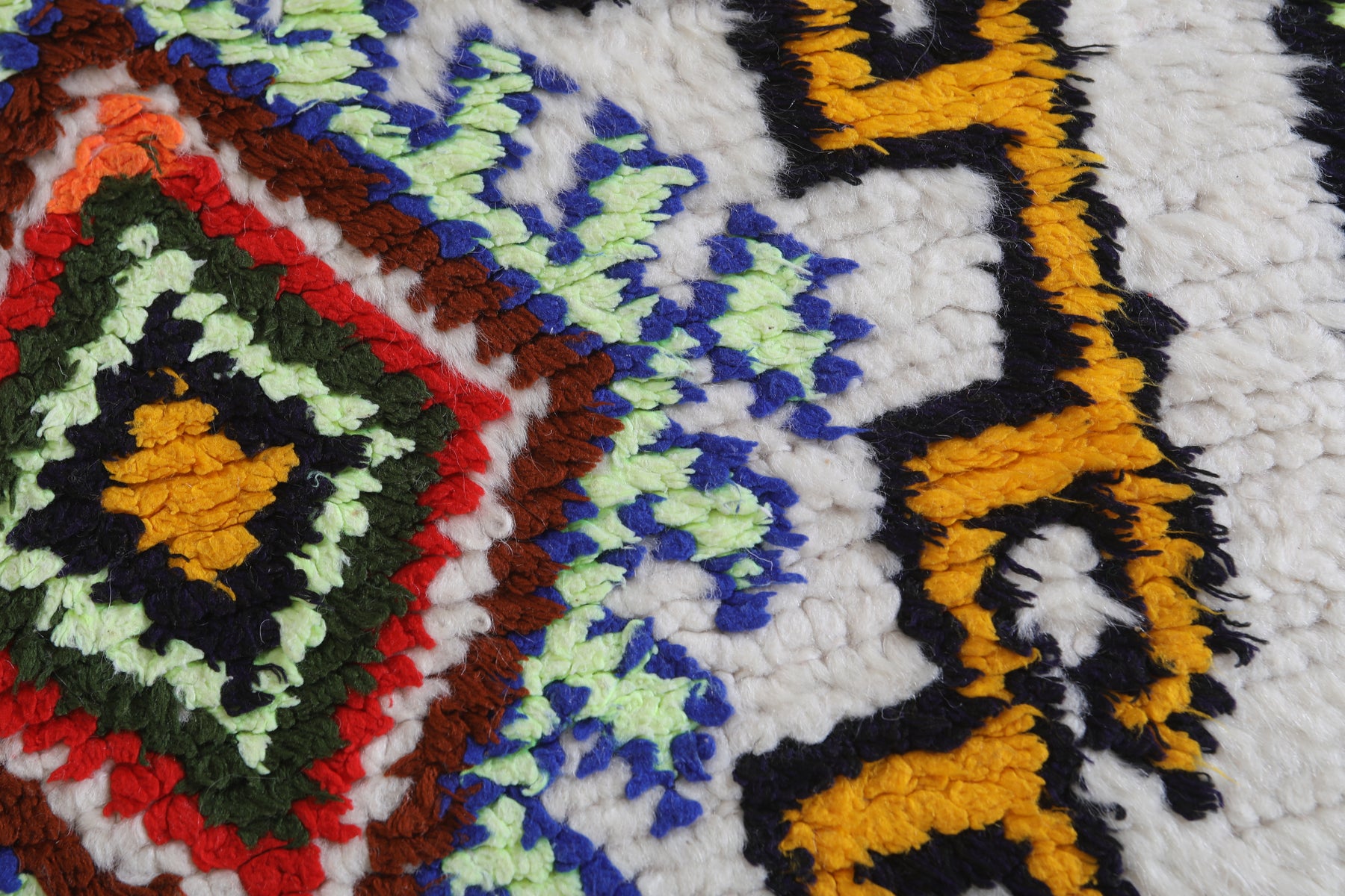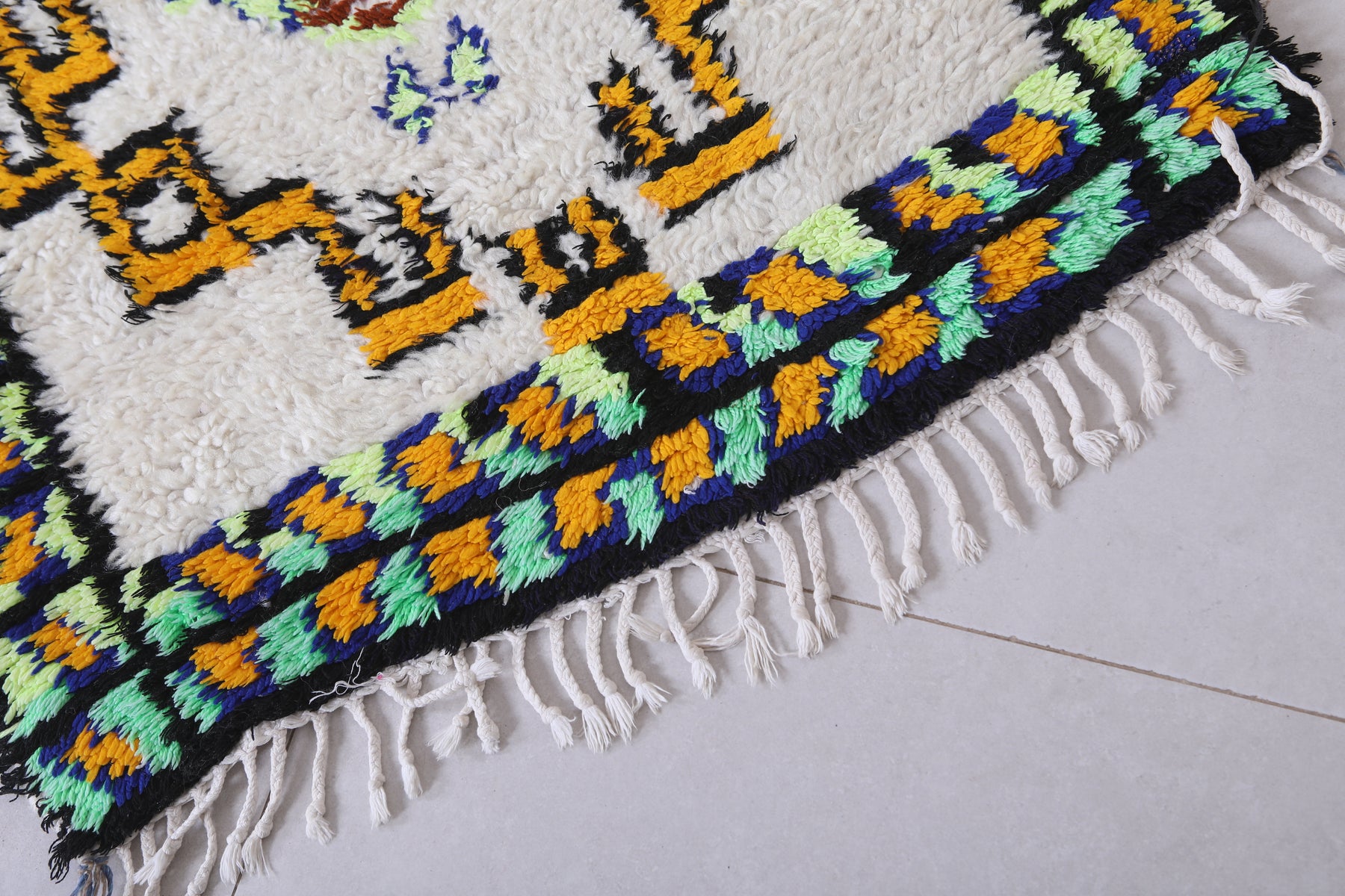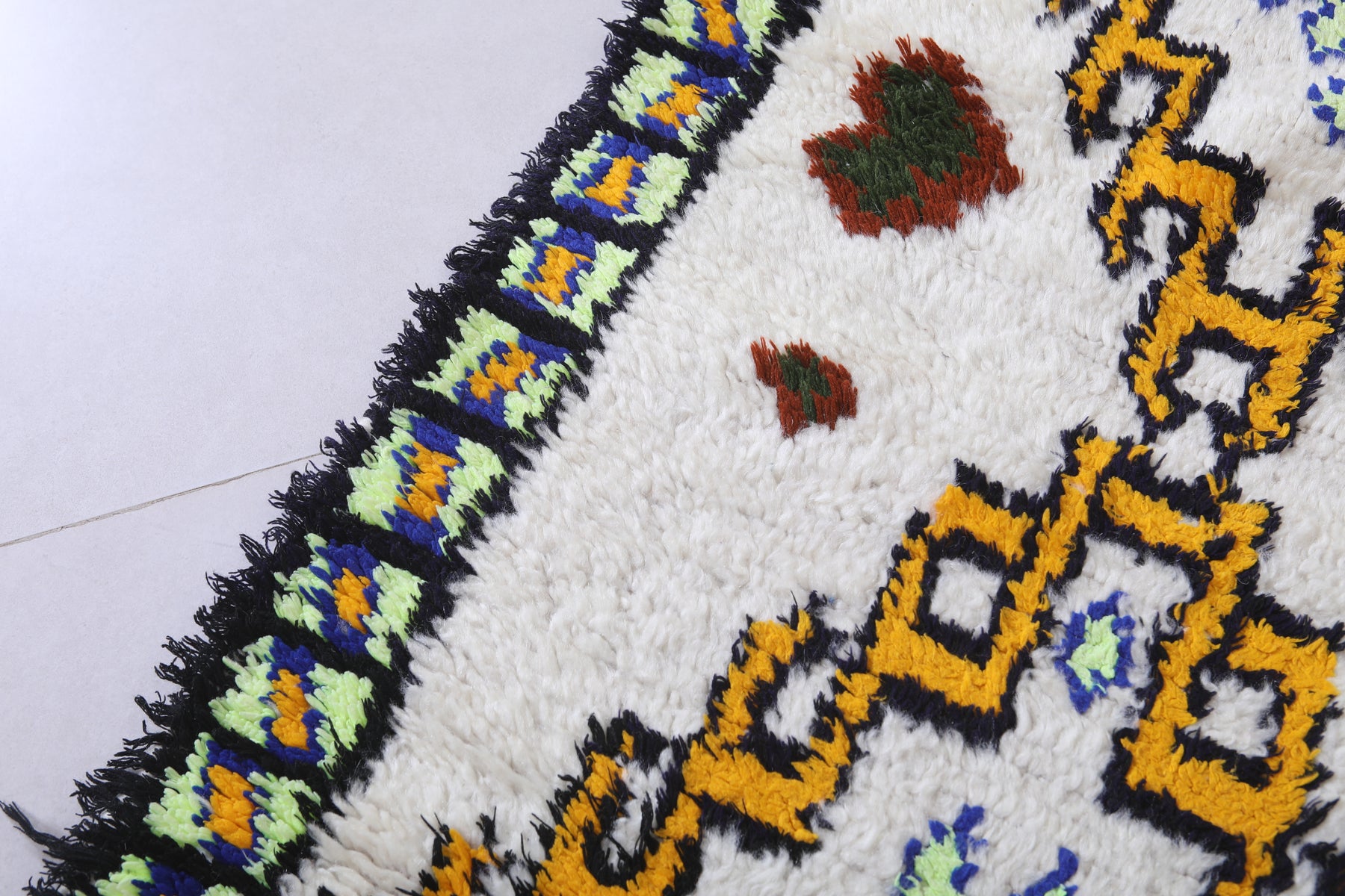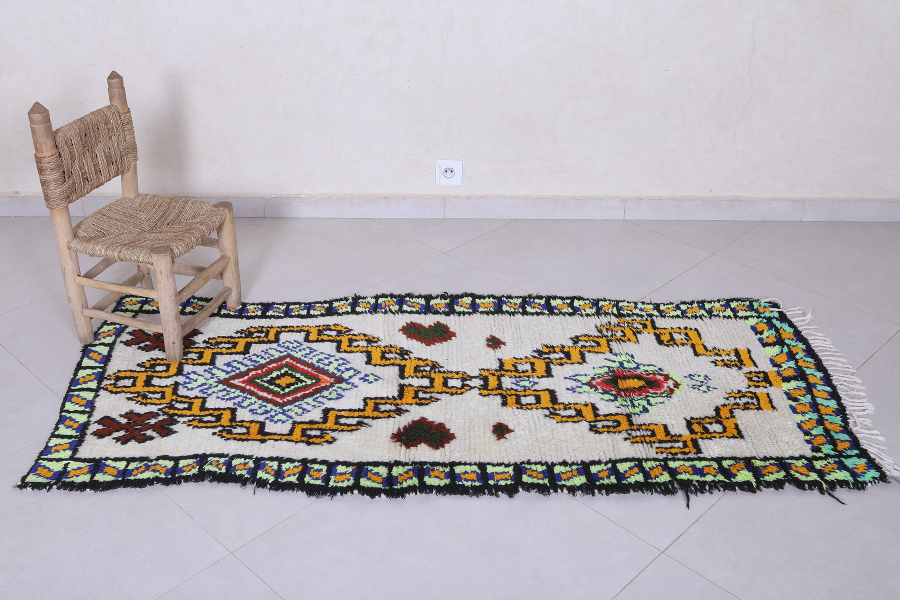 Add a touch of cultural elegance to your home with this Moroccan Berber rug, measuring 2.6 x 6.2 feet. Vibrant geometric patterns in shades of yellow, green, red, and blue stand out against a soft cream background, creating a visually stunning design. Handcrafted by Berber artisans, this rug is made from premium materials, ensuring durability and comfort. Its unique border accents and central diamond motifs make it a centerpiece for any room. Perfect for hallways, living spaces, or bedrooms, this rug blends traditional craftsmanship with modern aesthetics.