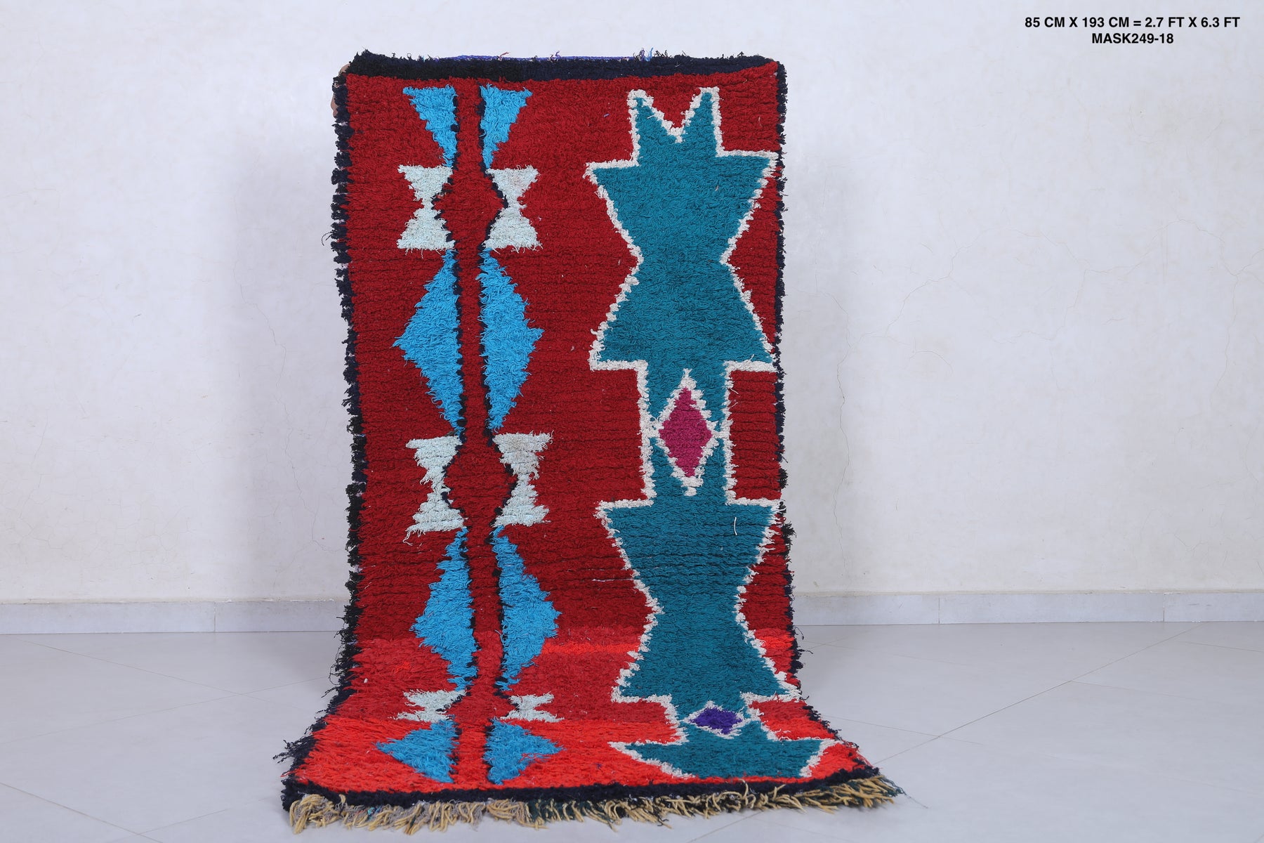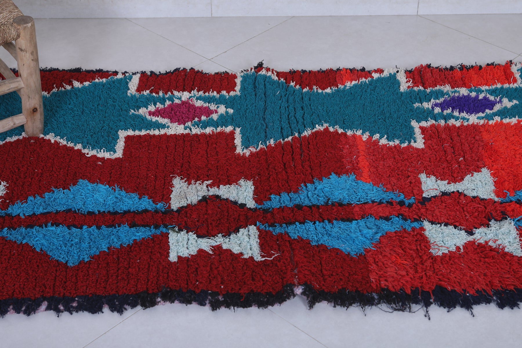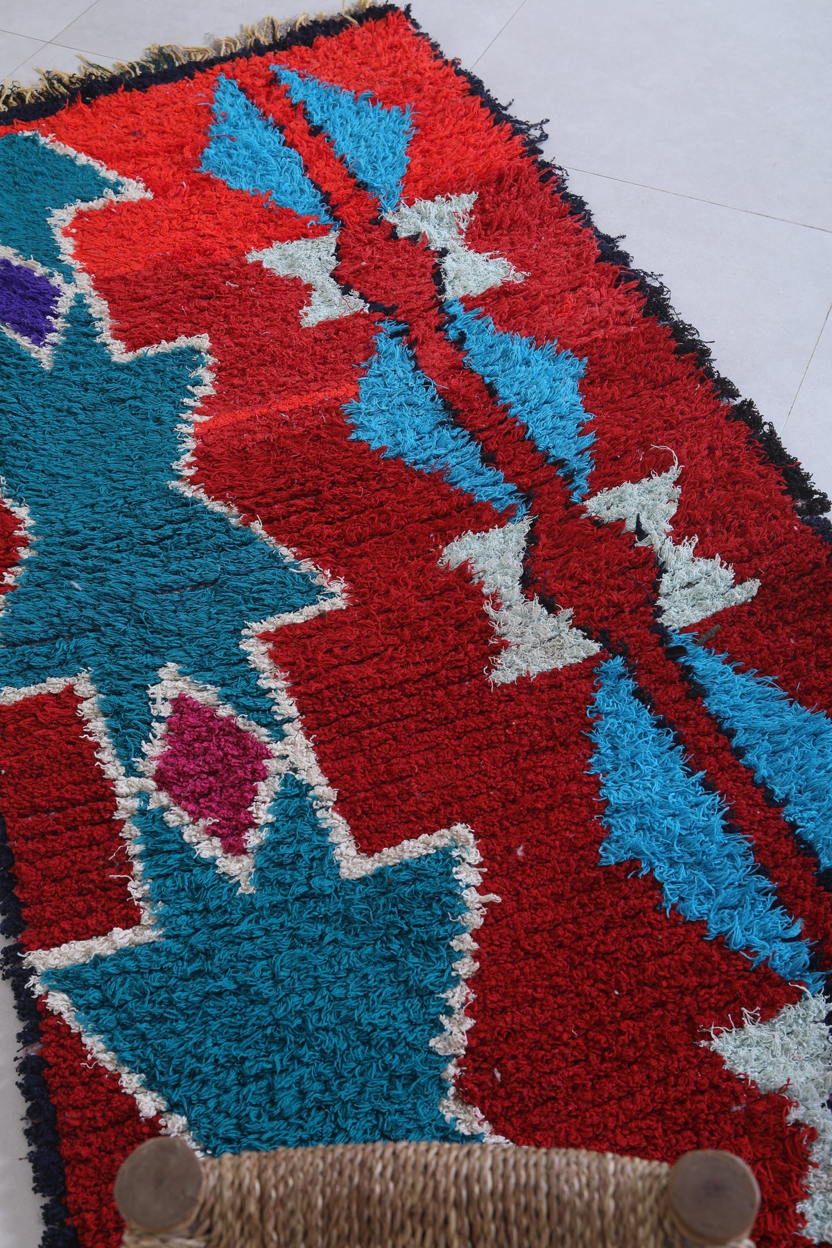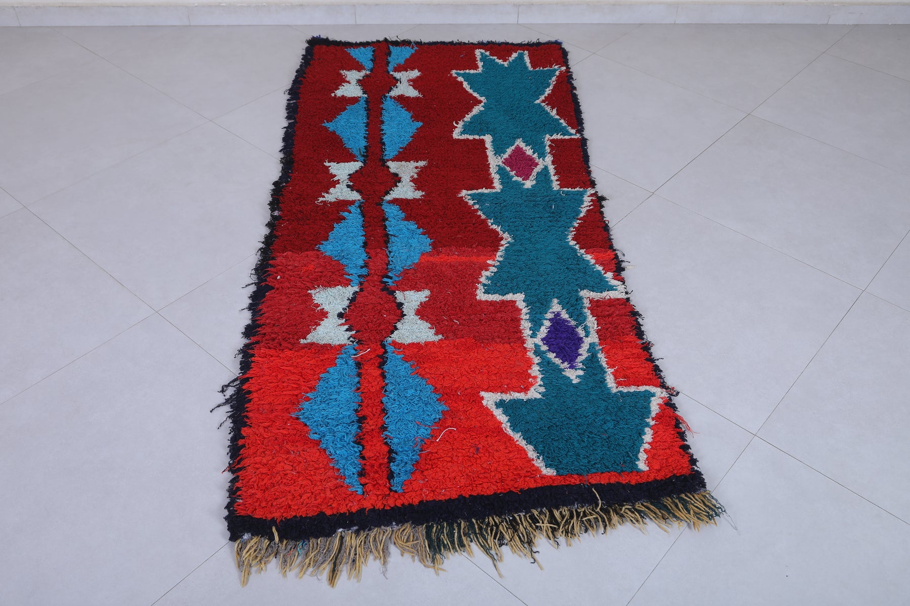 Elevate your home décor with this stunning Moroccan Berber Rug, measuring 2.7 x 6.3 feet. Featuring vibrant geometric patterns in bold red, turquoise, white, and hints of purple, this handwoven masterpiece showcases the artistry of Moroccan craftsmanship. The symmetrical design includes star-like motifs and diamond shapes that create a striking visual appeal. Perfect for adding character and warmth to living spaces, this unique rug is both a decorative and functional piece.