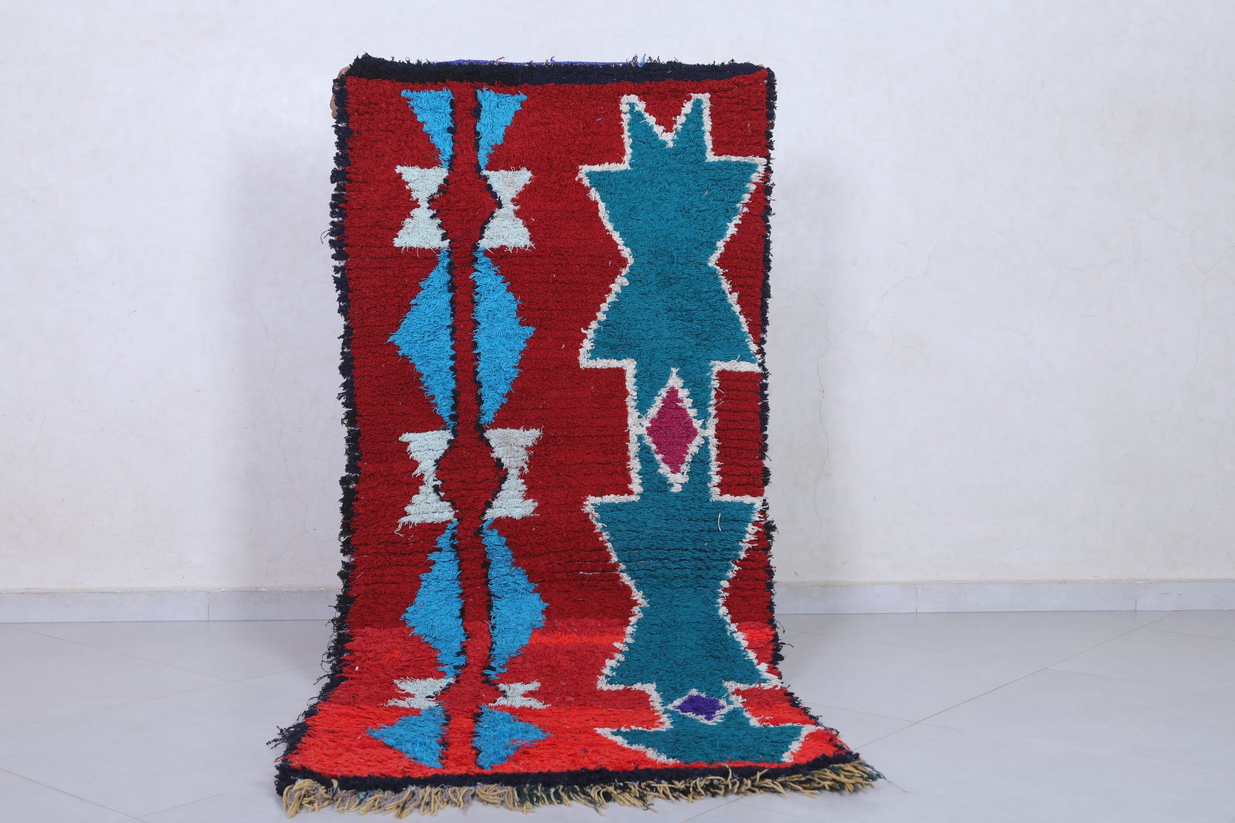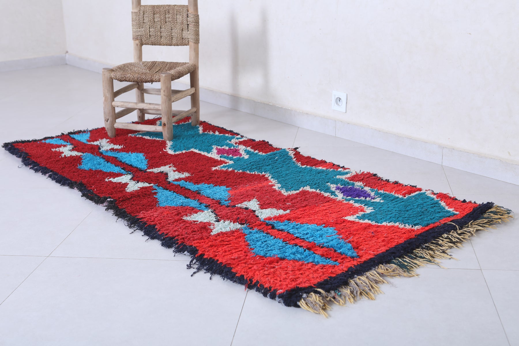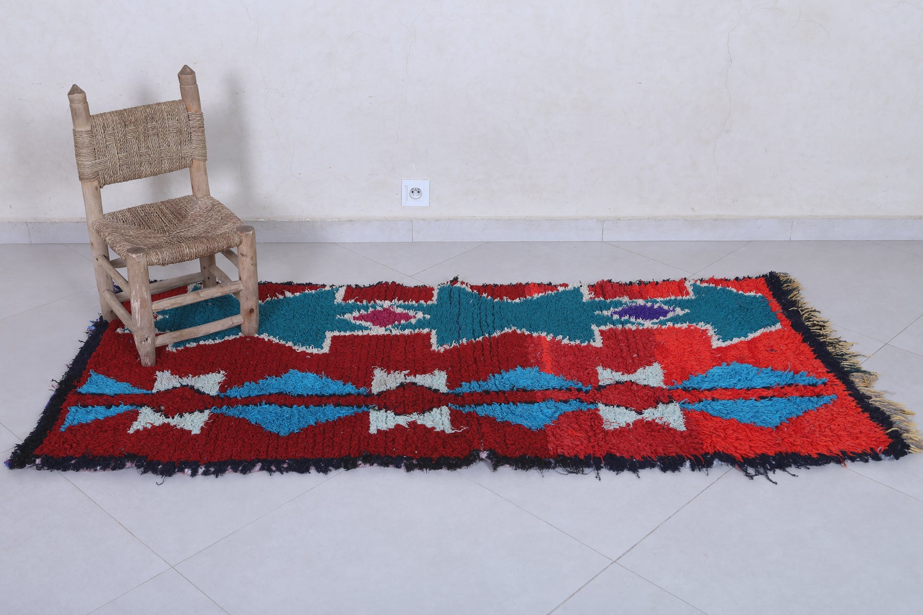 Elevate your home décor with this stunning Moroccan Berber Rug, measuring 2.7 x 6.3 feet. Featuring vibrant geometric patterns in bold red, turquoise, white, and hints of purple, this handwoven masterpiece showcases the artistry of Moroccan craftsmanship. The symmetrical design includes star-like motifs and diamond shapes that create a striking visual appeal. Perfect for adding character and warmth to living spaces, this unique rug is both a decorative and functional piece.