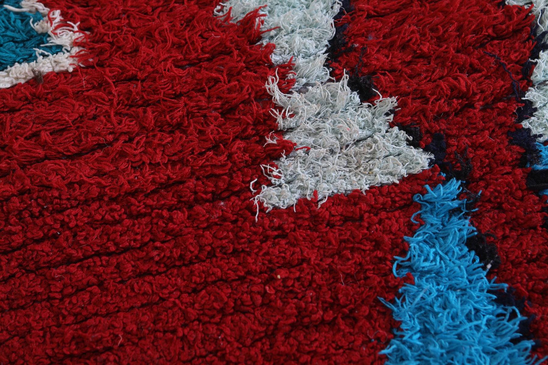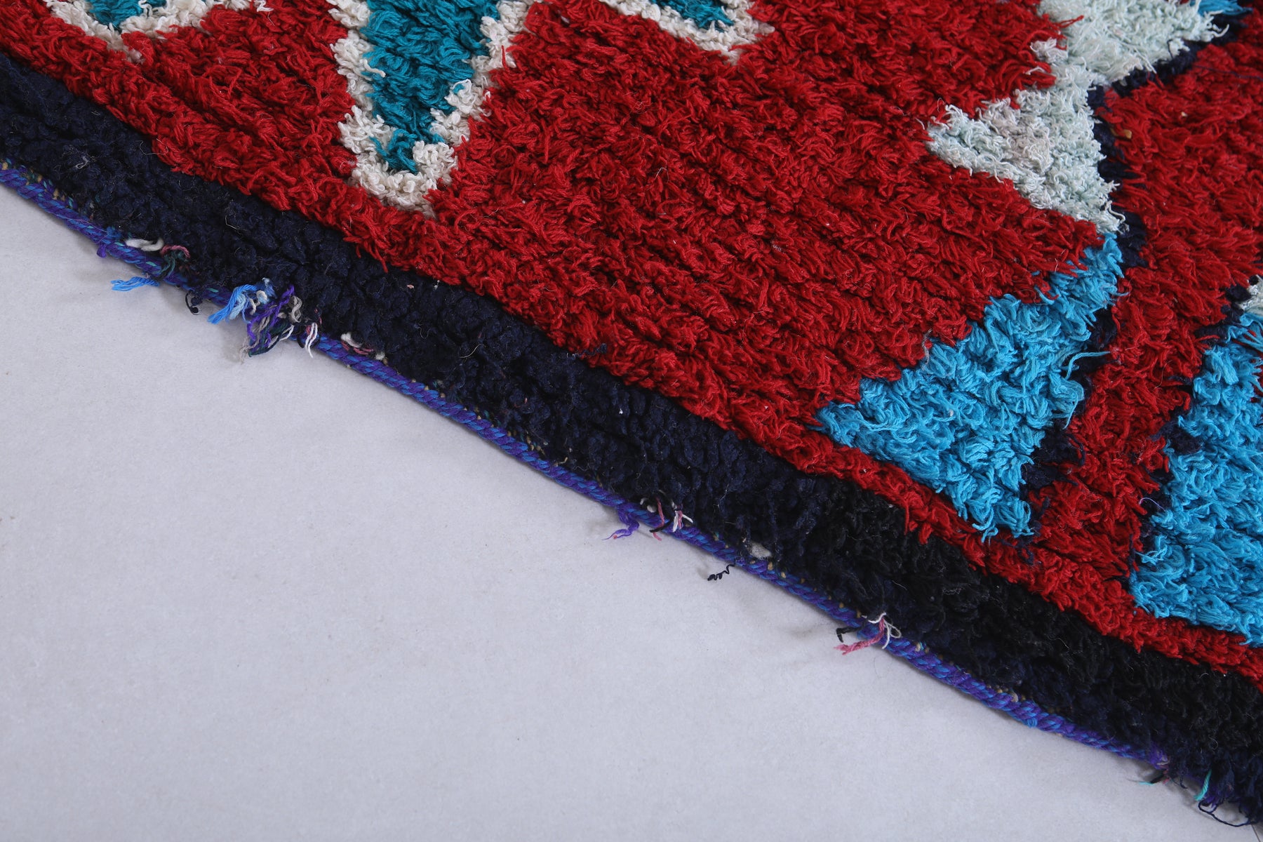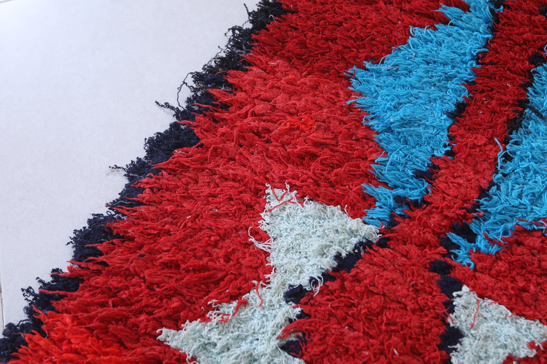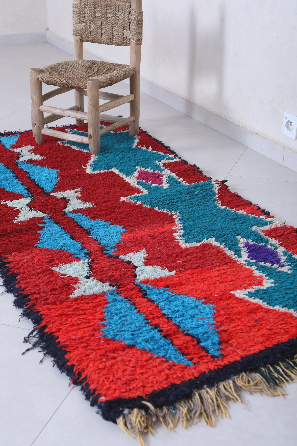 Elevate your home décor with this stunning Moroccan Berber Rug, measuring 2.7 x 6.3 feet. Featuring vibrant geometric patterns in bold red, turquoise, white, and hints of purple, this handwoven masterpiece showcases the artistry of Moroccan craftsmanship. The symmetrical design includes star-like motifs and diamond shapes that create a striking visual appeal. Perfect for adding character and warmth to living spaces, this unique rug is both a decorative and functional piece.
