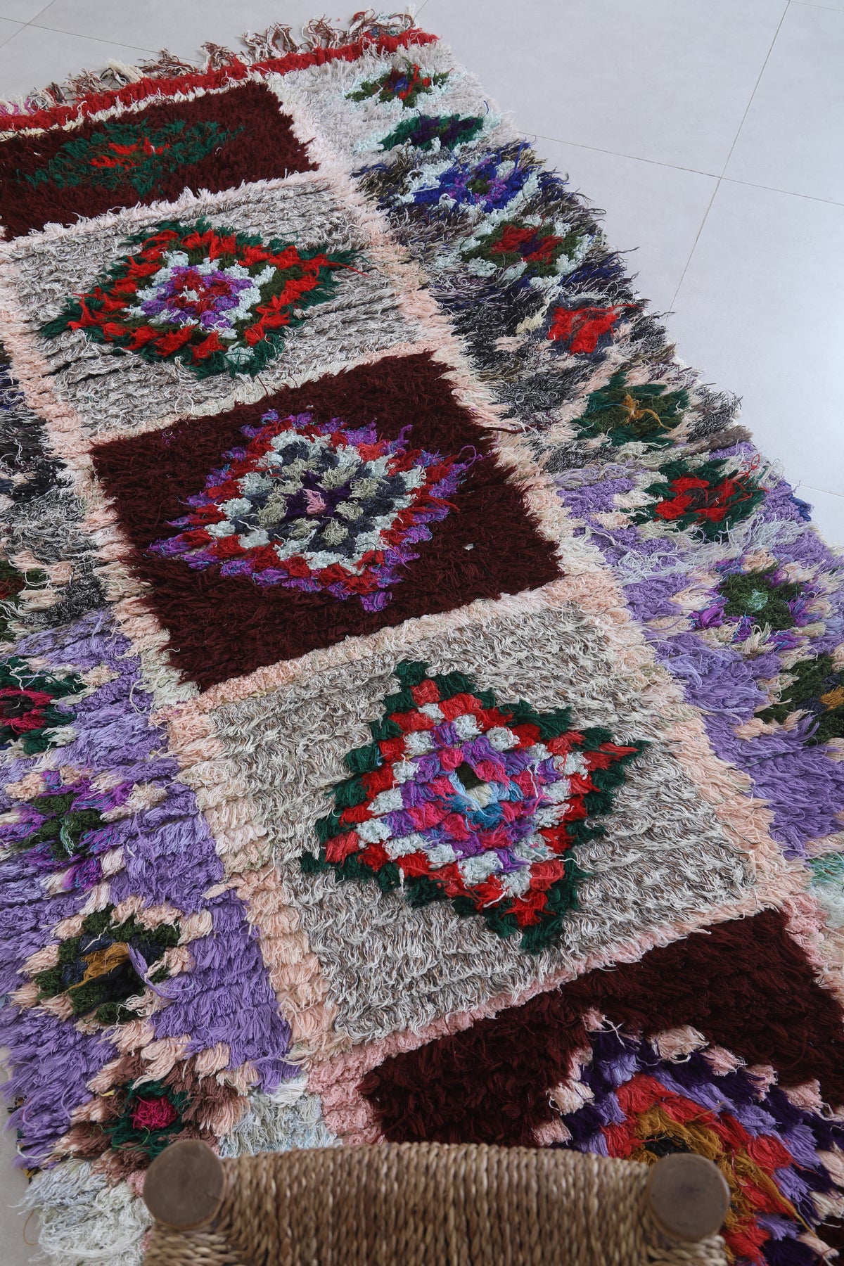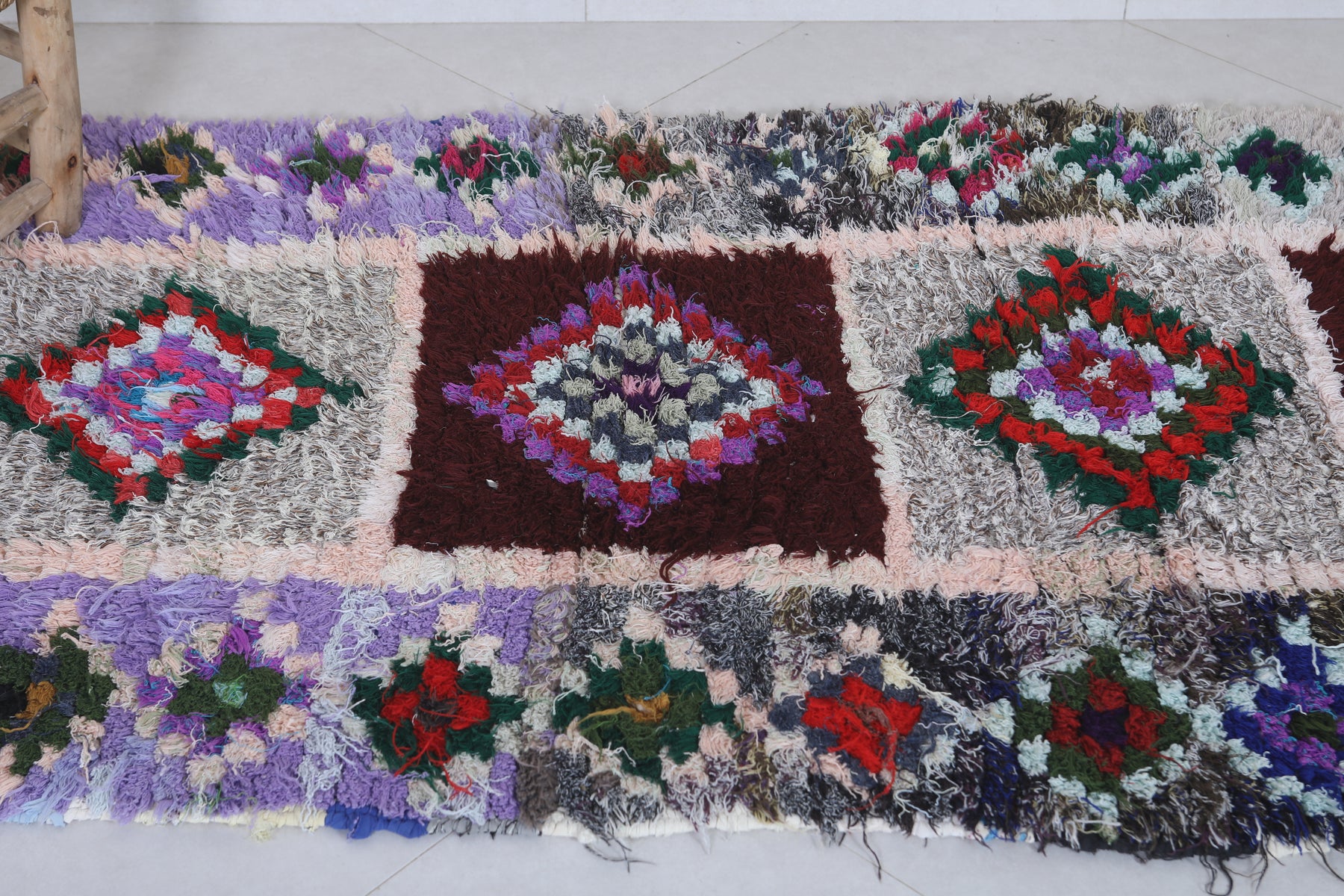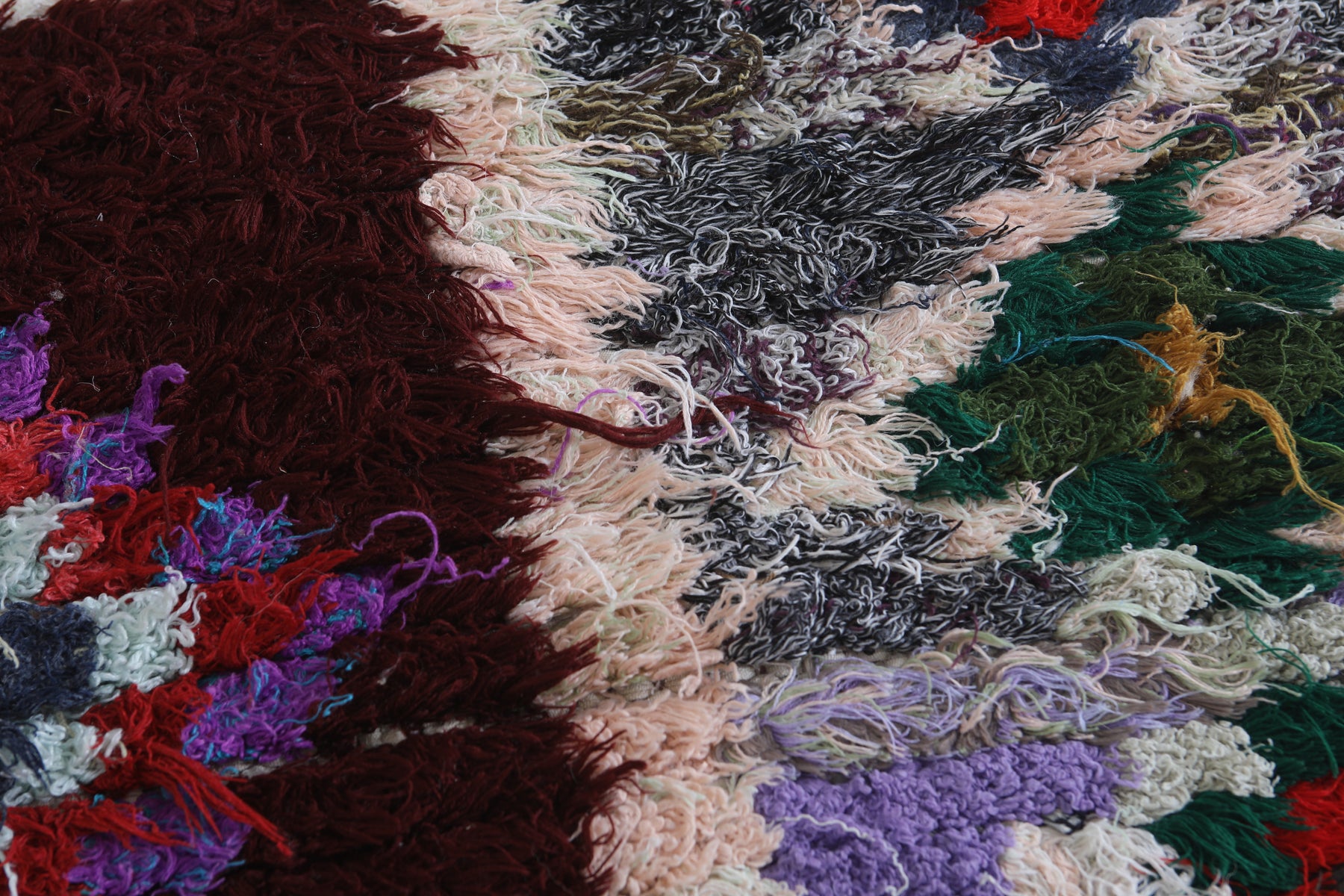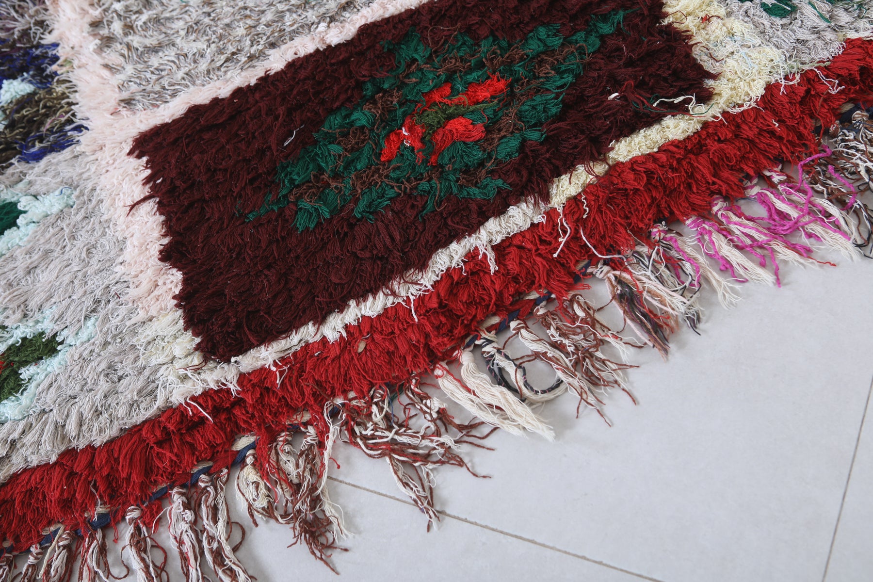 Add a touch of Moroccan artistry with this 3.2 x 6.4 feet Berber rug, featuring a patchwork of intricate diamond and floral motifs in rich hues of burgundy, purple, and green. Crafted with care, this handwoven piece blends tradition with modern aesthetics, making it a timeless statement for your home.