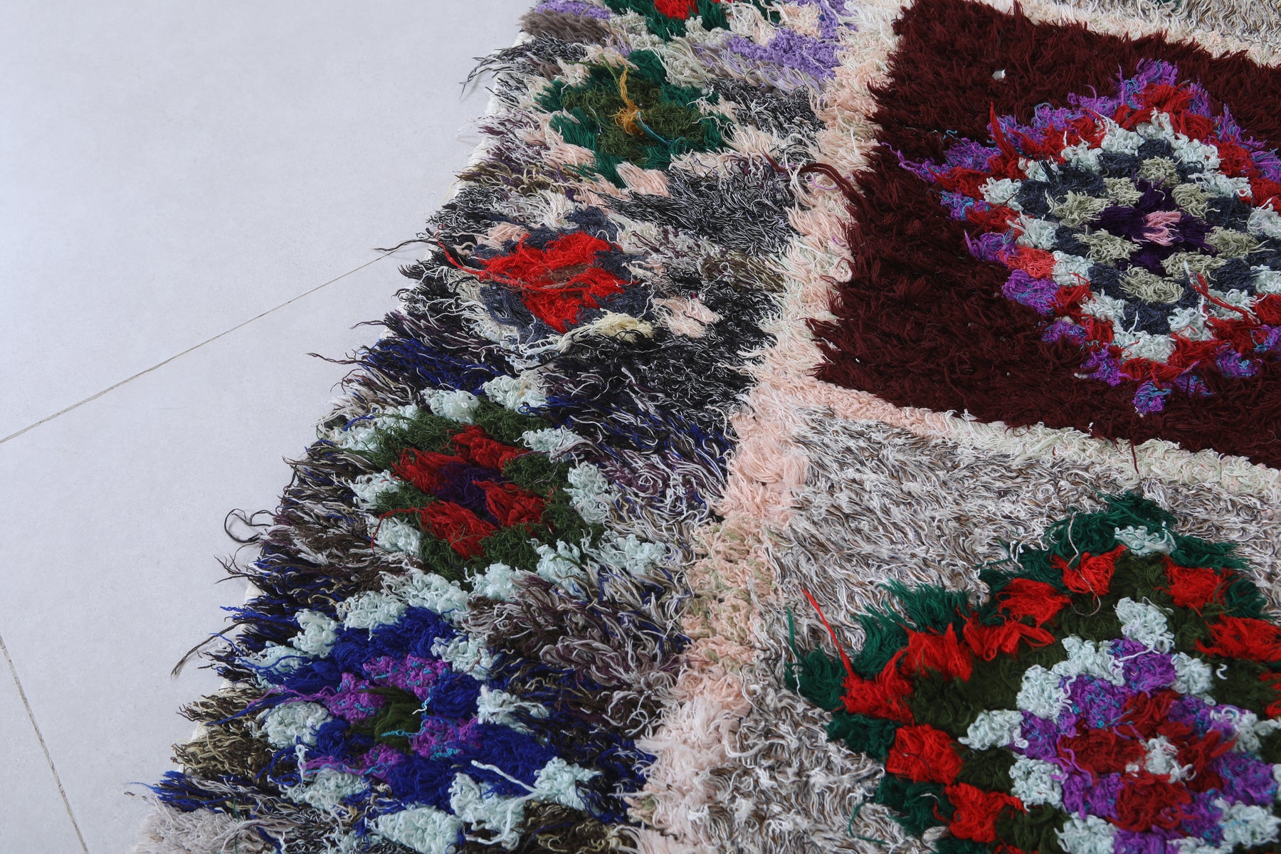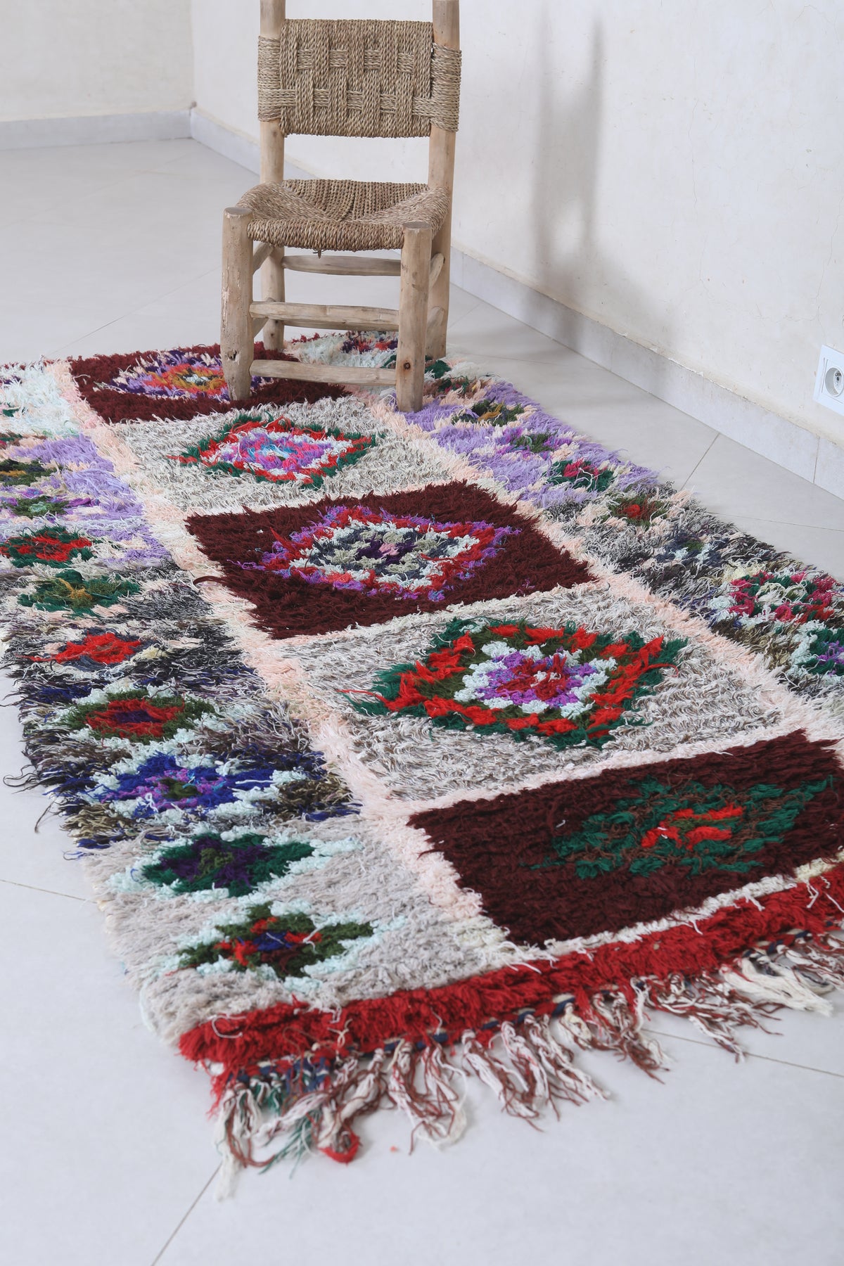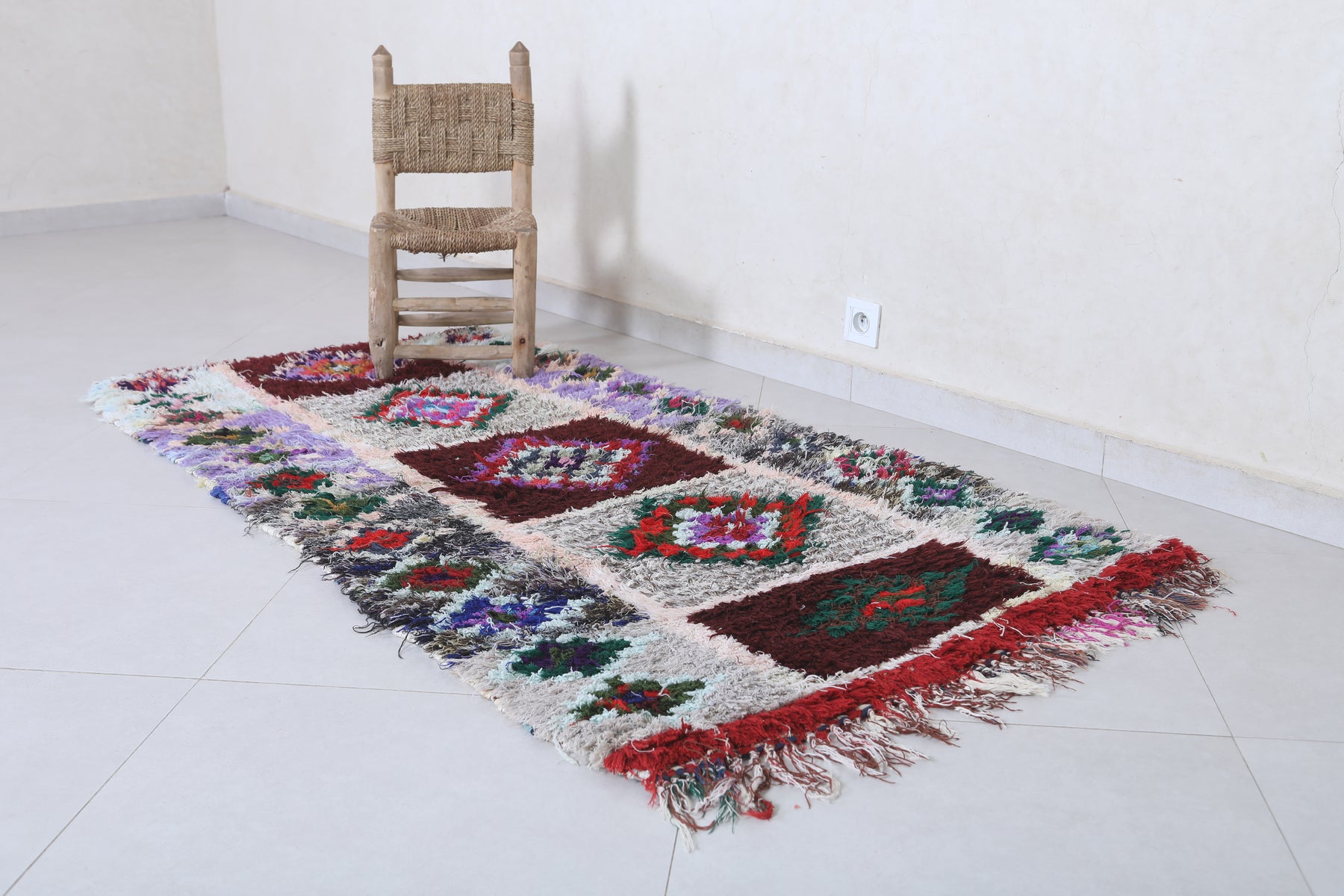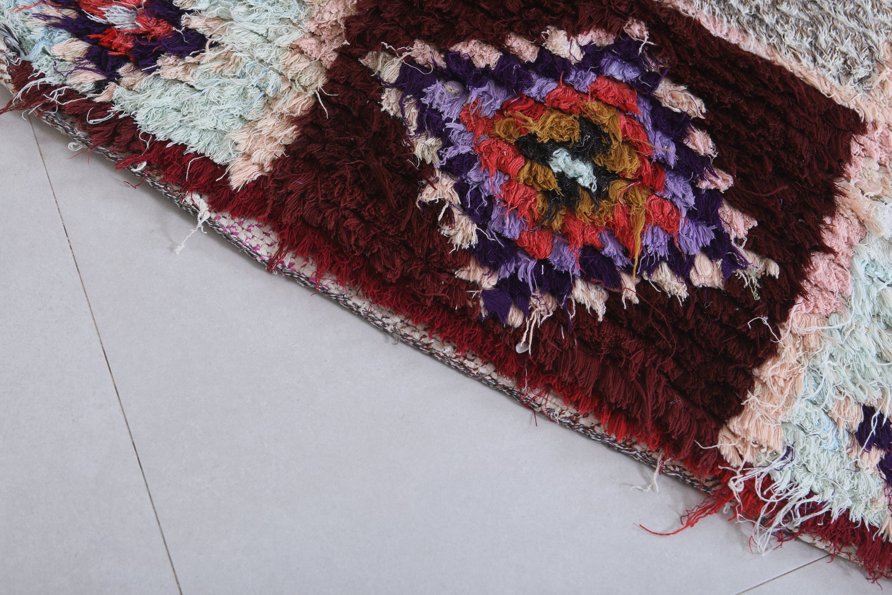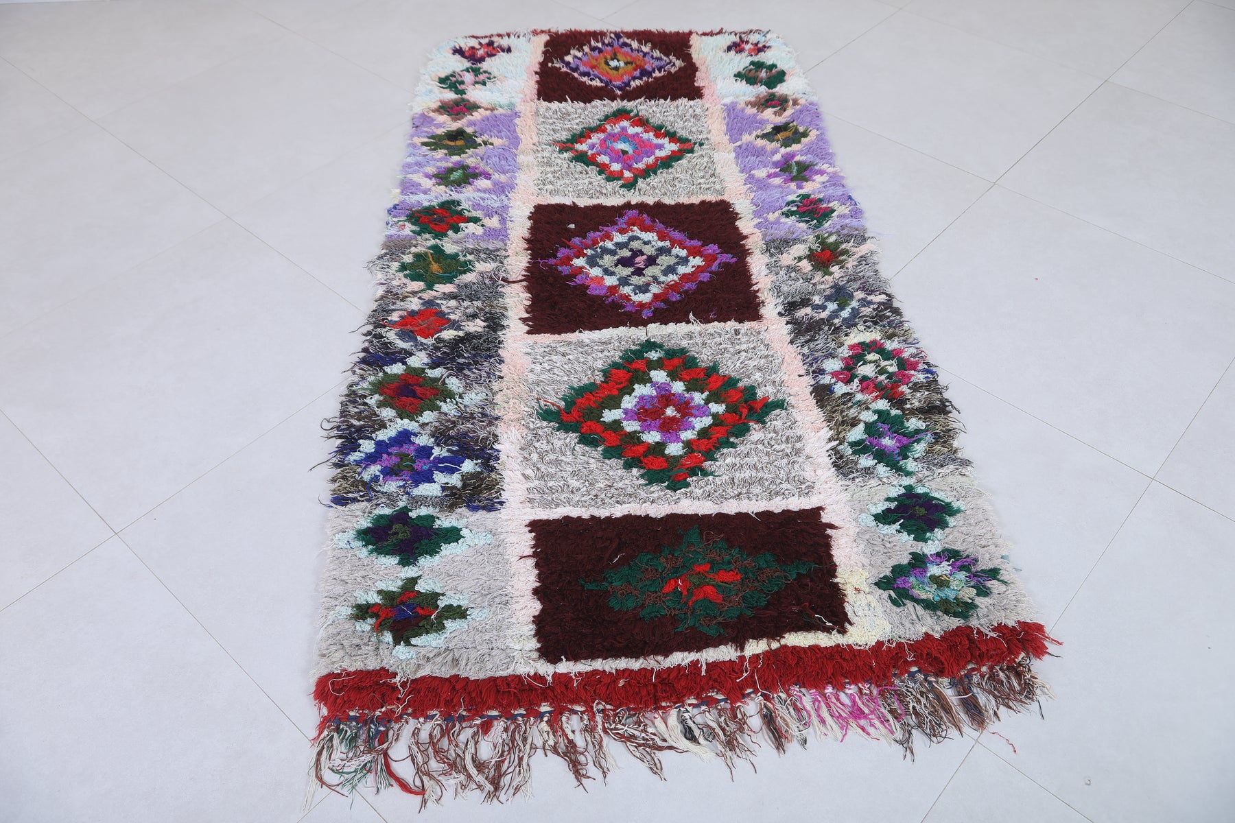 Add a touch of Moroccan artistry with this 3.2 x 6.4 feet Berber rug, featuring a patchwork of intricate diamond and floral motifs in rich hues of burgundy, purple, and green. Crafted with care, this handwoven piece blends tradition with modern aesthetics, making it a timeless statement for your home.