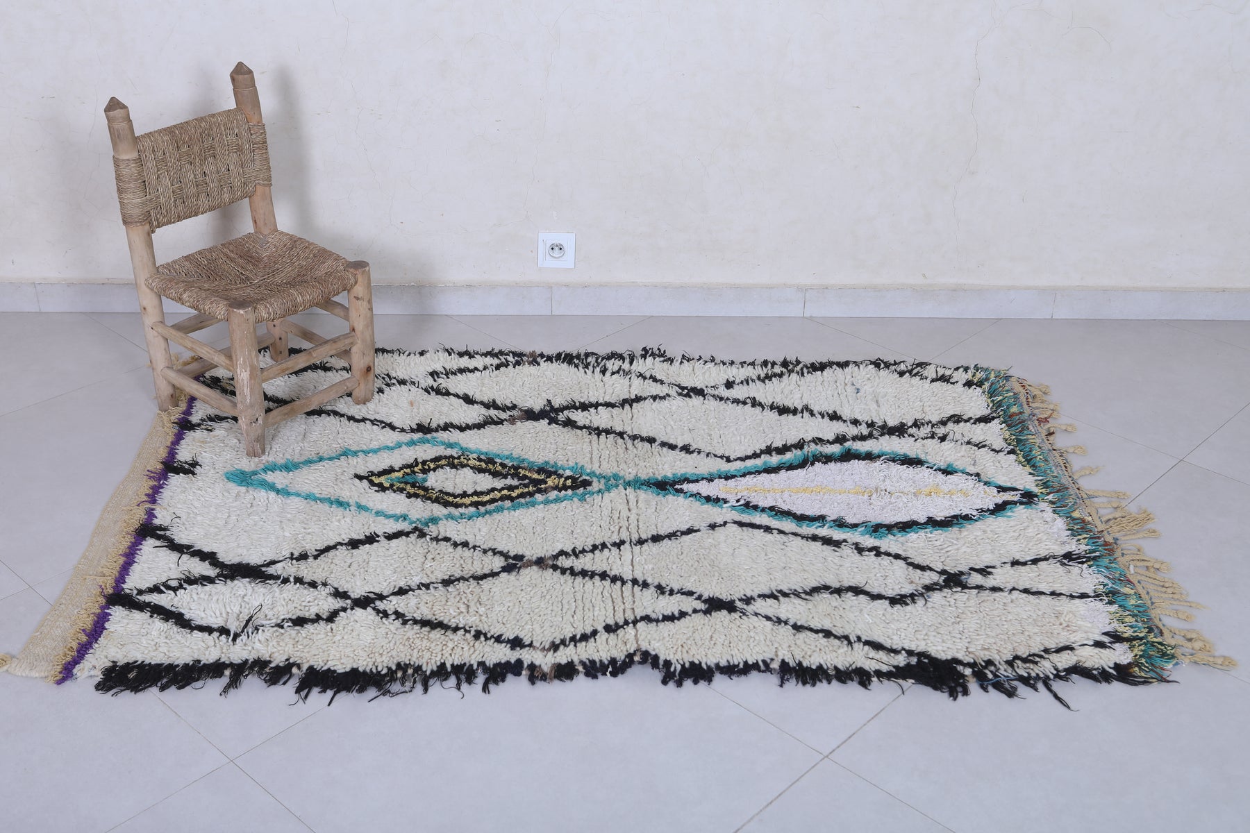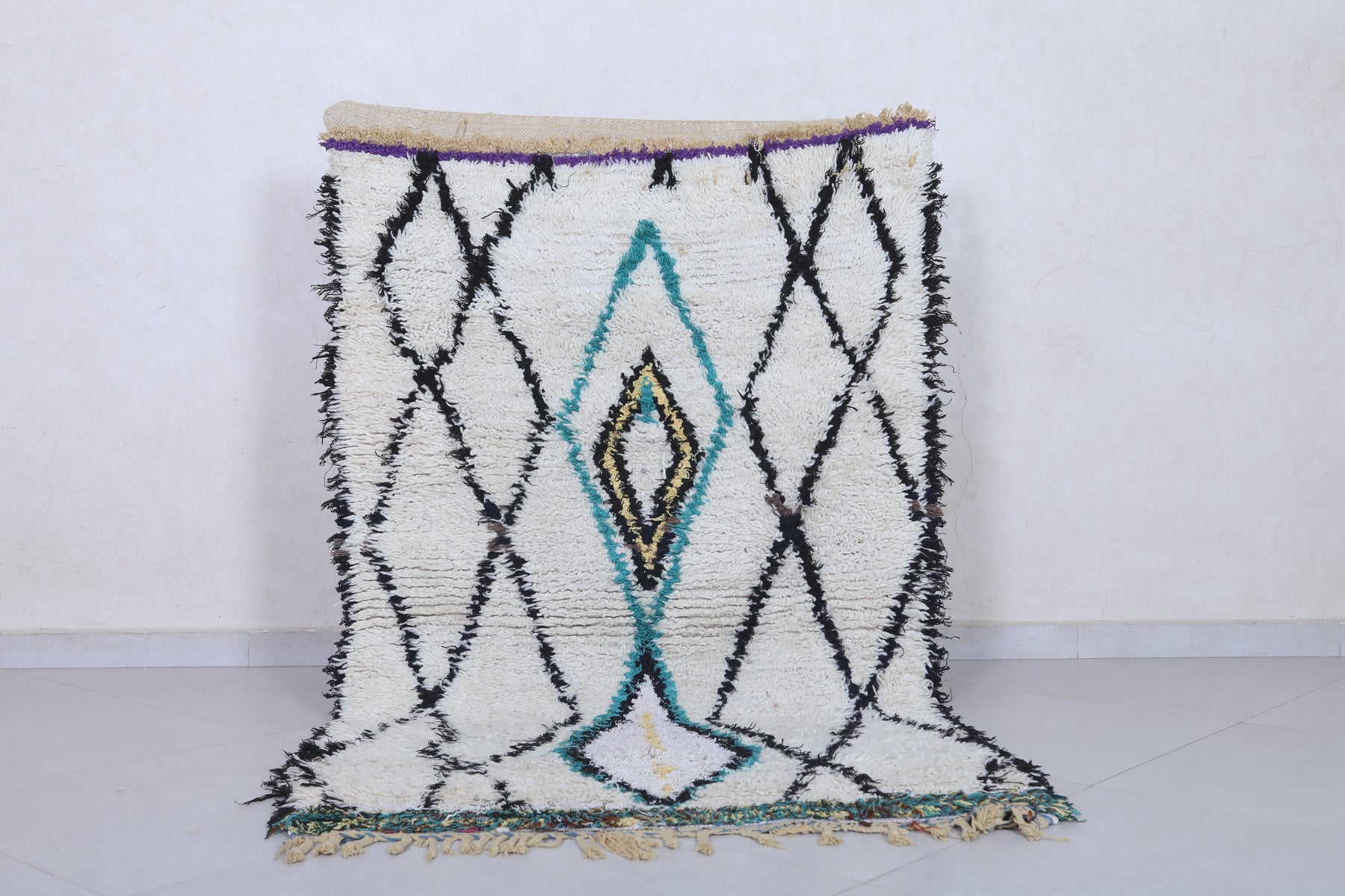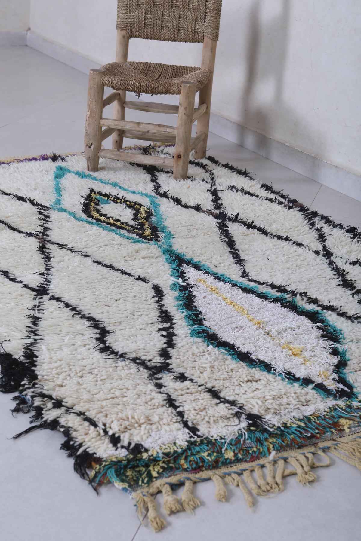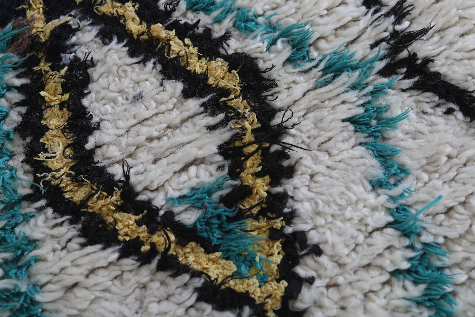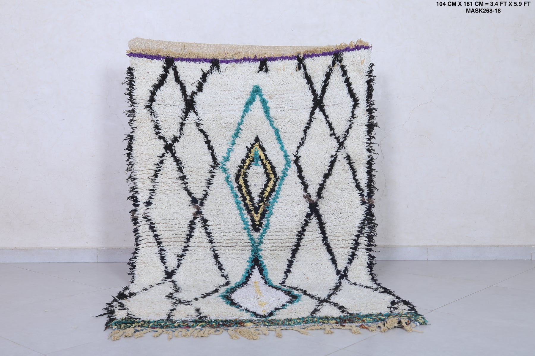 Elevate your décor with this vibrant Moroccan Berber Rug, measuring 3.4 x 5.9 feet. Featuring a bold diamond pattern in striking shades of teal, yellow, and purple, this rug creates a stunning contrast against its neutral background, adding a contemporary twist to traditional Moroccan artistry. Handwoven with precision, it brings warmth and character to any space, from living rooms to bedrooms. Its durable, soft texture makes it a functional yet stylish addition to your home.