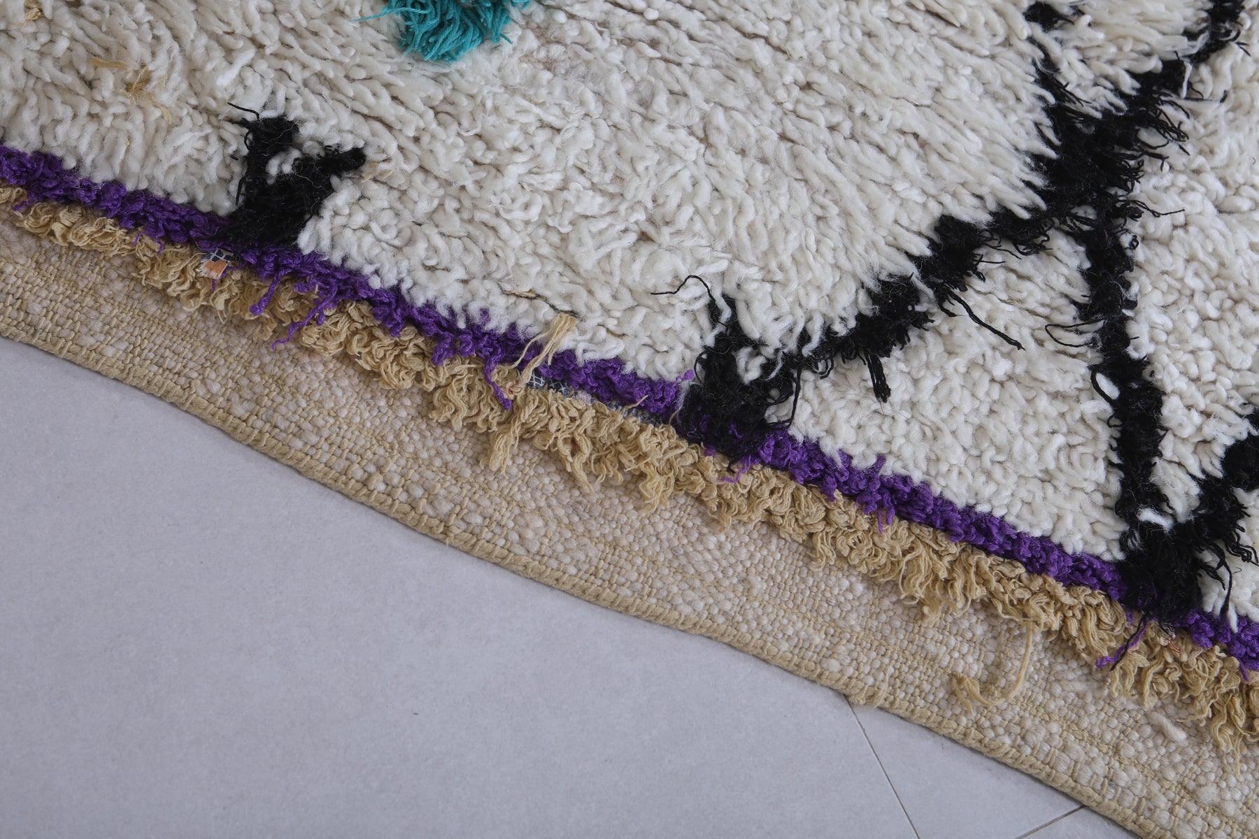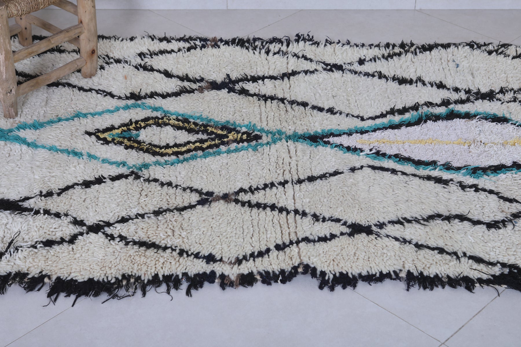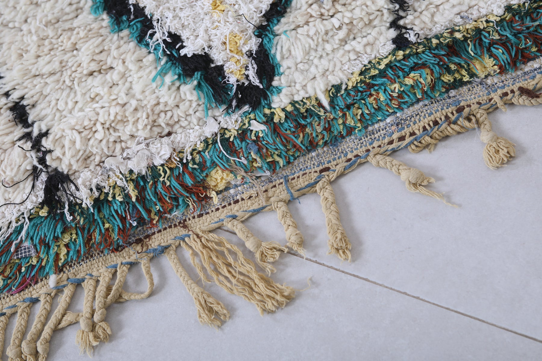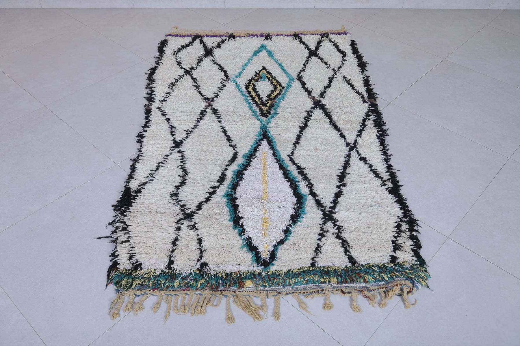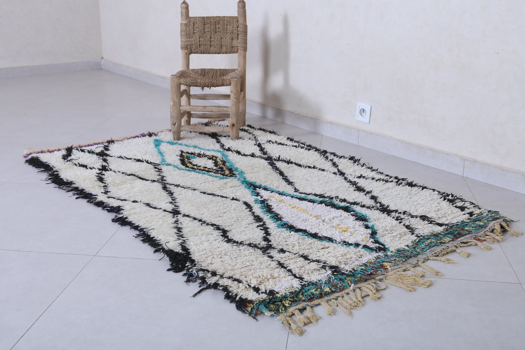 Elevate your décor with this vibrant Moroccan Berber Rug, measuring 3.4 x 5.9 feet. Featuring a bold diamond pattern in striking shades of teal, yellow, and purple, this rug creates a stunning contrast against its neutral background, adding a contemporary twist to traditional Moroccan artistry. Handwoven with precision, it brings warmth and character to any space, from living rooms to bedrooms. Its durable, soft texture makes it a functional yet stylish addition to your home.