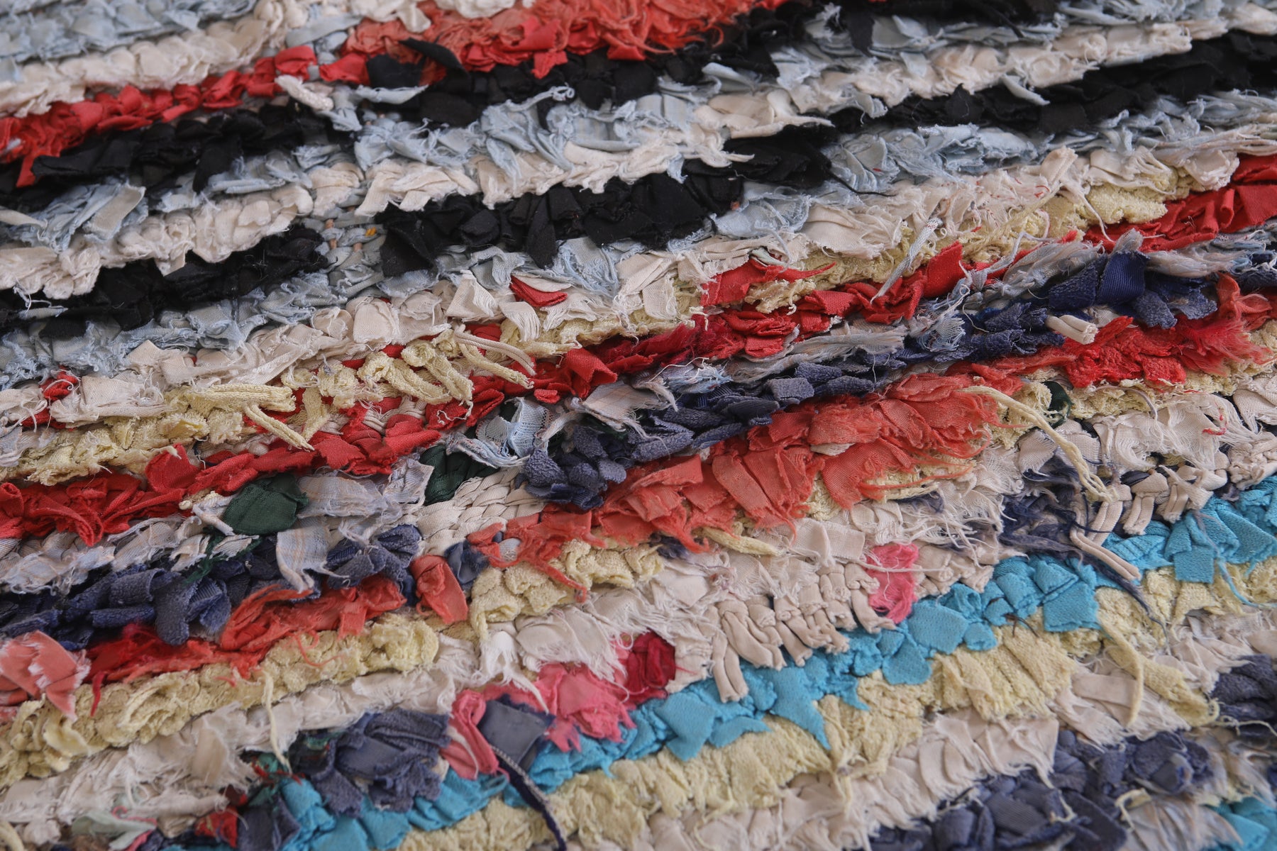 Transform your space with this 3 x 5.3 feet Moroccan Berber rug, showcasing a vibrant array of multicolored stripes. The horizontal bands feature a mix of blue, red, black, and pastel hues, offering a playful yet stylish design perfect for modern or bohemian interiors. Handcrafted with care, this rug combines durability with softness, making it an ideal choice for living rooms, bedrooms, or cozy reading nooks. Its bold pattern and lively colors create a cheerful ambiance, effortlessly enhancing your home decor. A unique piece to brighten any setting.