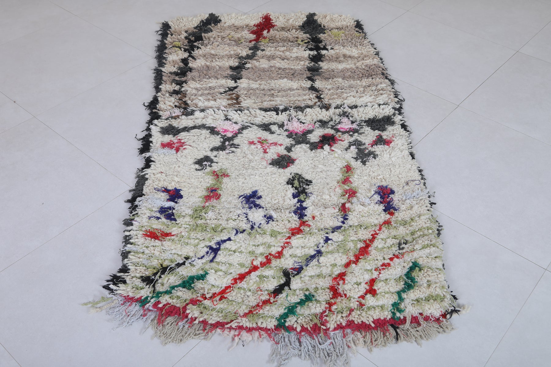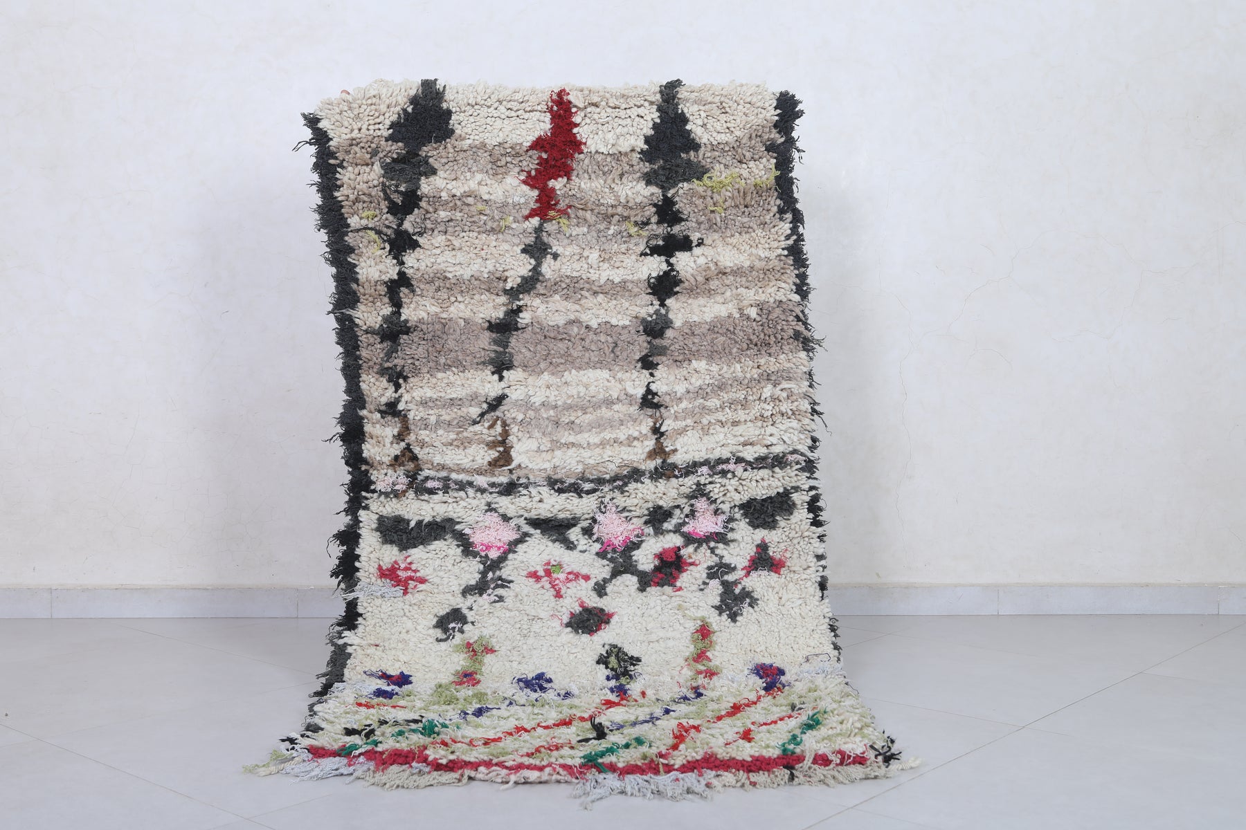 Elevate your space with this 3 x 5.8 feet Moroccan Berber rug, featuring a harmonious blend of earthy neutrals and vibrant floral motifs. The upper section showcases soft beige, brown, and black tones, while the lower section bursts into colorful red, green, and blue floral details. This artistic contrast creates a striking visual appeal, blending traditional craftsmanship with modern aesthetics.