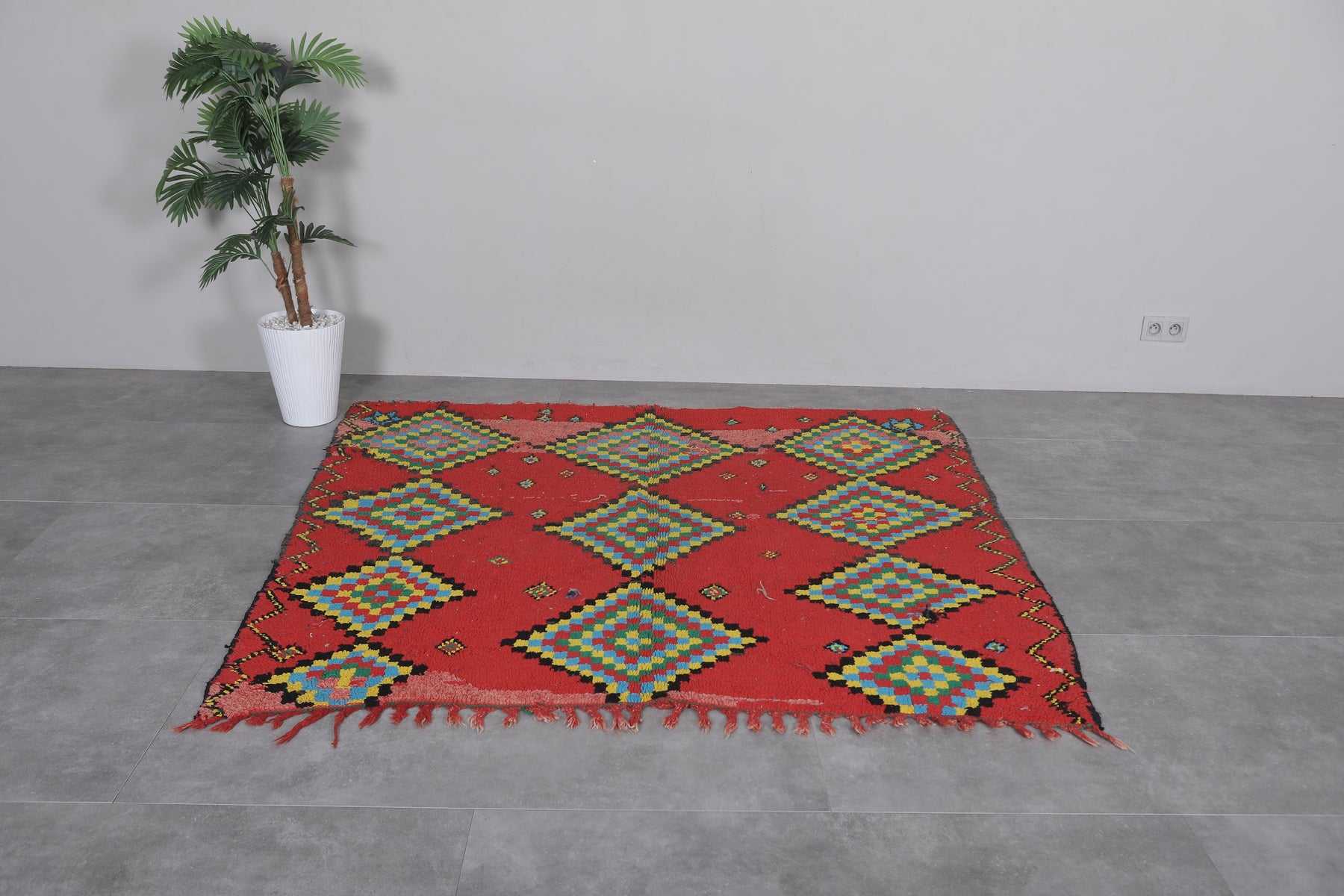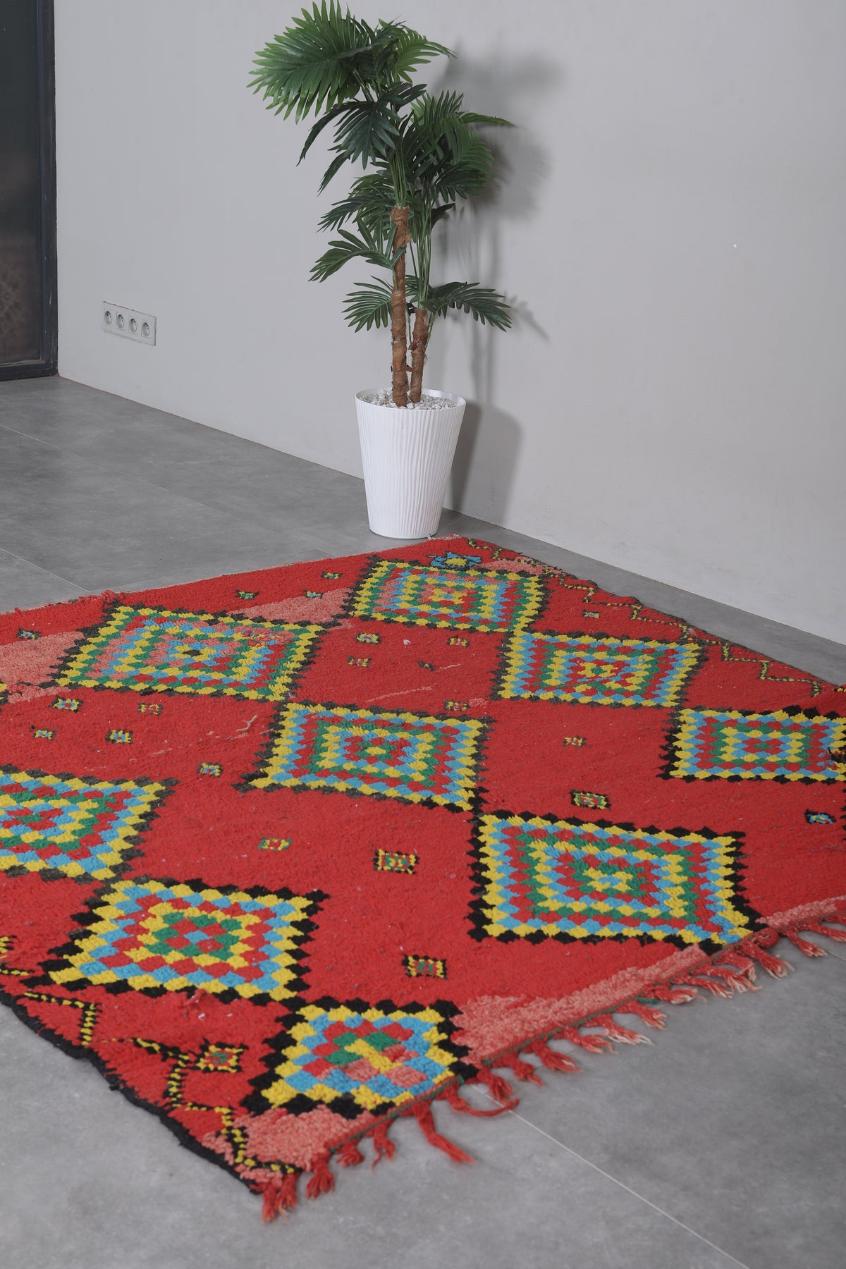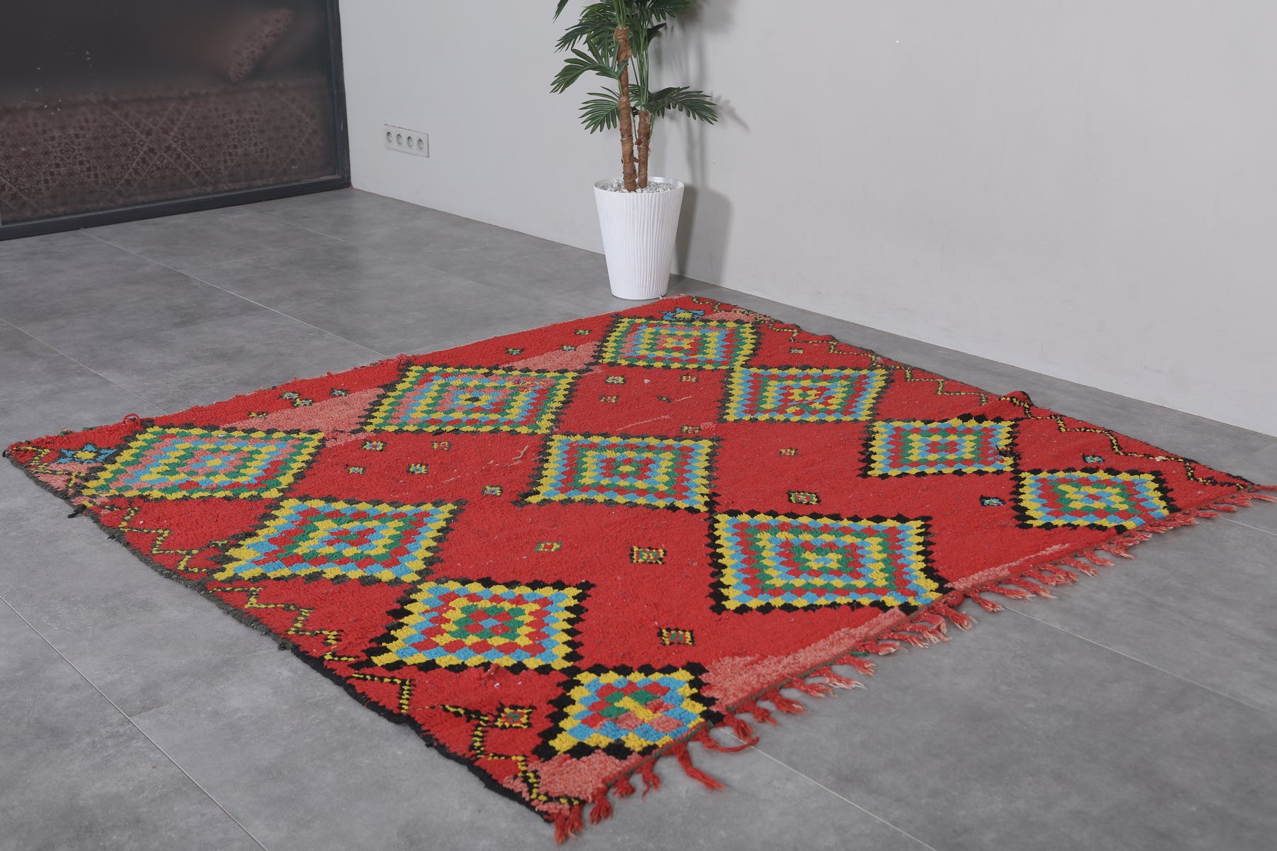 Enhance your space with this handmade Moroccan wool rug, measuring 5.6 FT x 6.1 FT. Featuring a bold red background with intricate geometric patterns in vibrant colors, this rug is a statement piece for any room. Its high-quality wool construction ensures durability and softness, making it perfect for living rooms, dining areas, or bedrooms. Bring a touch of Moroccan heritage and artisanal craftsmanship into your home with this uniquely designed wool rug.