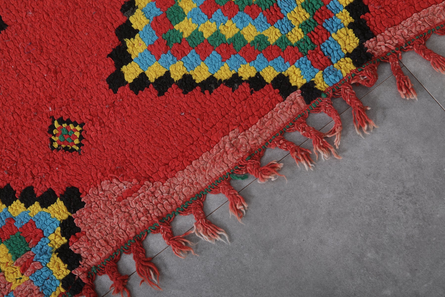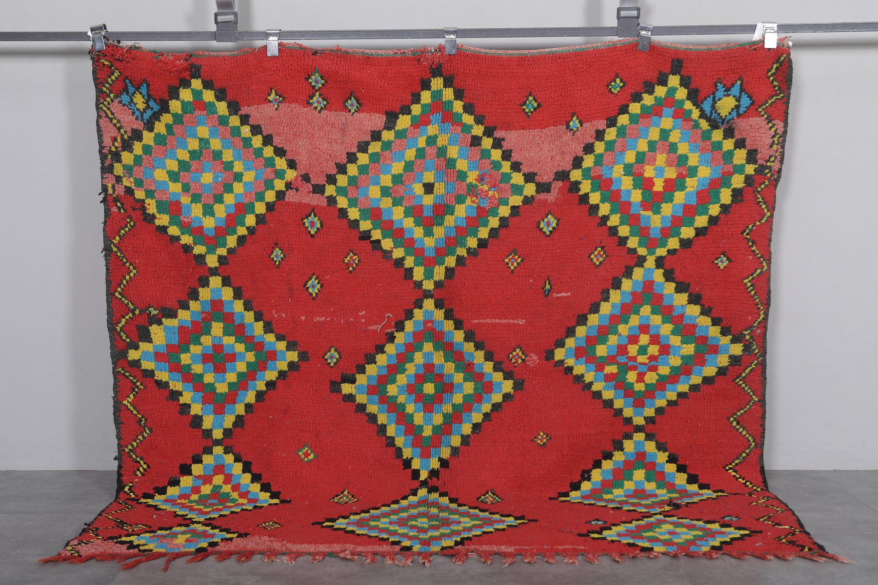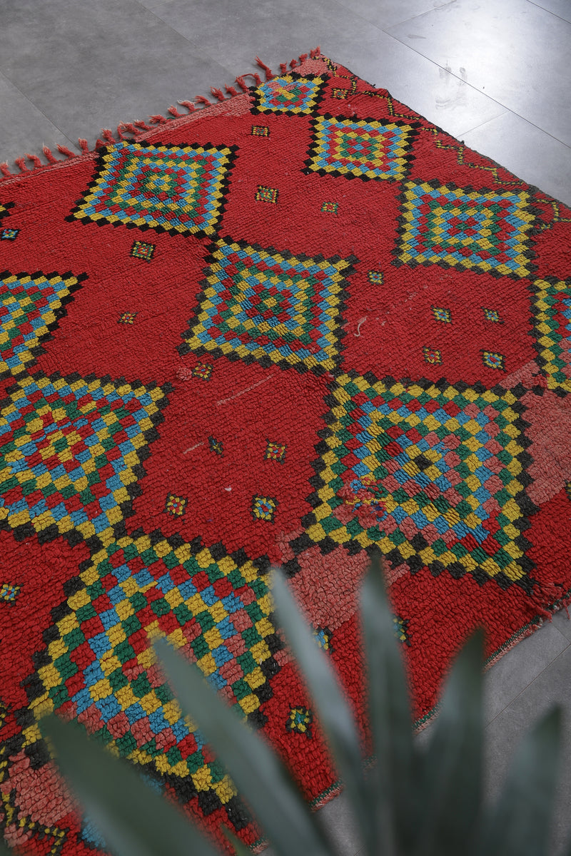 Enhance your space with this handmade Moroccan wool rug, measuring 5.6 FT x 6.1 FT. Featuring a bold red background with intricate geometric patterns in vibrant colors, this rug is a statement piece for any room. Its high-quality wool construction ensures durability and softness, making it perfect for living rooms, dining areas, or bedrooms. Bring a touch of Moroccan heritage and artisanal craftsmanship into your home with this uniquely designed wool rug.